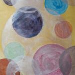Obraz Doroty Ratajczak. Inspiracją były bańki oglądane w czasie dziecięcej zabawy w promieniach słońca. Obraz niezwykle radosny, z kilkoma przenikającymi się planami. Akryl na płótnie. Boki obrazu są pomalowane kolorem białym.