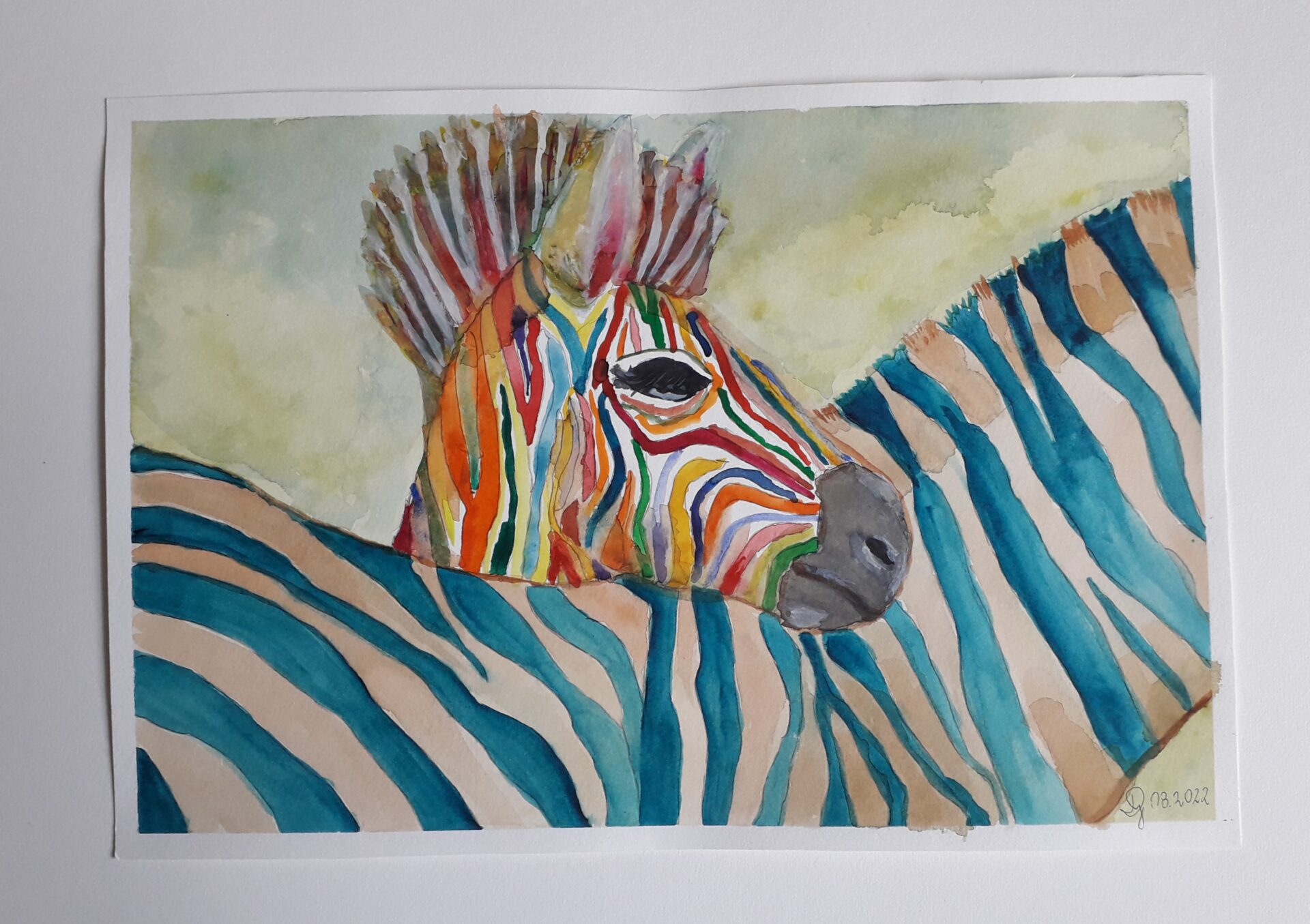 Kolorowe zebry. Akwarela na bawełnianym papierze o gramaturze 300 g. Papier w rozmiarze 40 x 27 cm . Obszar pracy 38 x 25,5 cm. Idealna do pokoju dziecka. koszt wysyłki ok. 20 zł ( kurier lub paczkomat)