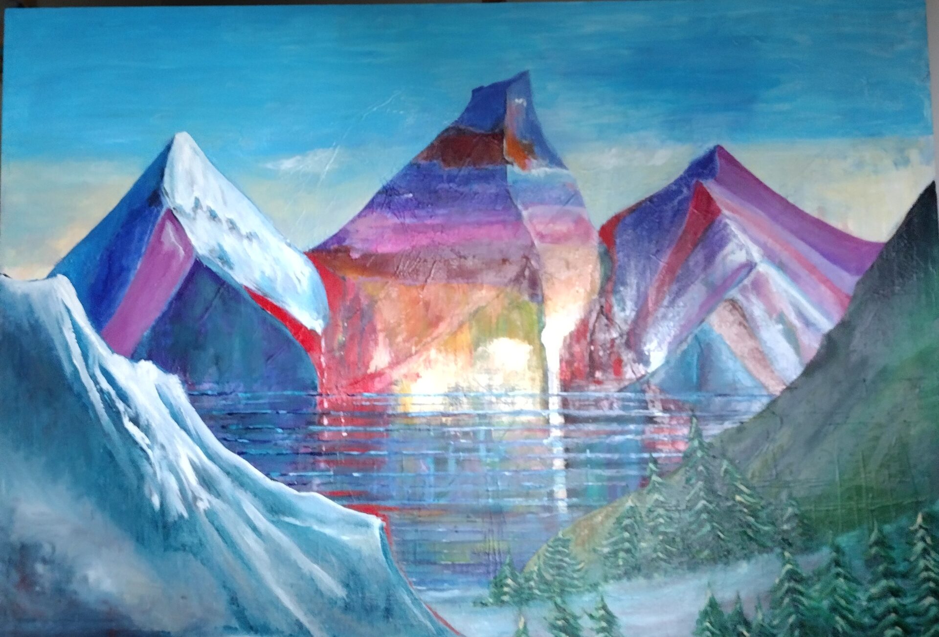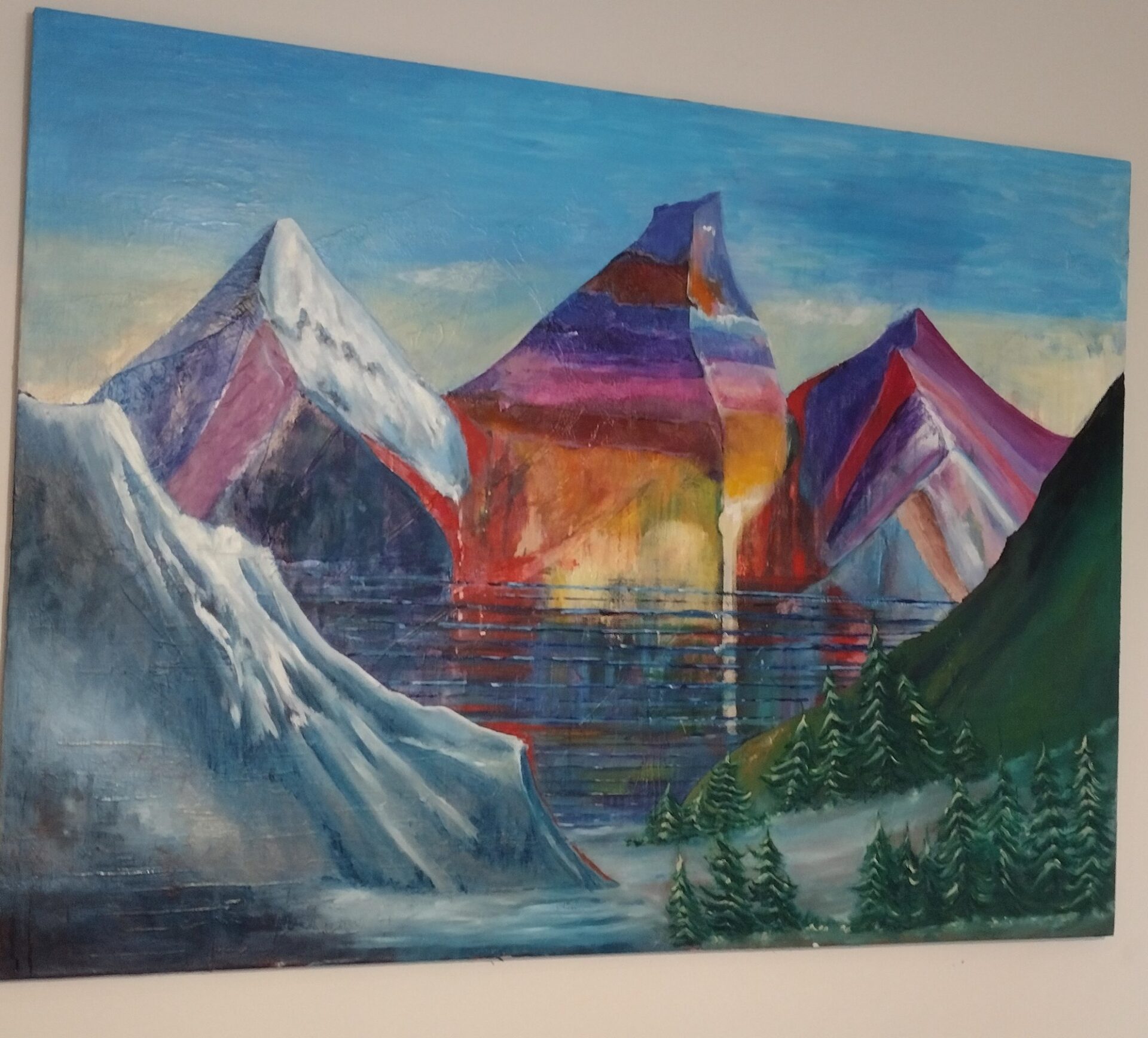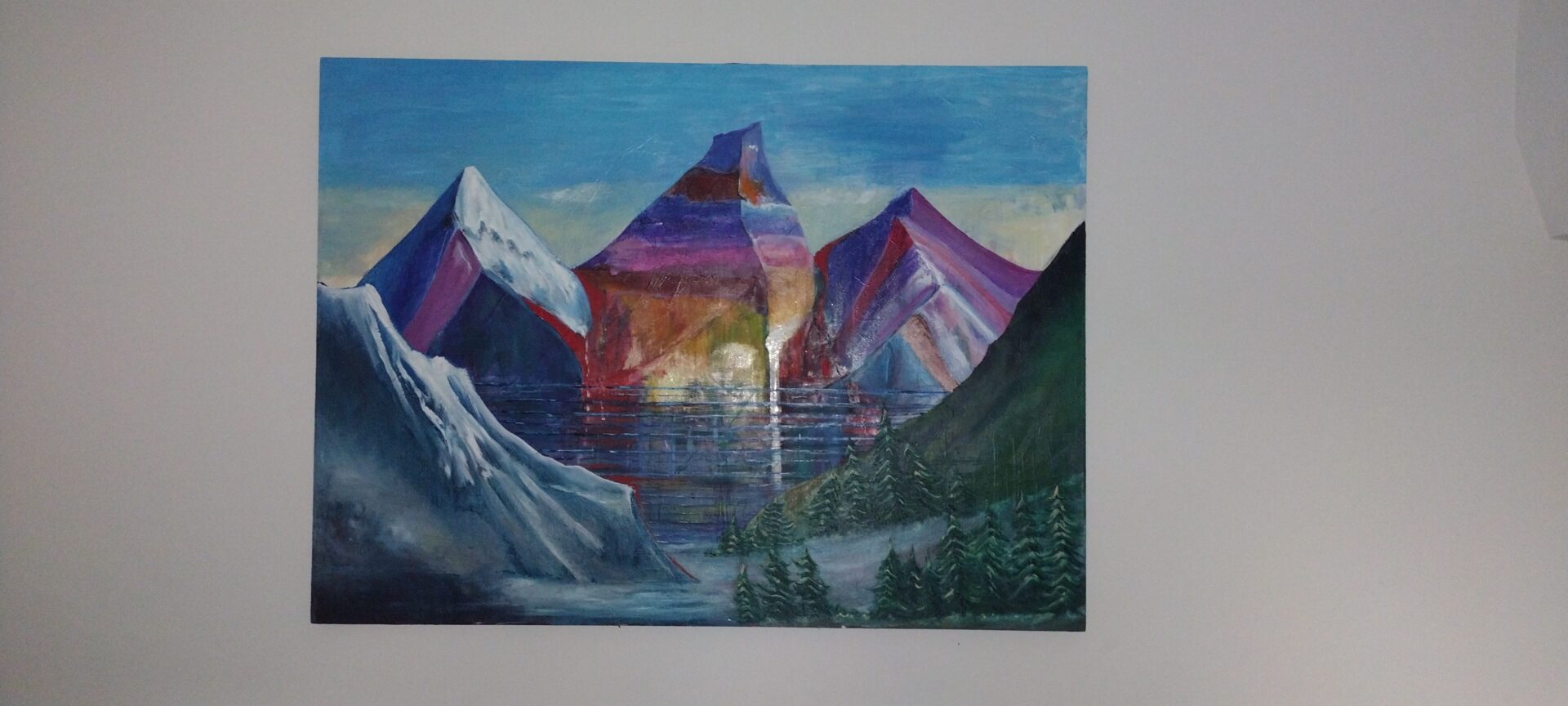 To obraz olejny na podobraziu płóciennym z motywem gór .Kolory i warstwy każdy interpretuje indywidualnie .Obraz jest duży ,jego rozmiar to 150 cm x 110 cm,boki zamalowane w tonacji obrazu stanowią jego kontynuację ,nie wymaga oprawy .