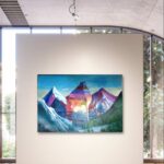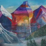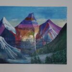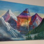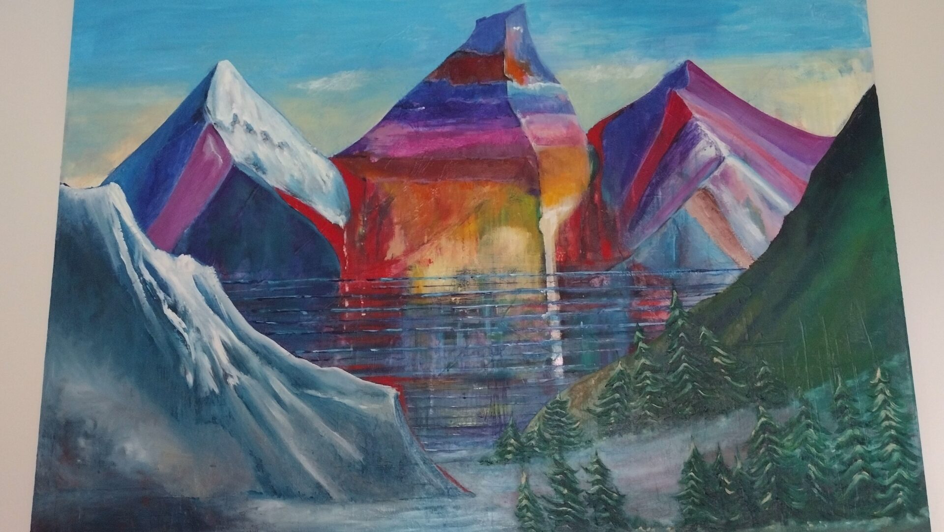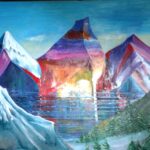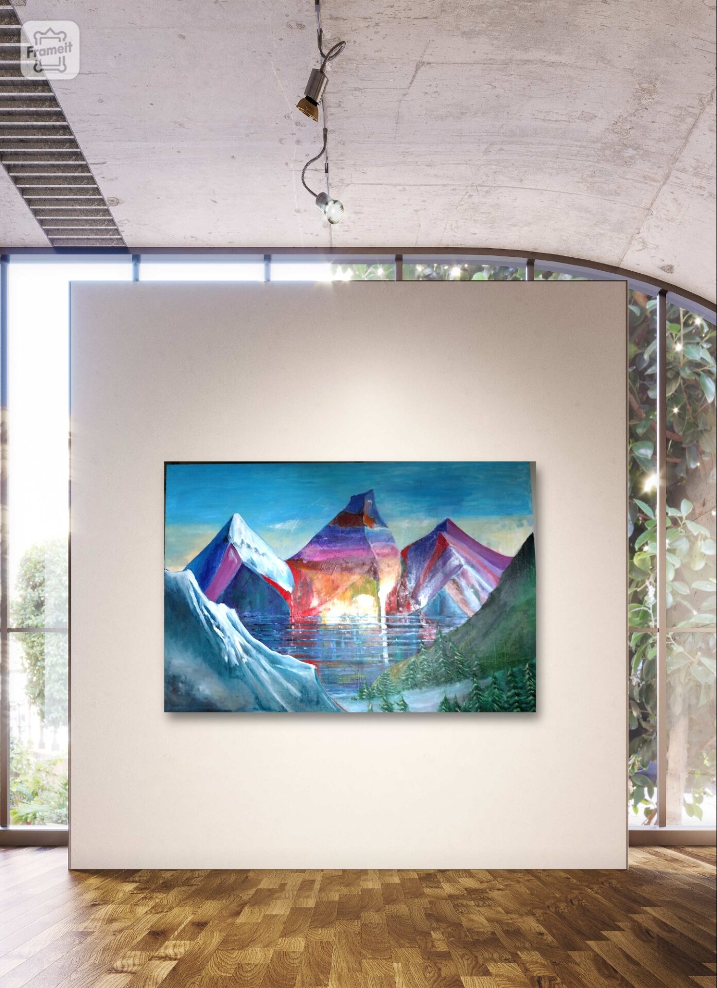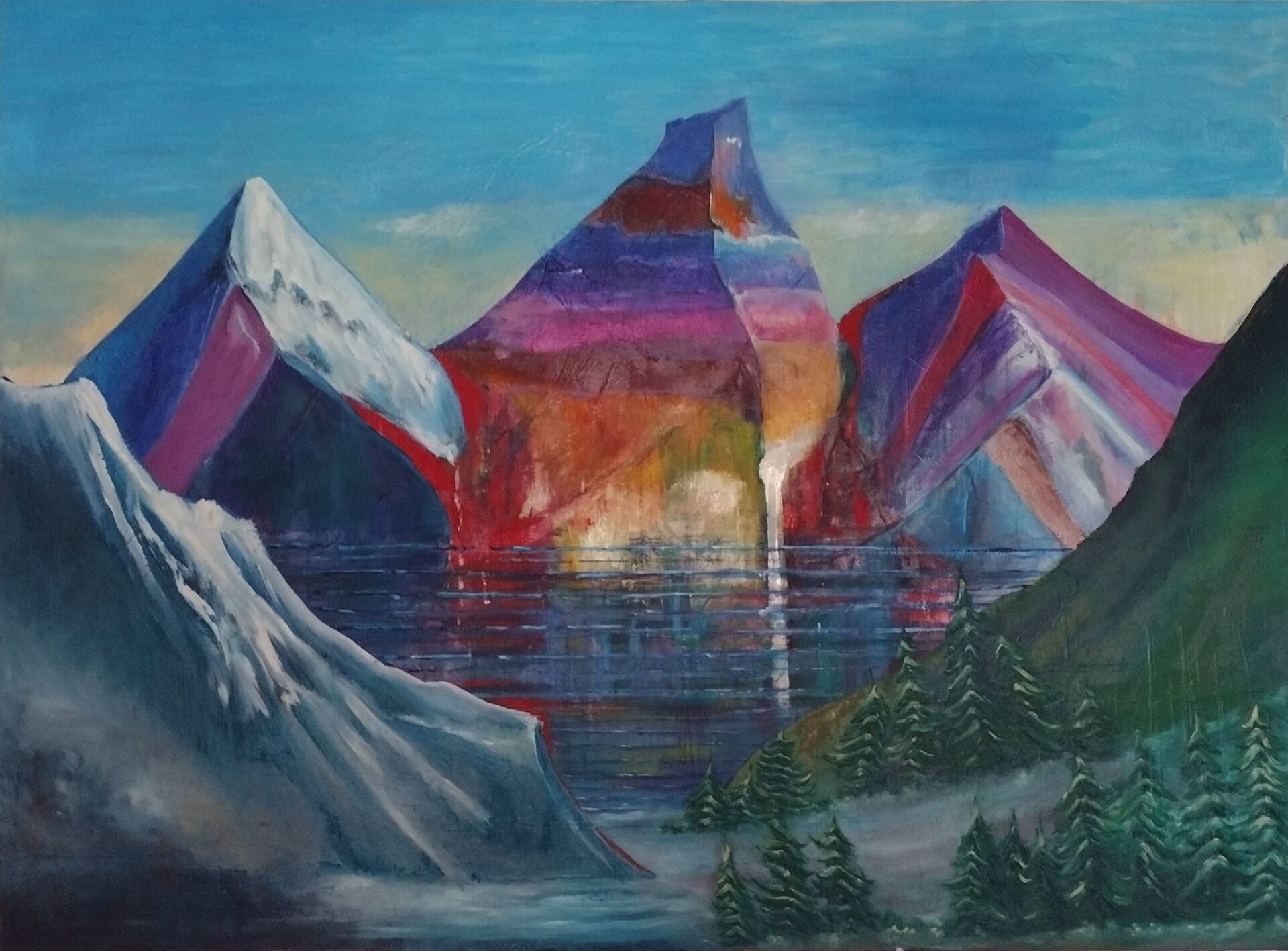 To obraz olejny na podobraziu płóciennym z motywem gór .Kolory i warstwy każdy interpretuje indywidualnie .Obraz jest duży ,jego rozmiar to 150 cm x 110 cm,boki zamalowane w tonacji obrazu stanowią jego kontynuację ,nie wymaga oprawy .