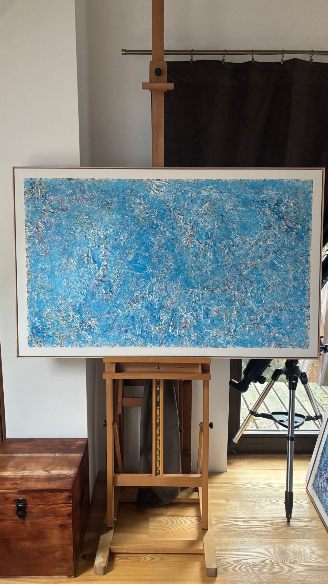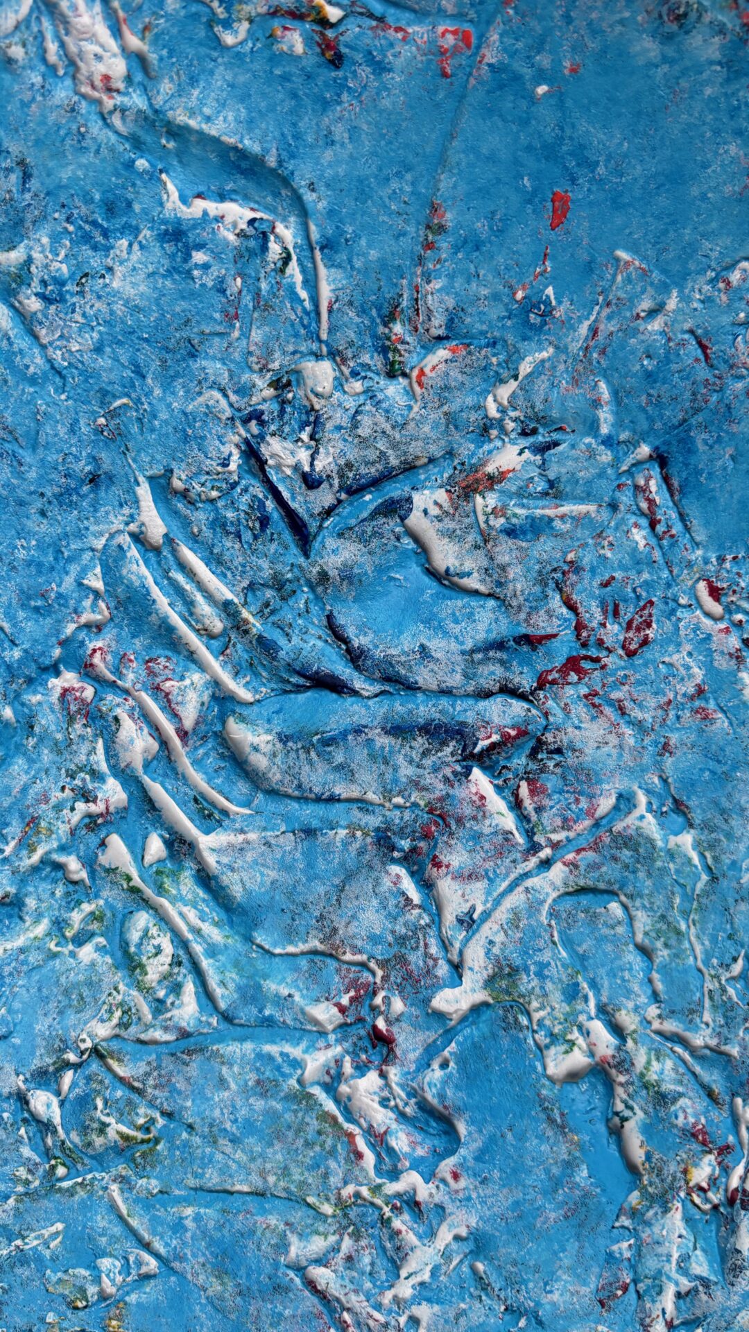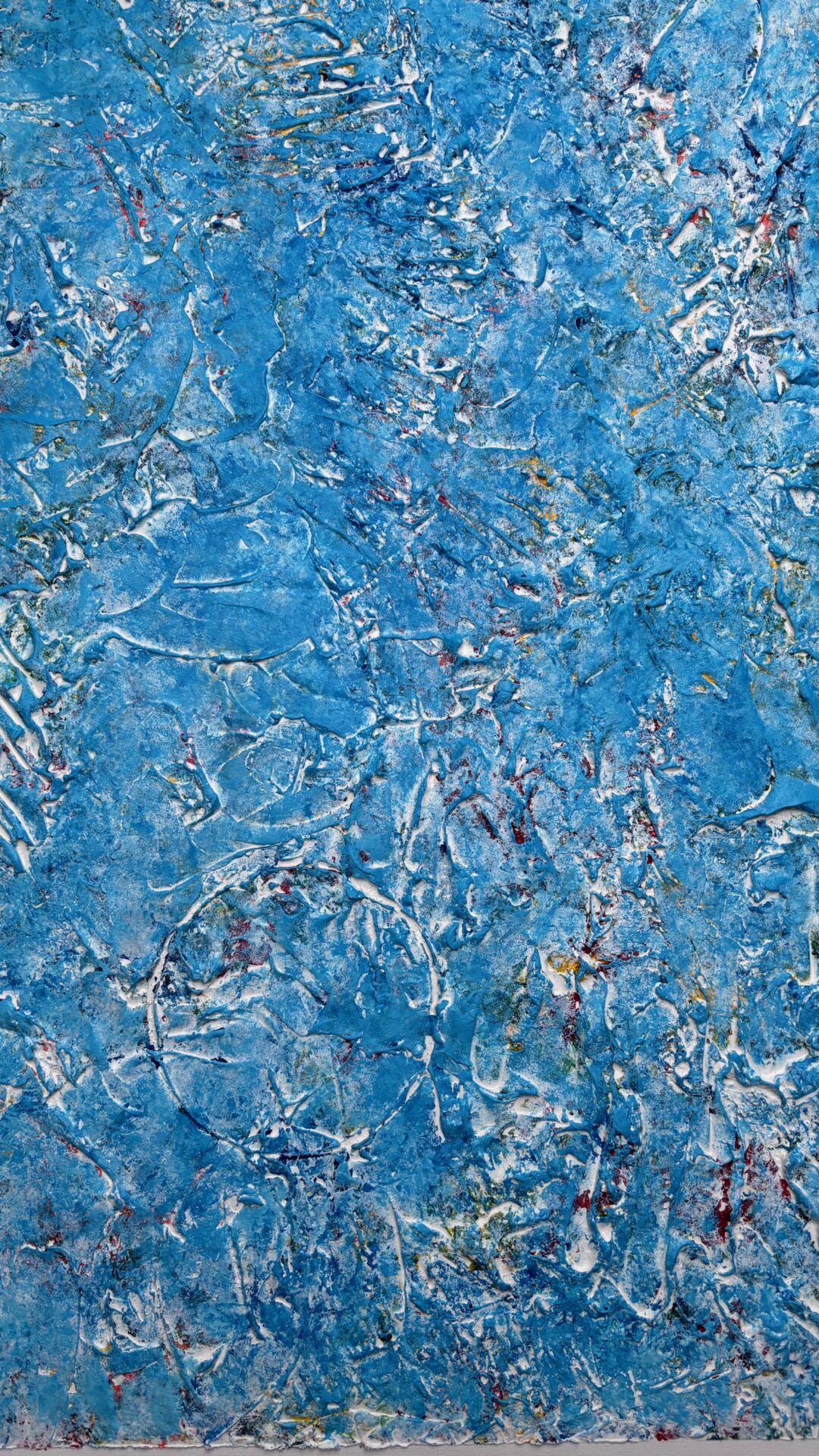 Obraz abstrakcyjny na strukturalnym tle. Oprawiony w ramę, akryl na płótnie, zabezpieczony werniksem.