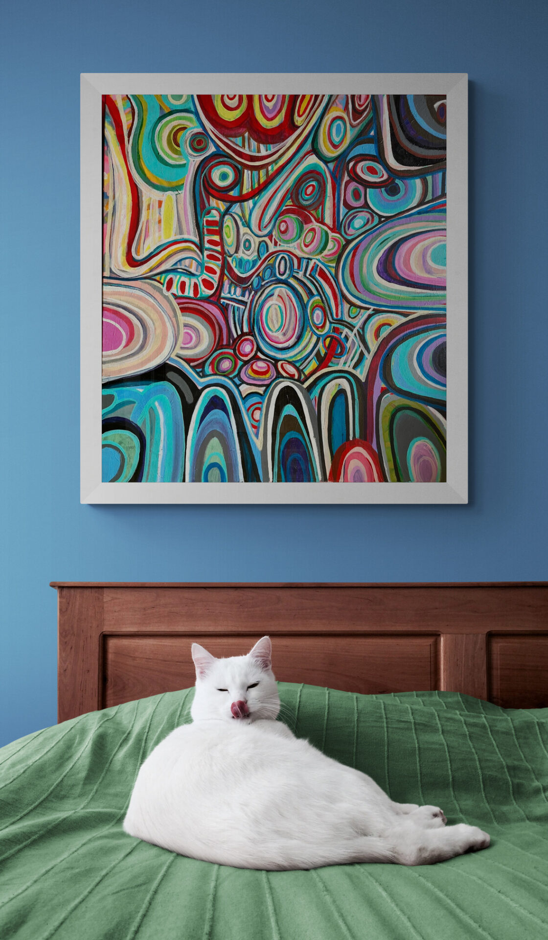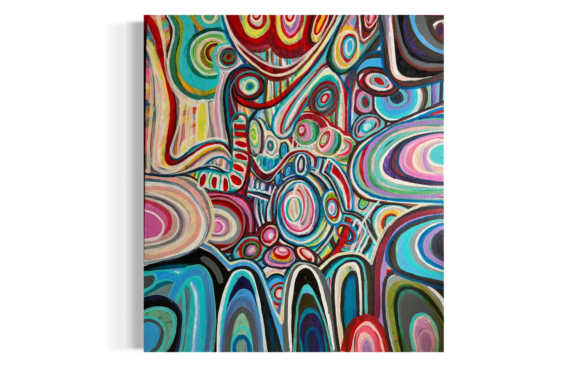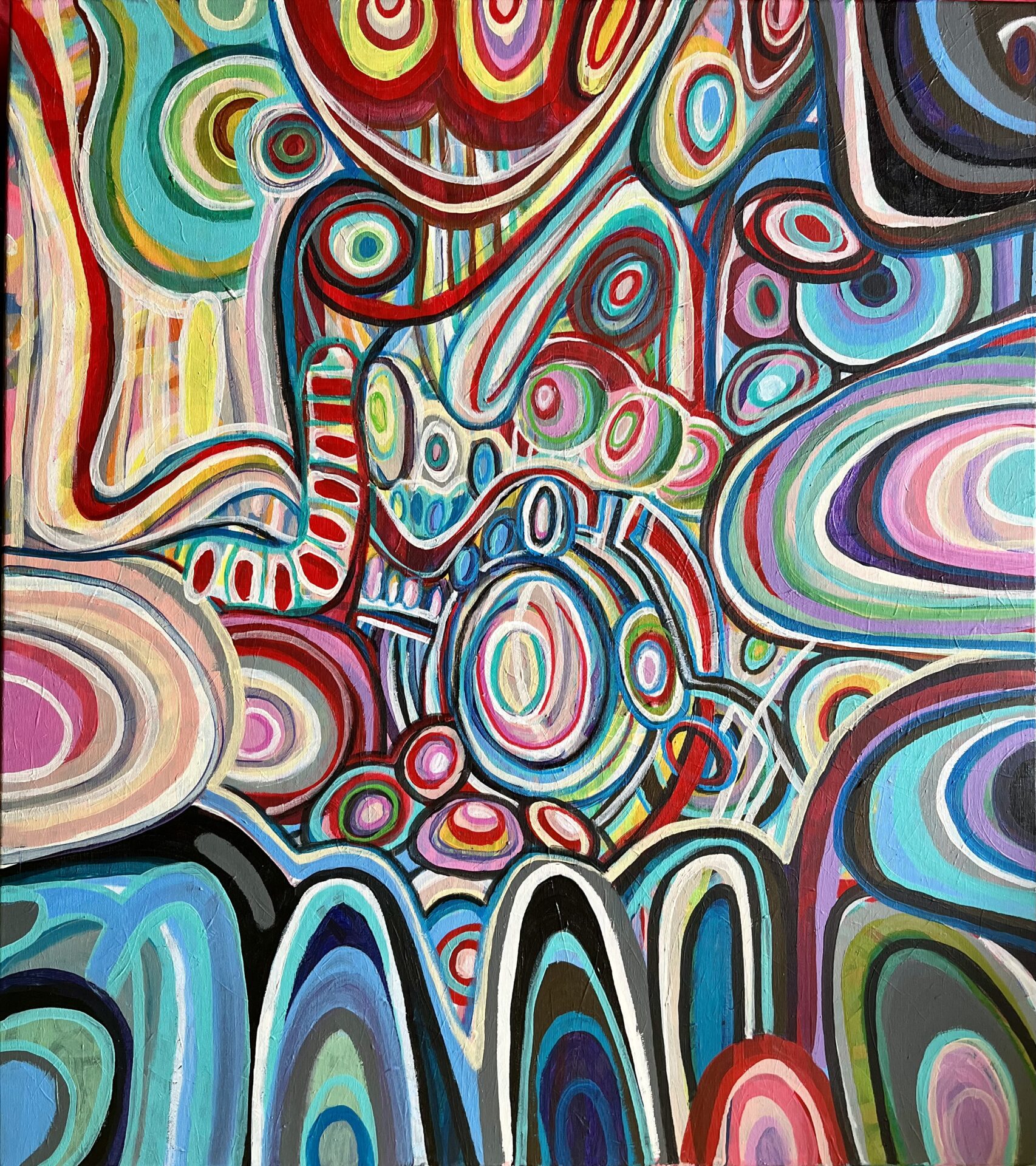 Duży obraz abstrakcyjny, który namalowałam w 2024 roku ma wymiary 80×90 cm. Namalowałam go farbami akrylowymi na podobraziu płóciennym.