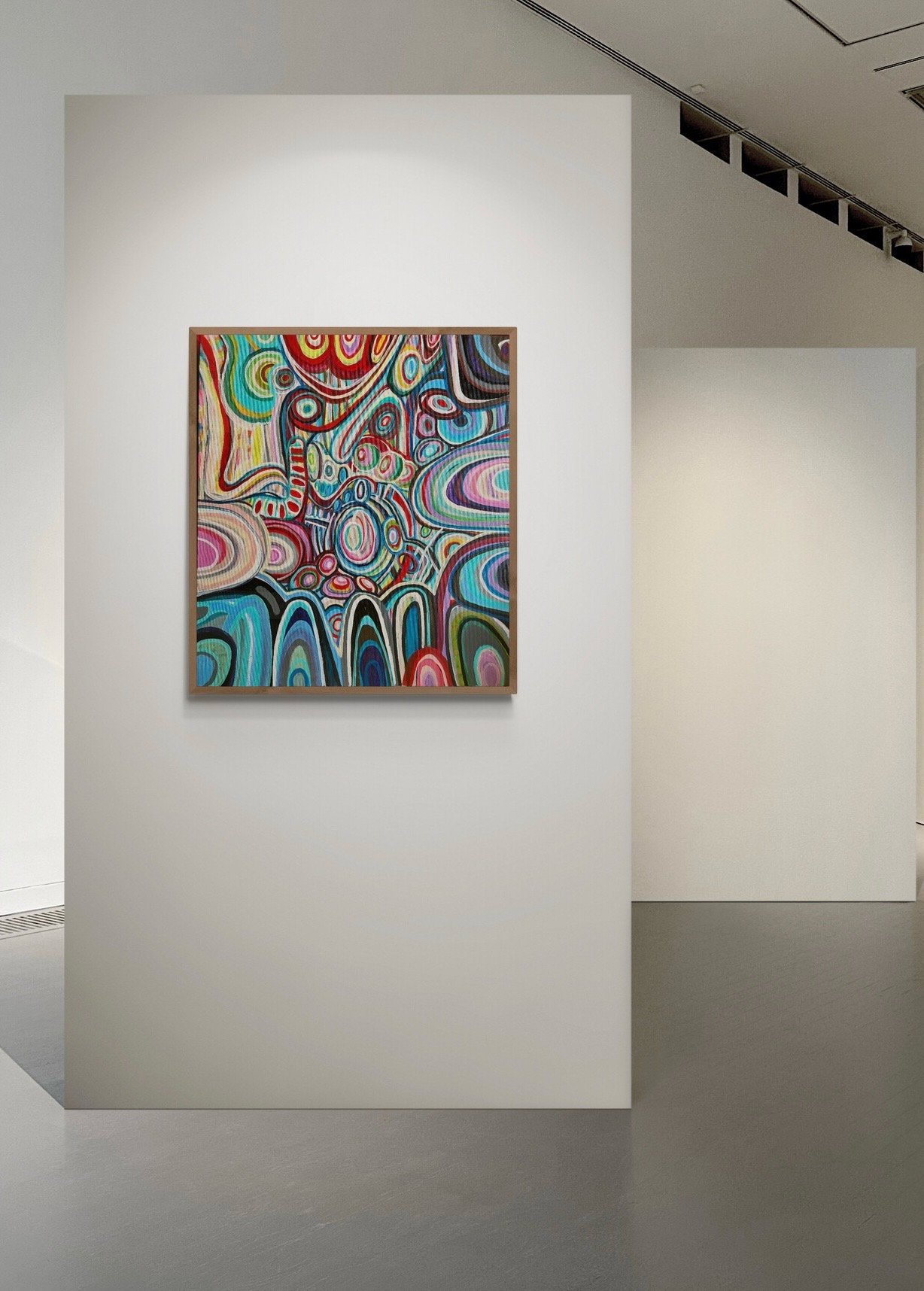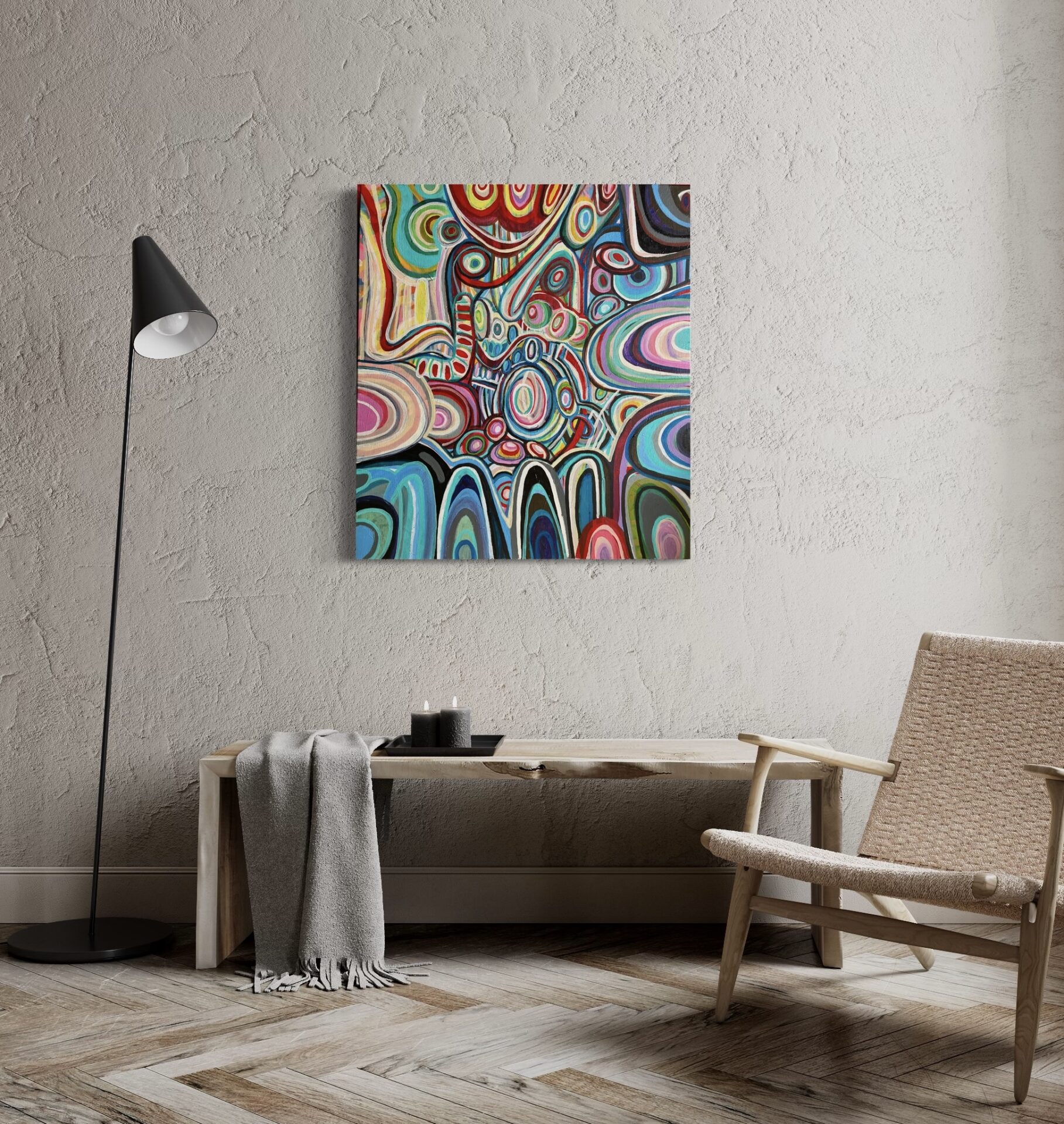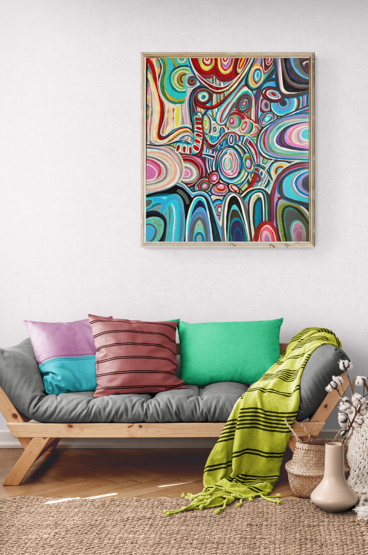 Duży obraz abstrakcyjny, który namalowałam w 2024 roku ma wymiary 80×90 cm. Namalowałam go farbami akrylowymi na podobraziu płóciennym.