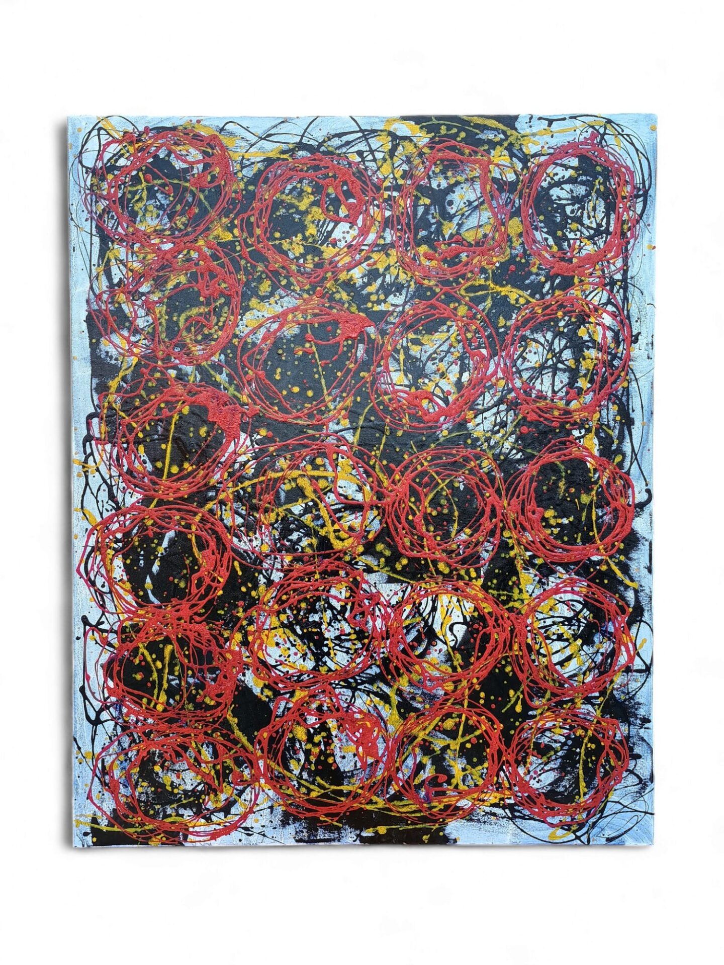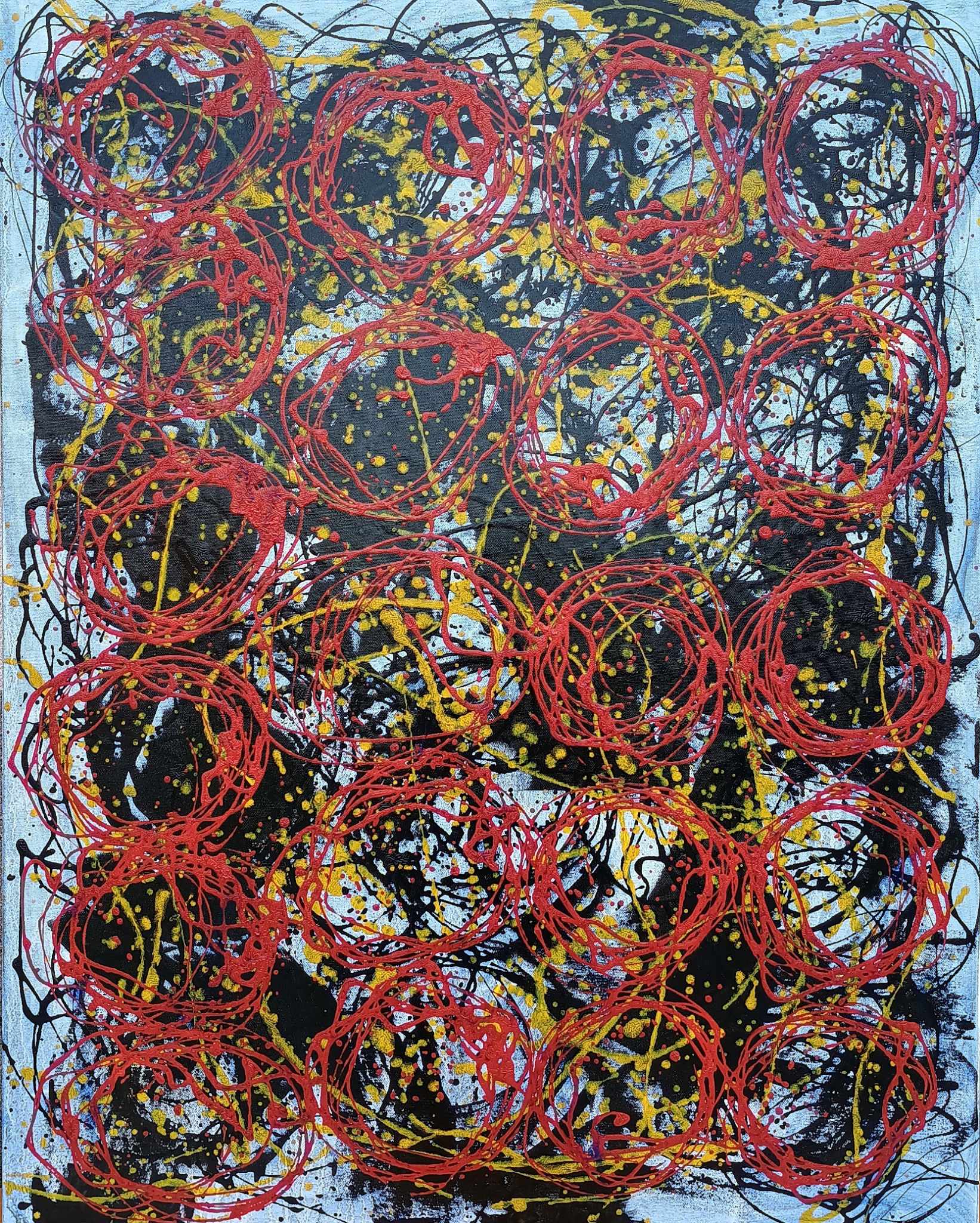 Obraz powstał w nawiązaniu do moich prac z 2018 roku, kiedy tworzyłam również Kompozycje muzyczne. Plątanina z farby działa na zmysły i kojarzy mi się z dźwiękami i muzyką. Temat nieprzedstawiający nic z góry nie narzuca odbiorcy. Można się cieszyć barwą, fakturą i swobodą odbioru.