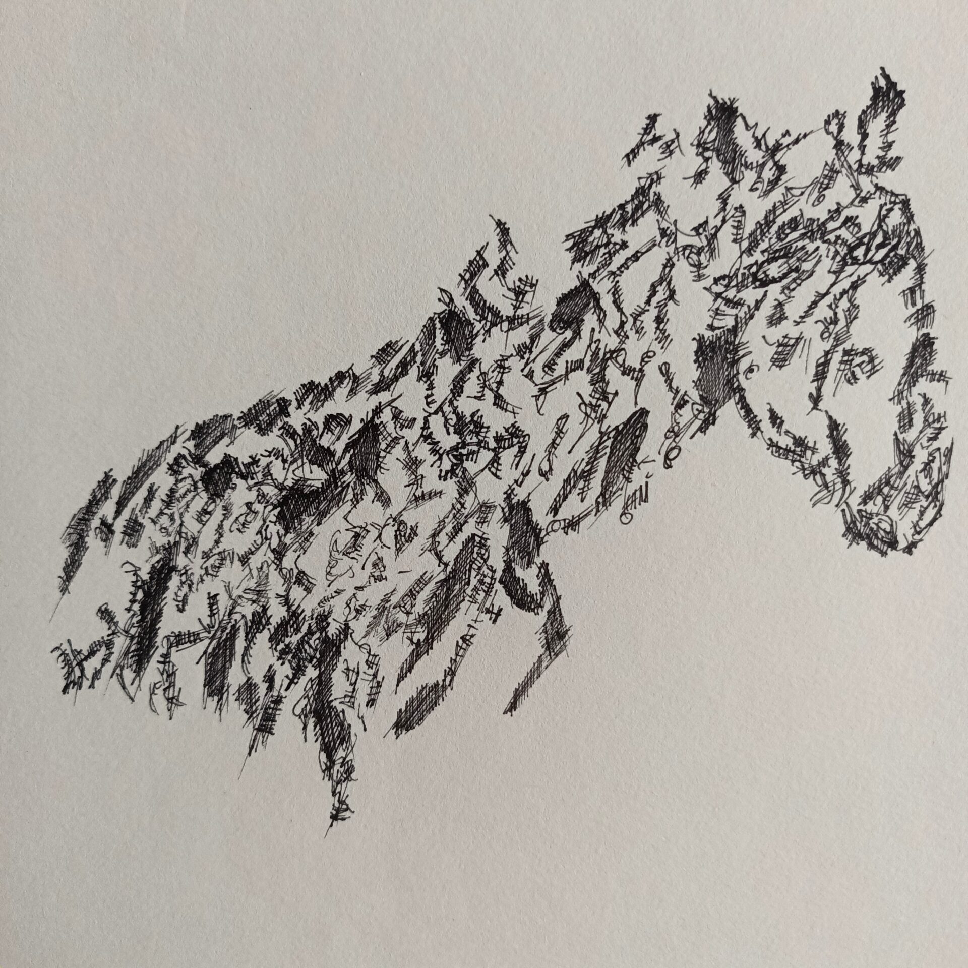 Rysunek przedstawia abstrakcyjny wizerunek konia, stworzony przy użyciu drobnych precyzyjnych kresek wykonanych czarnym piórem.