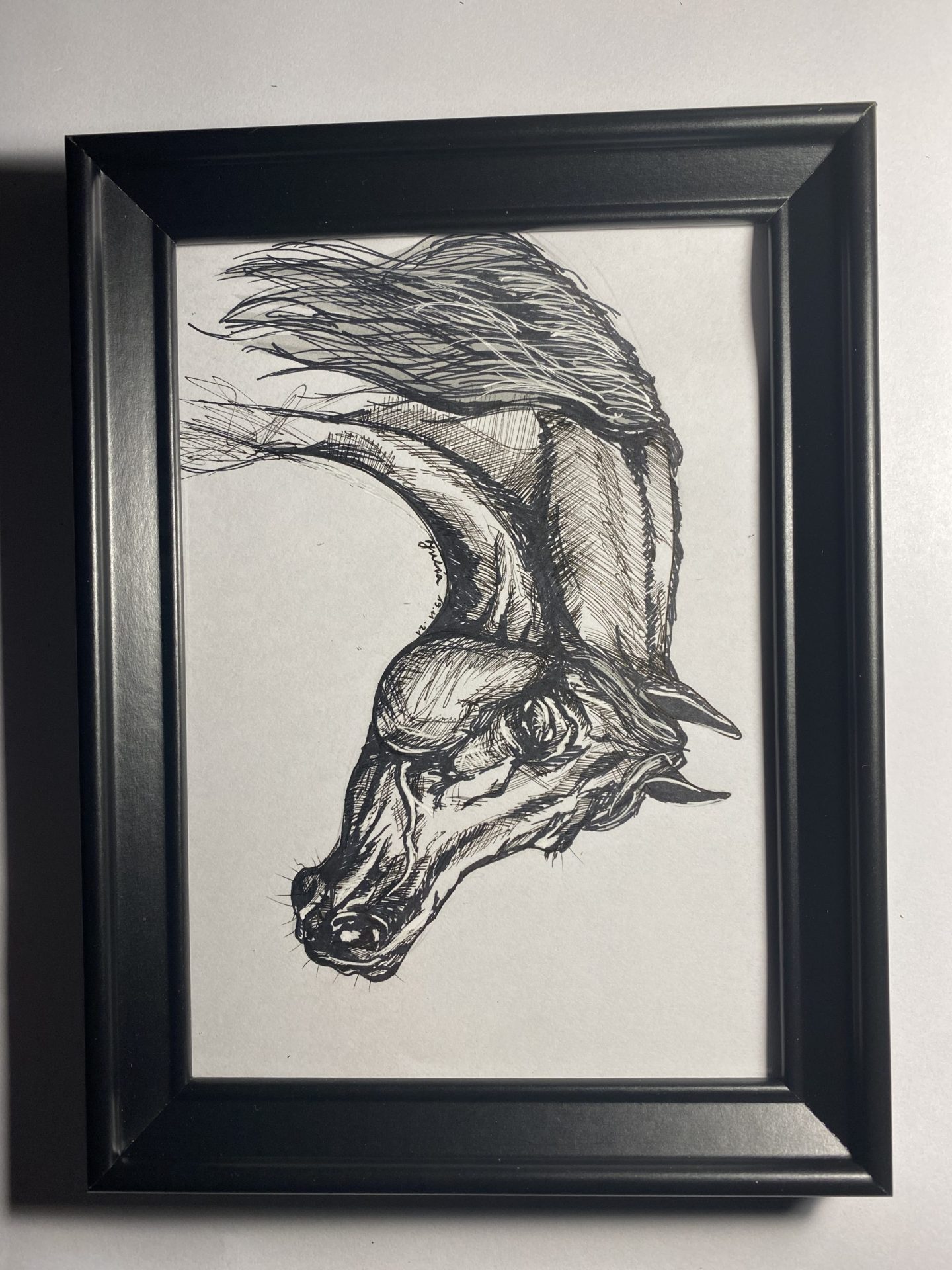 Rysunek konia arabskiego wykonany czarnym cienkopisem.