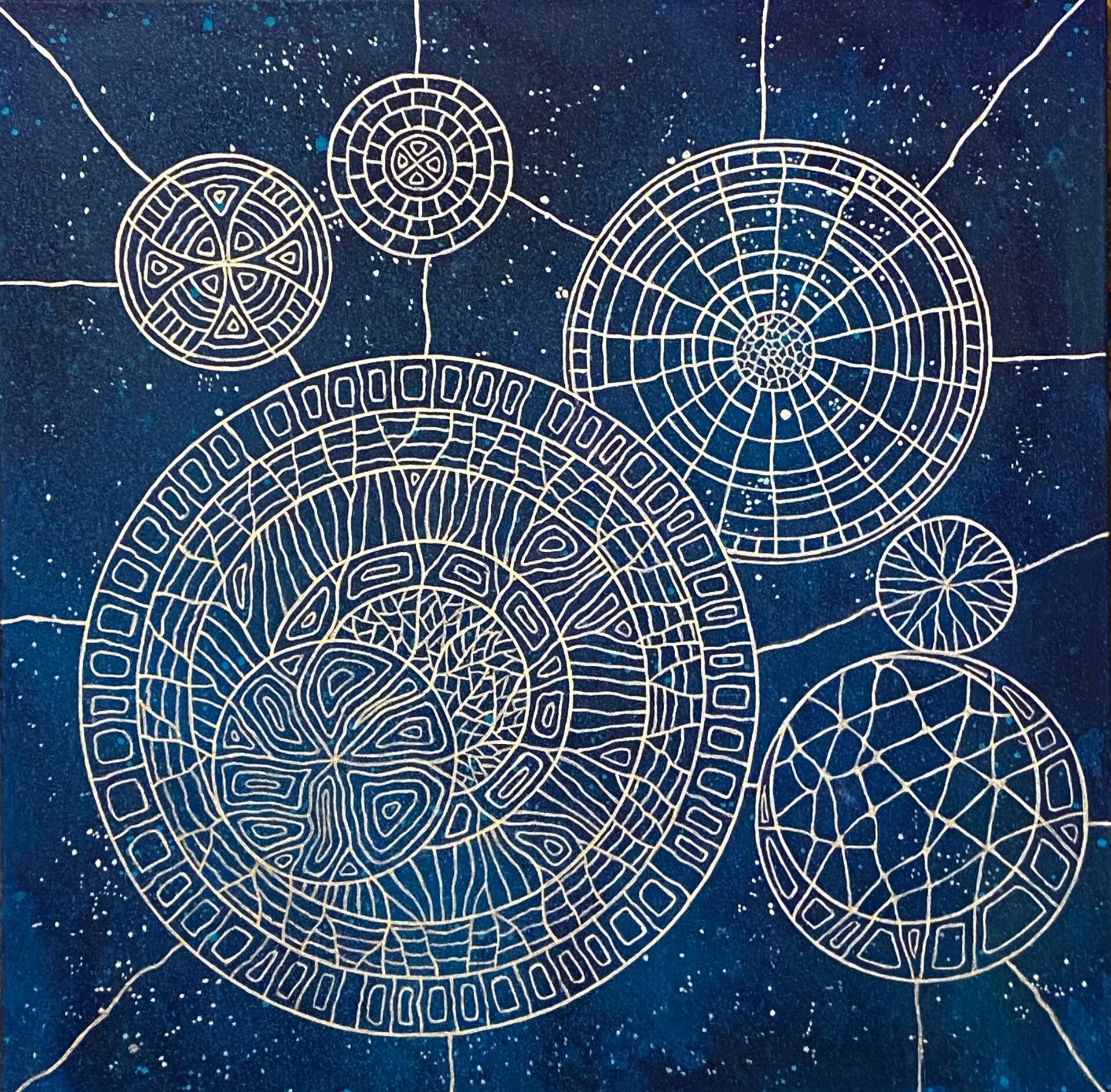 Przedstawia połączone ze sobą mandale, symbolizując połączenie różnych światów . Obraz doskonały na prezent . Pasuje do wielu wnętrz (do salonu, sypialni jak również biura).