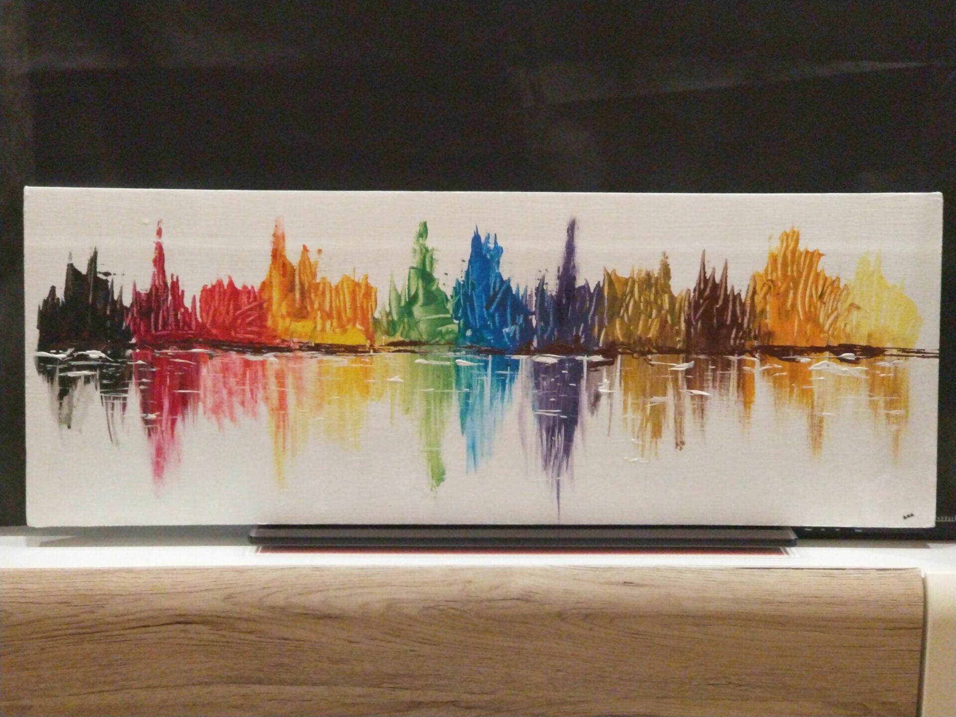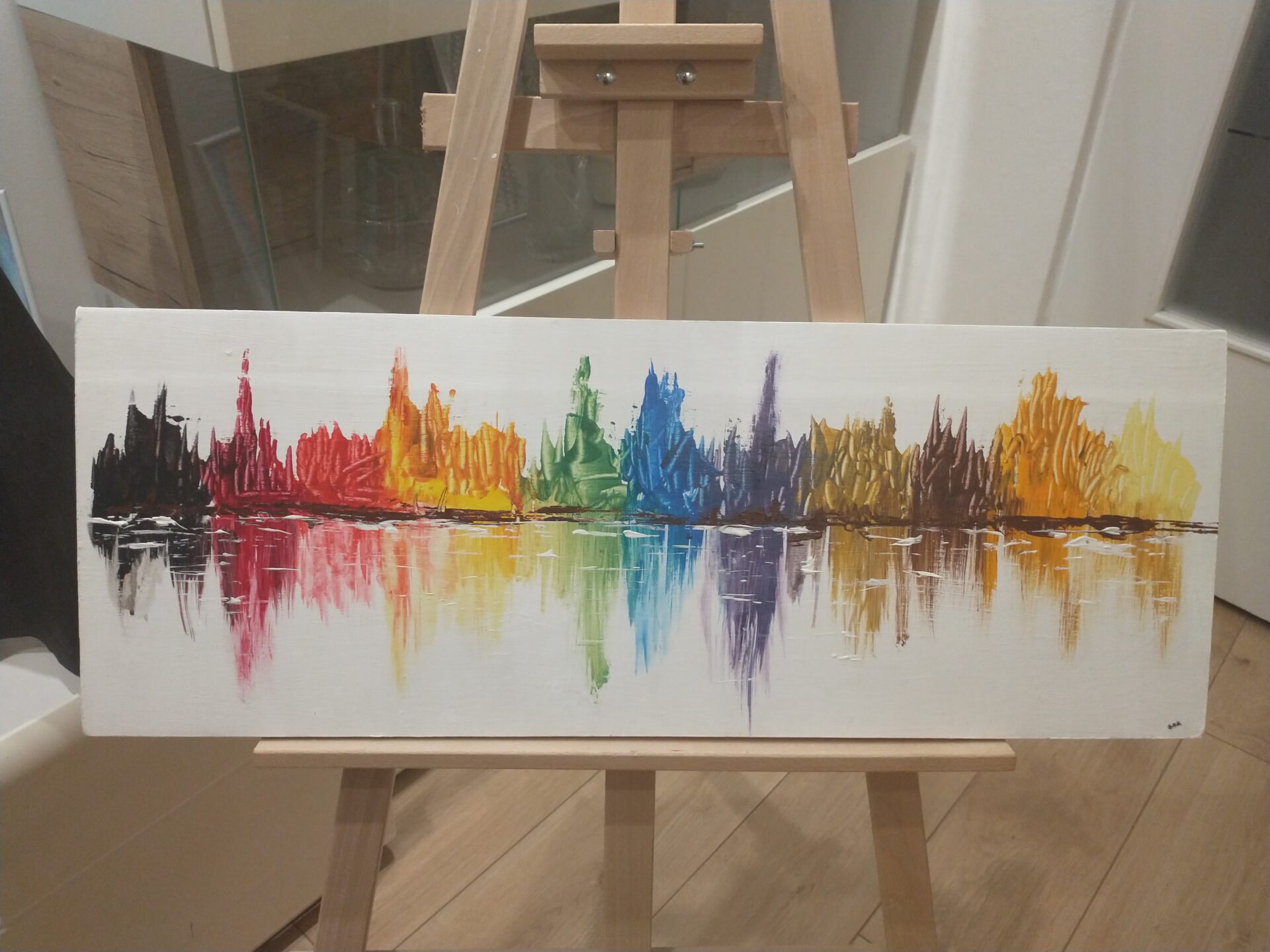 Obraz o wymiarach 74 x 28, grubość 1 cm, akryl, malowany na płycie regips, zabezpieczony werniksem, leciutki połysk.