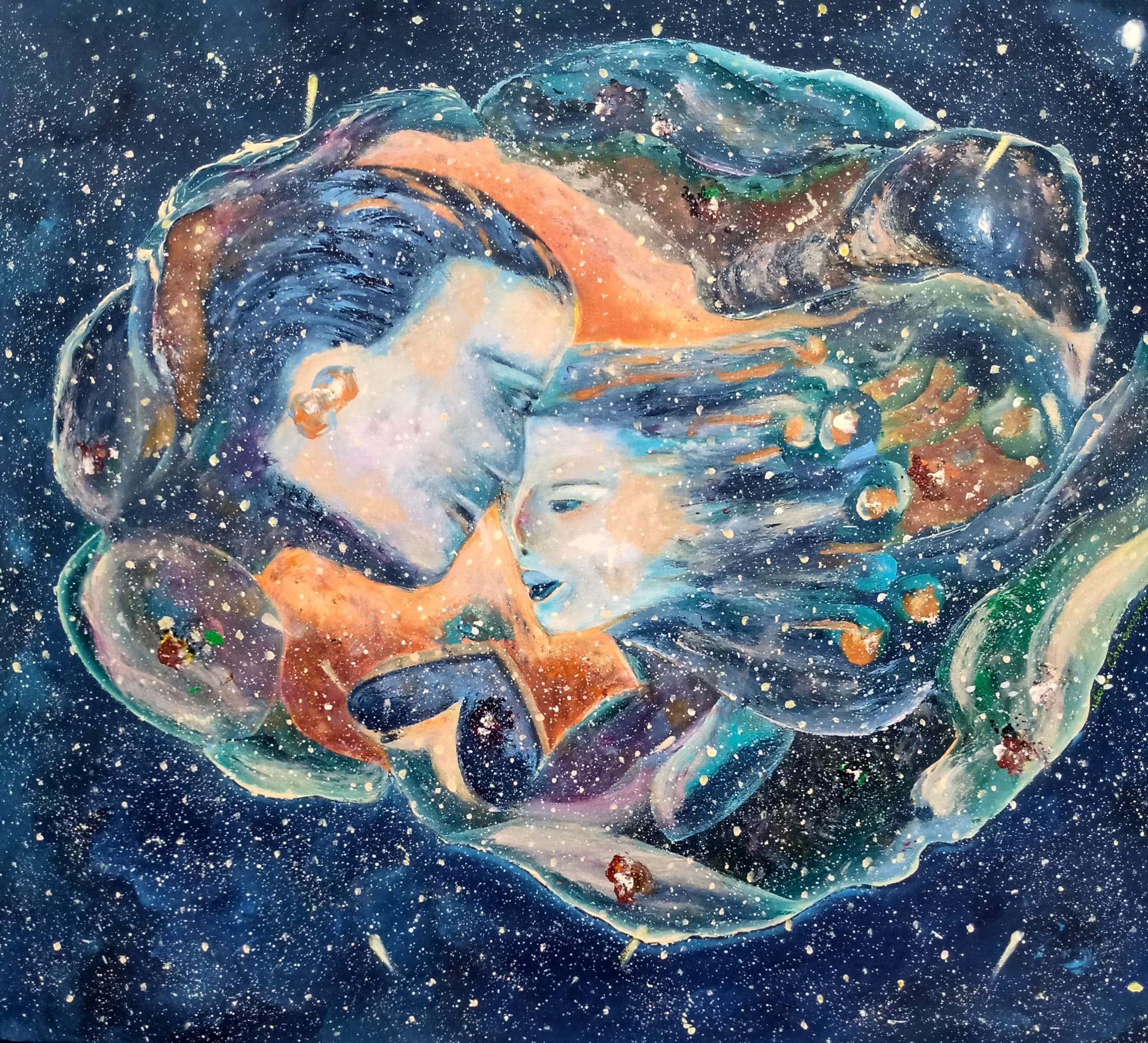 Mój ulubiony, autorski motyw bliskości. Tym razem w bajkowej aranżacji kosmosu. Obraz ma zamalowane tematycznie boki i zamontowaną zawieszkę.