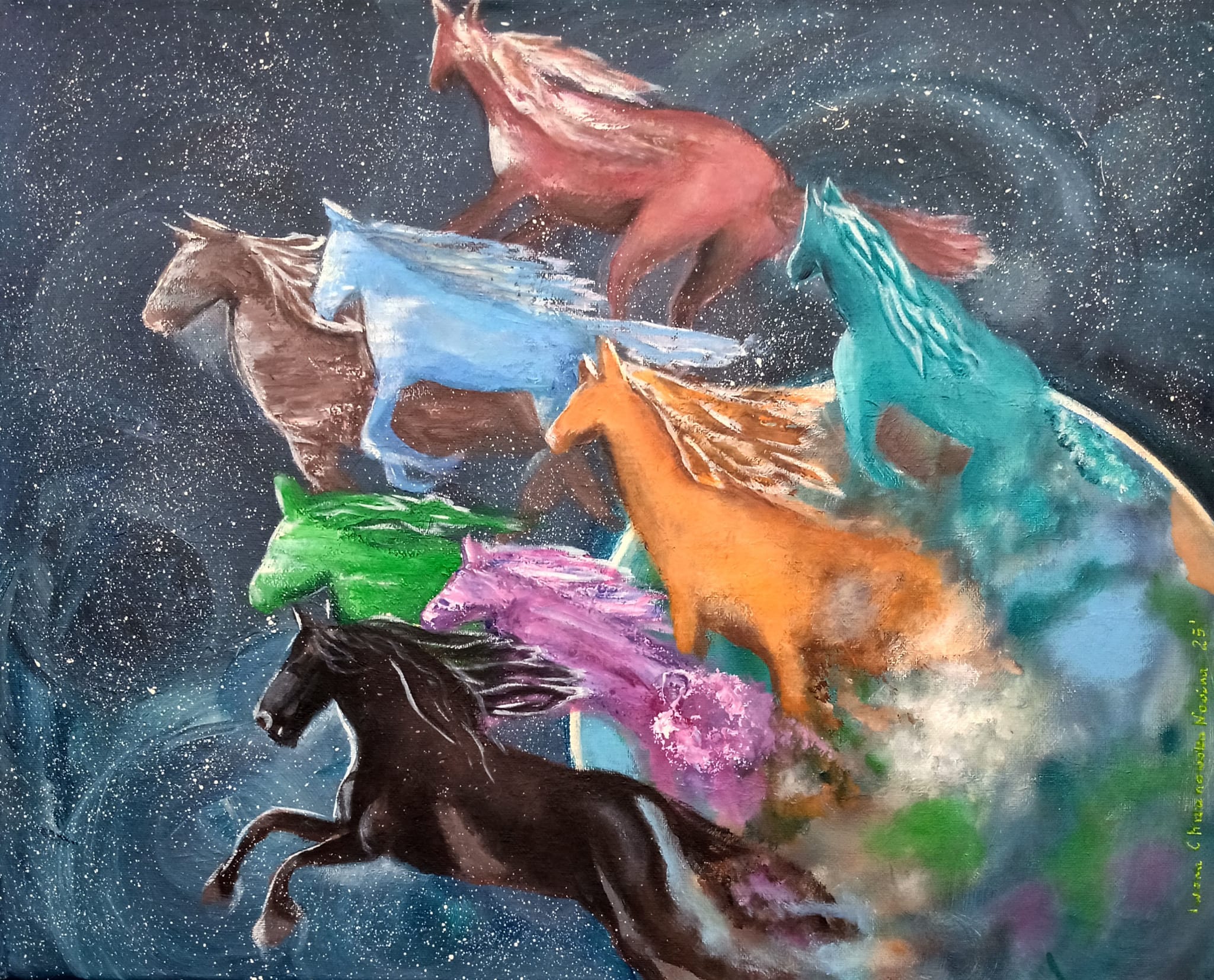 Koń jest dla mnie symbolem wolności, chociaż w naszym świecie tak nie jest. Pomysł powstał, jak jechałam za dużym samochodem transportującym konie. Moje konie opuszczają naszą planetę, by nie zaznawać zniewolenia. Boki obrazu są zamalowane, zamontowana jest zawieszka.