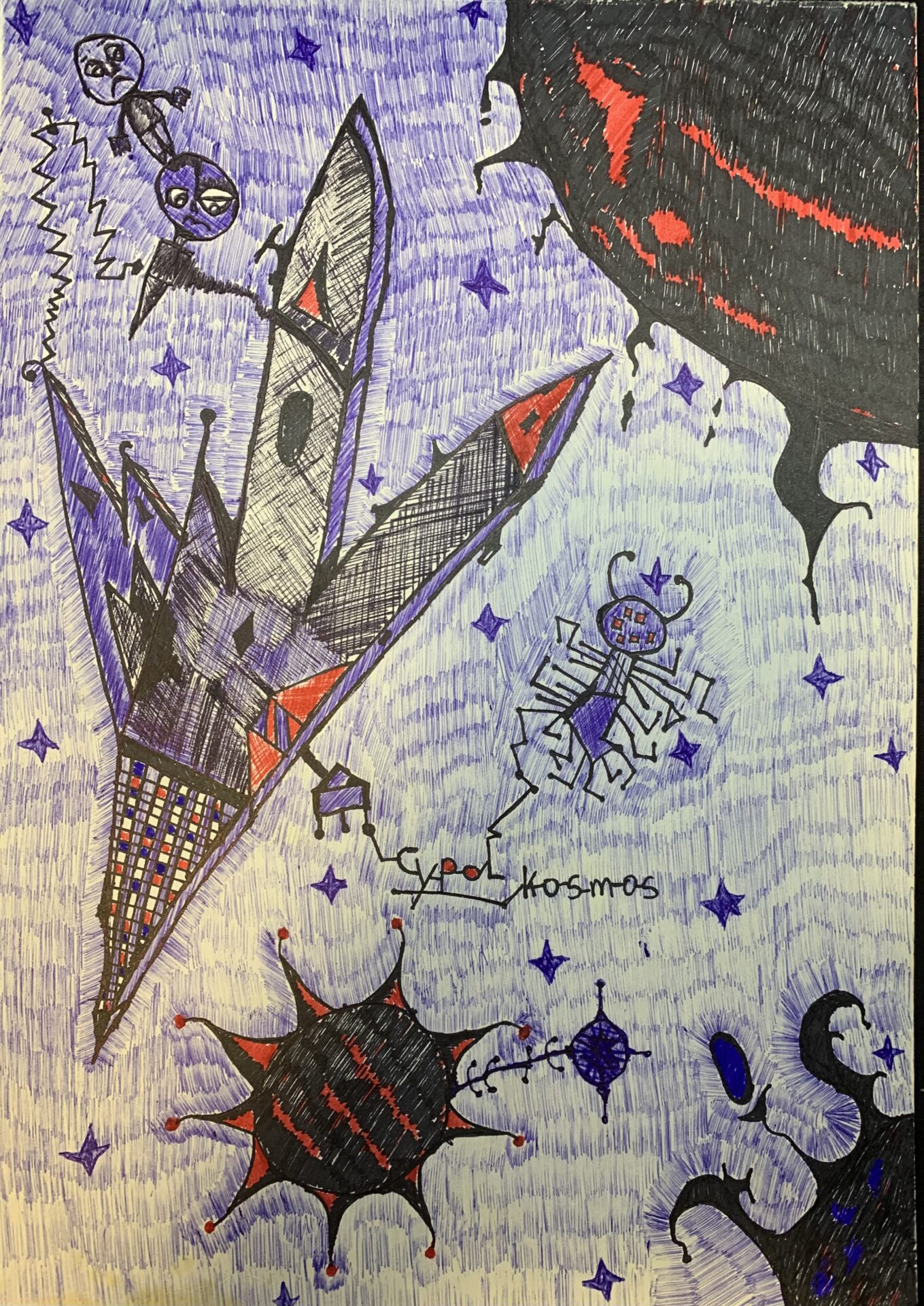 Rysunek wykonany cienkopisami i długopisami na kartce z bloku technicznego.