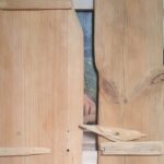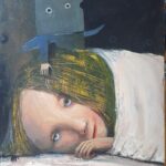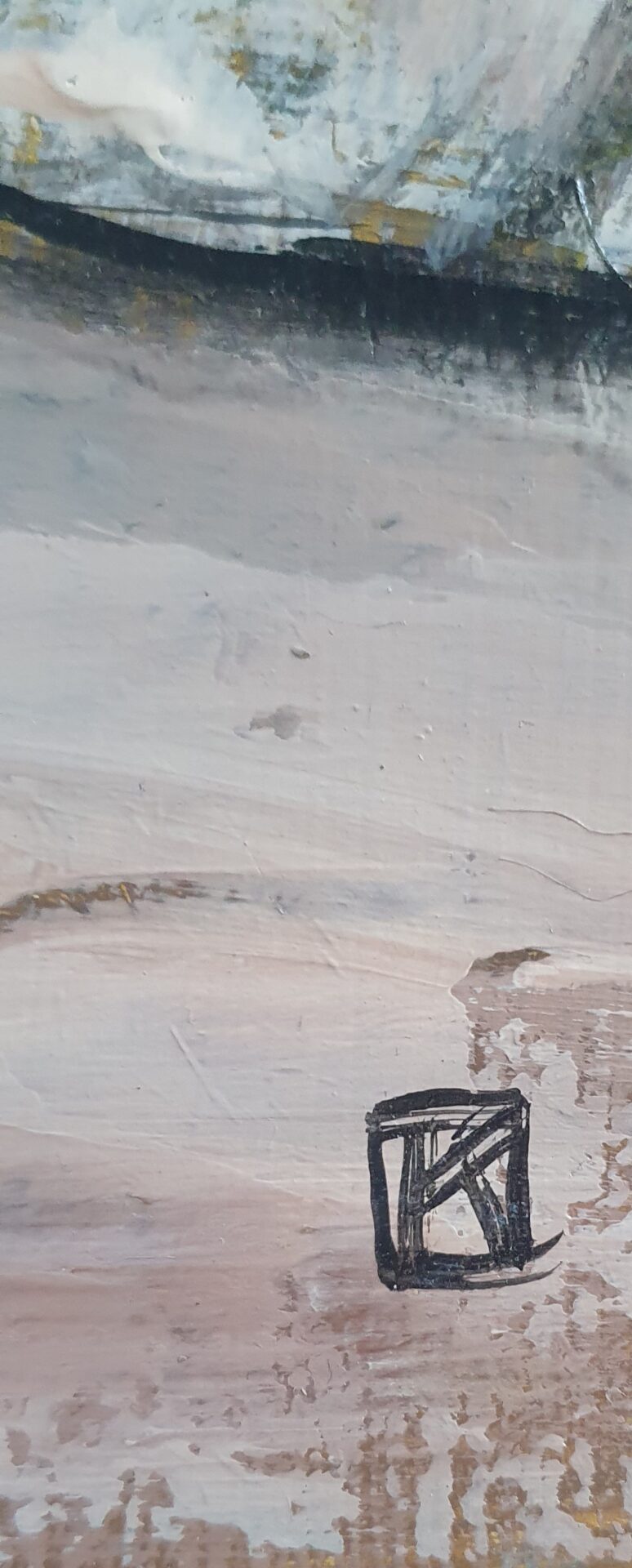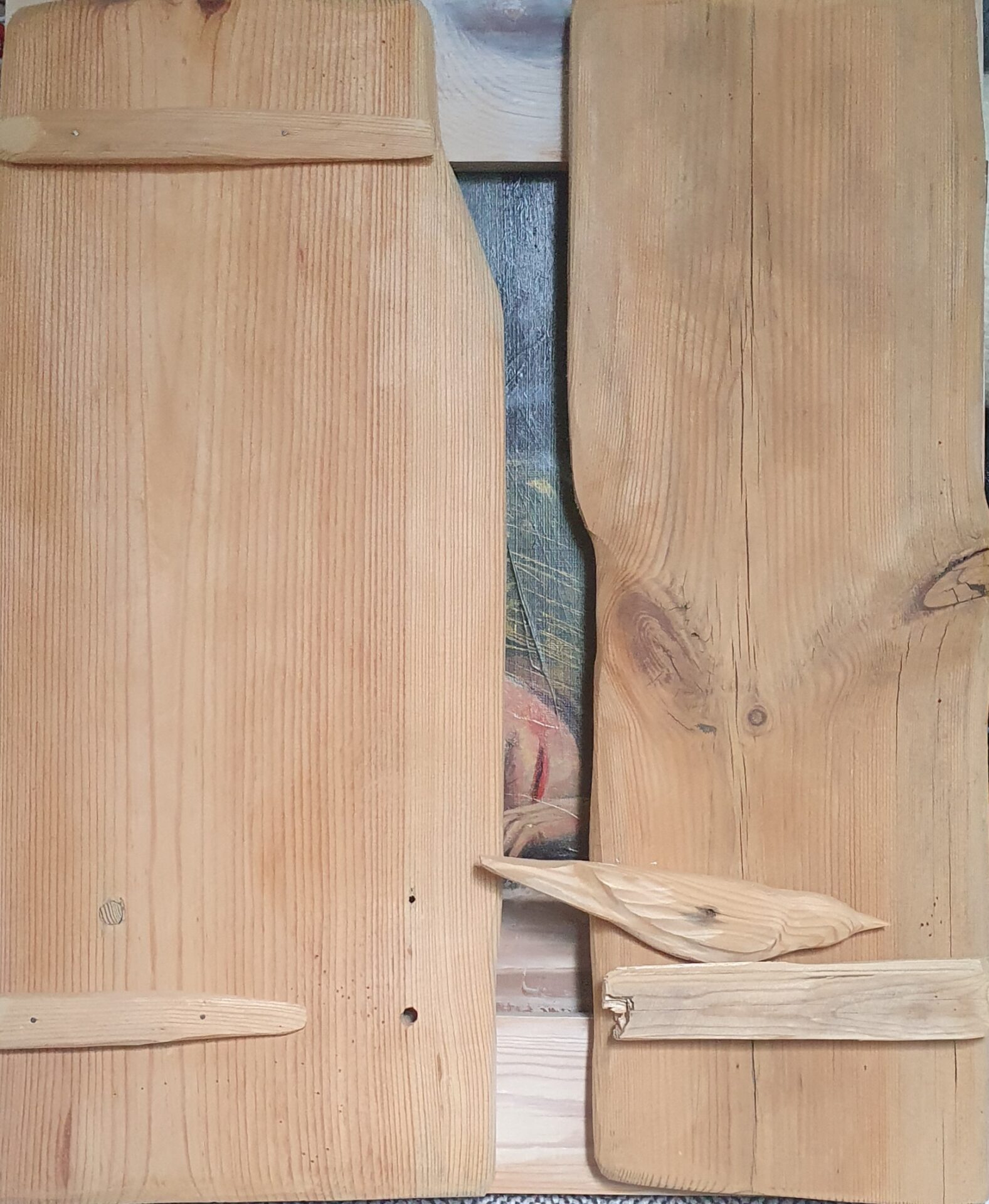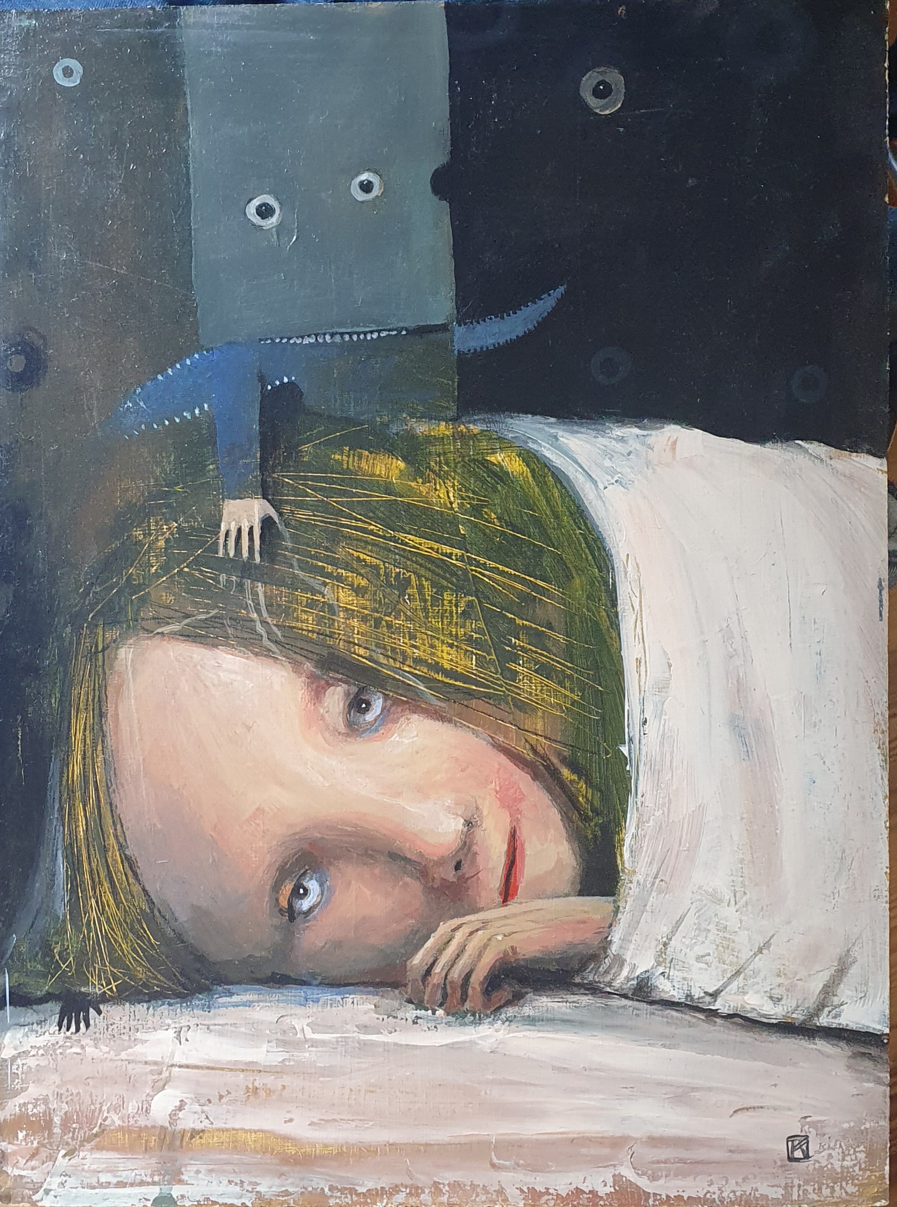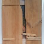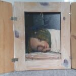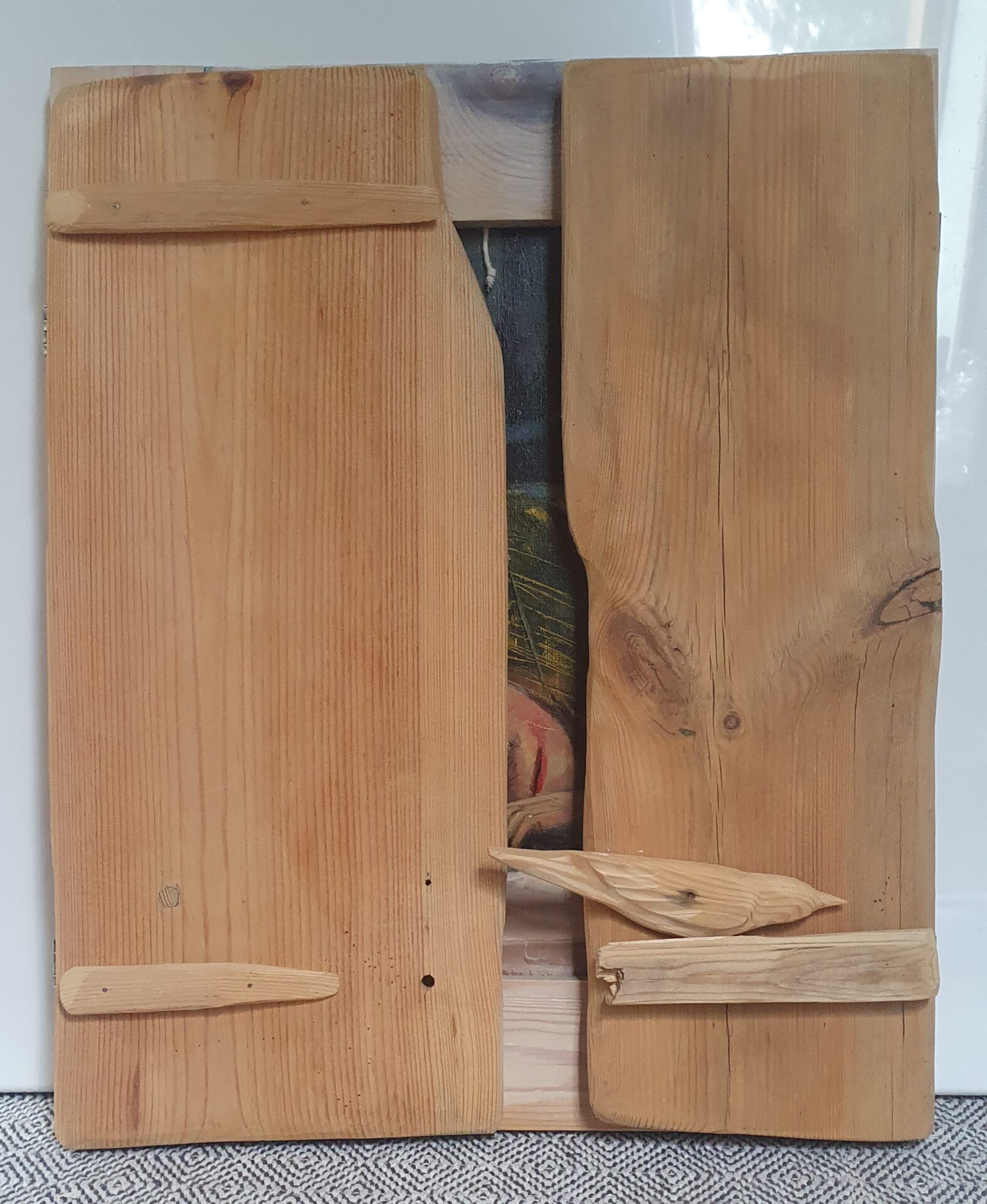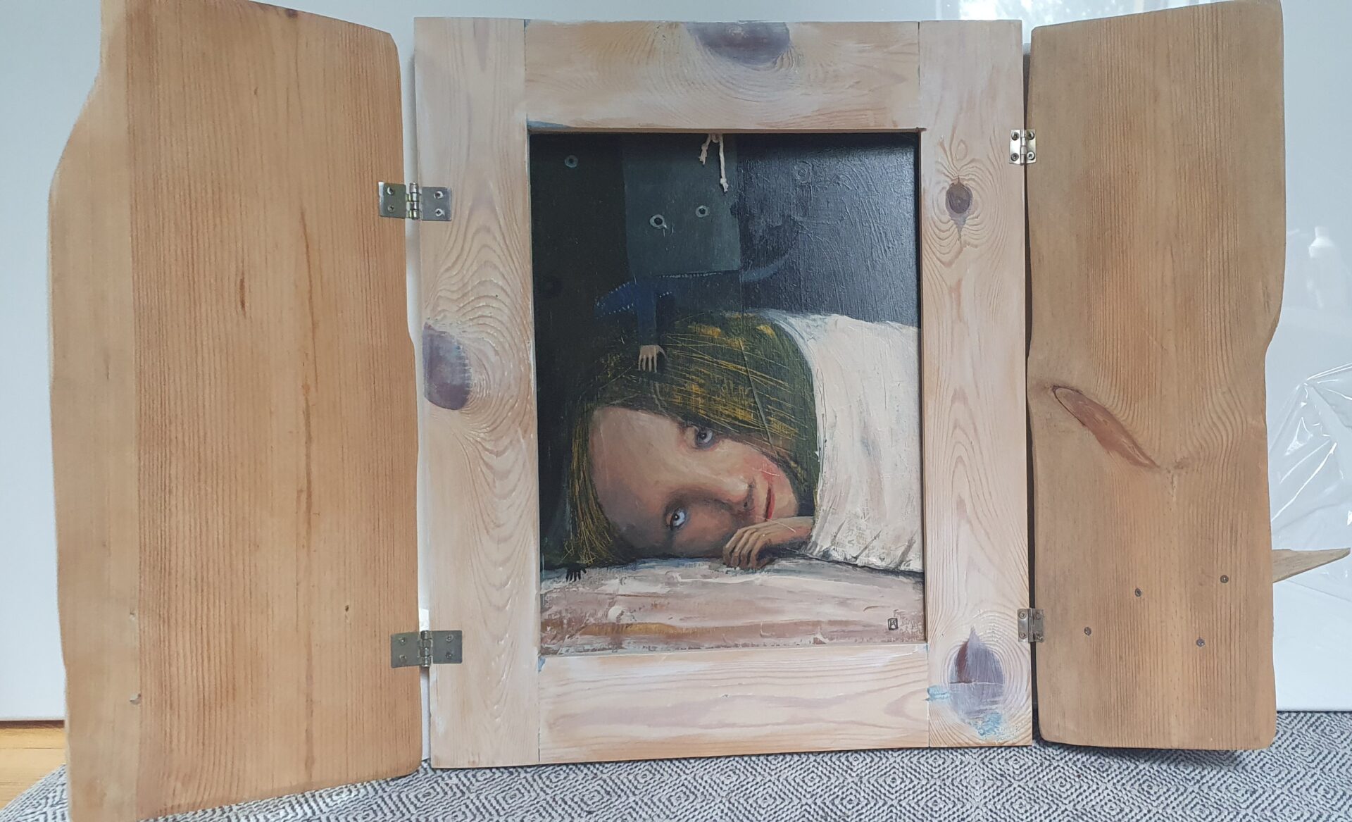 Akryl na dykcie, oprawiony w prostą, drewnianą ramę, rama ma drewniane okiennice: można zdemontować: wymiary z ramą-45×55