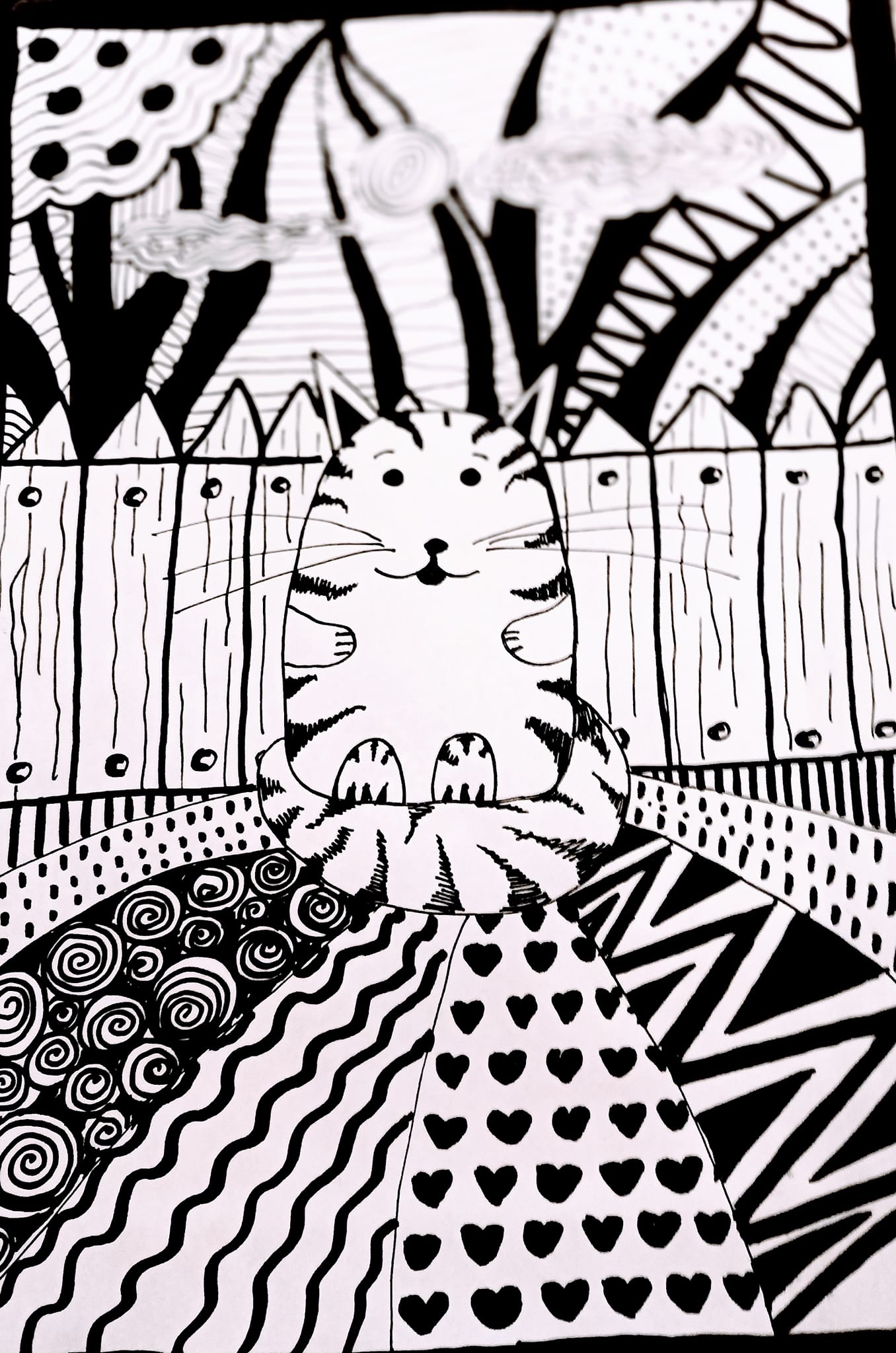 Kot ,,zentagle” , rysunek wykonany markerami i cienkopisami. Wysyłam z ramką.
