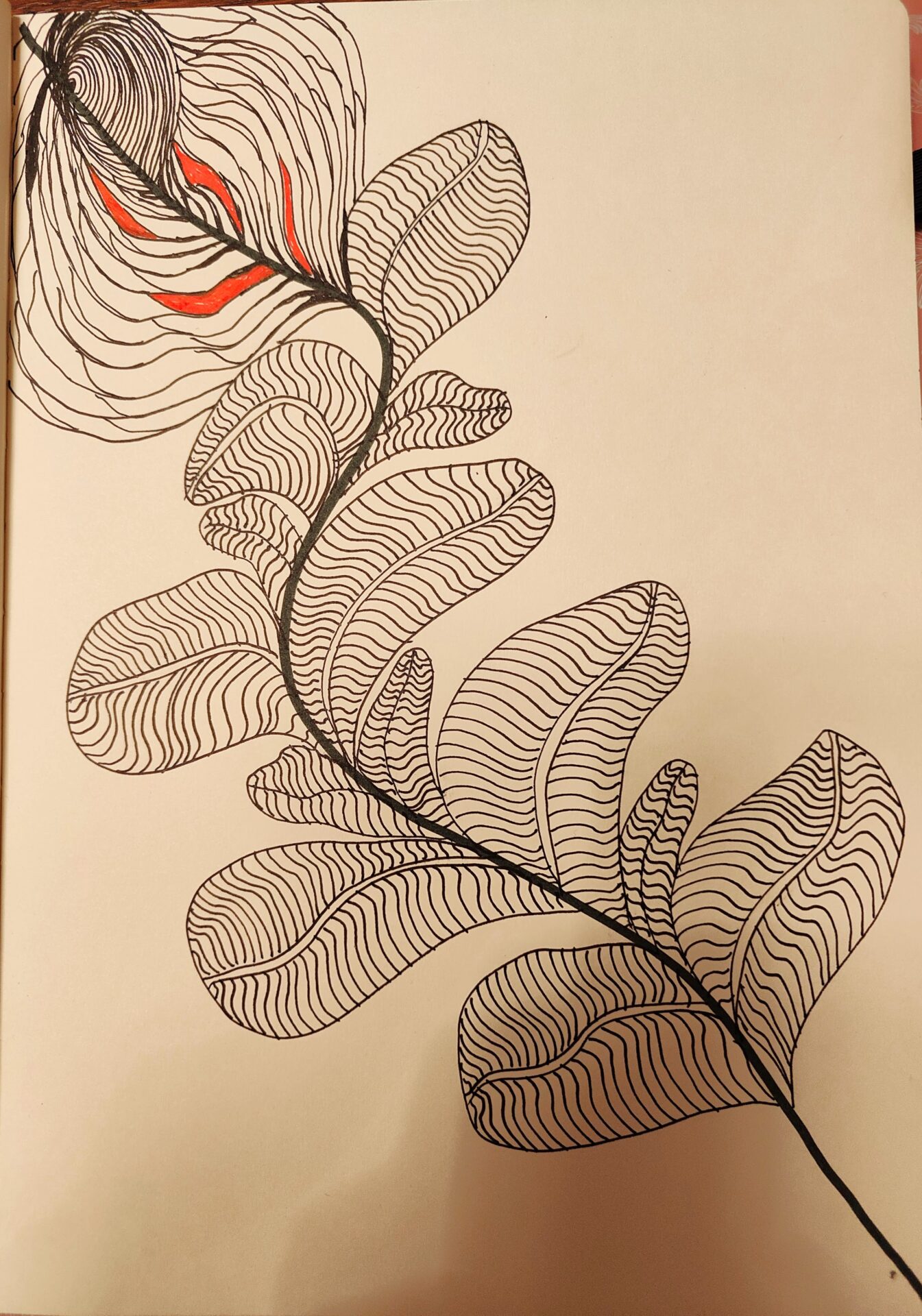 Rysunek wykonany czarnymi cienkopisami różnych grubości od 0,1 do 0,4 cm na papierze w odcieniu ivory. Fragment w czerwonym pisaku. Format A4. Dla chętnych oprawię w cienką ramkę (kolor biały, drewna oraz czarny) + 10 zł.