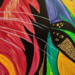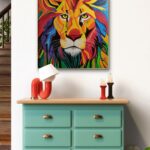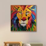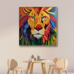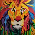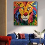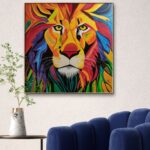 Obraz przedstawiający lwa, wykonany jest farbami akrylowymi na płótnie bawełnianym. Imponująca grzywa zwierzęcia jest pokryta rozmaitymi odcieniami żółci, pomarańcza, czerwieni i błękitu, co dodaje charakteru i kontrastu całej kompozycji. Jego sierść jest przedstawiona za pomocą wyraźnych, gęstych pociągnięć pędzla. Obraz idealnie sprawdzi się w pokojach dziecięcych, ale też we wnętrzach o łagodnej kolorystyce, nadając im wyjątkowego charakteru. Obraz pokryty jest matowym werniksem, który nadaje głębi kolorom. Możliwy jest także zakup reprodukcji obrazu w formie wydruku na płótnie w dowolnej wielkości. O szczegóły dotyczące ceny reprodukcji proszę pytać telefonicznie lub mailowo.