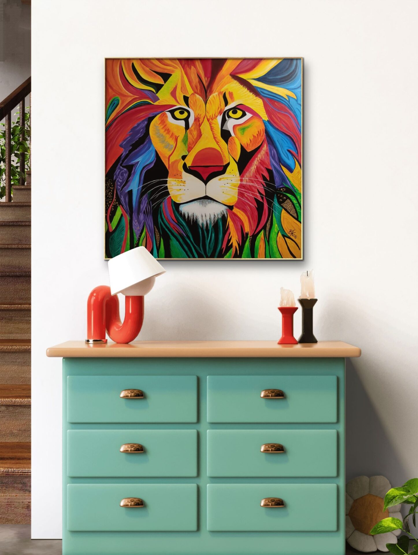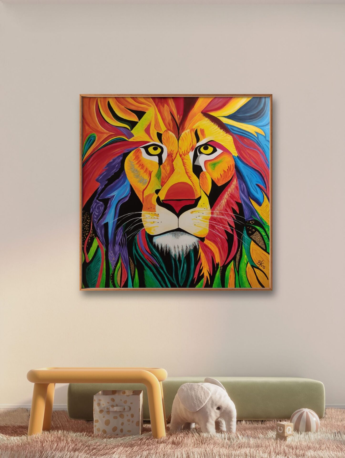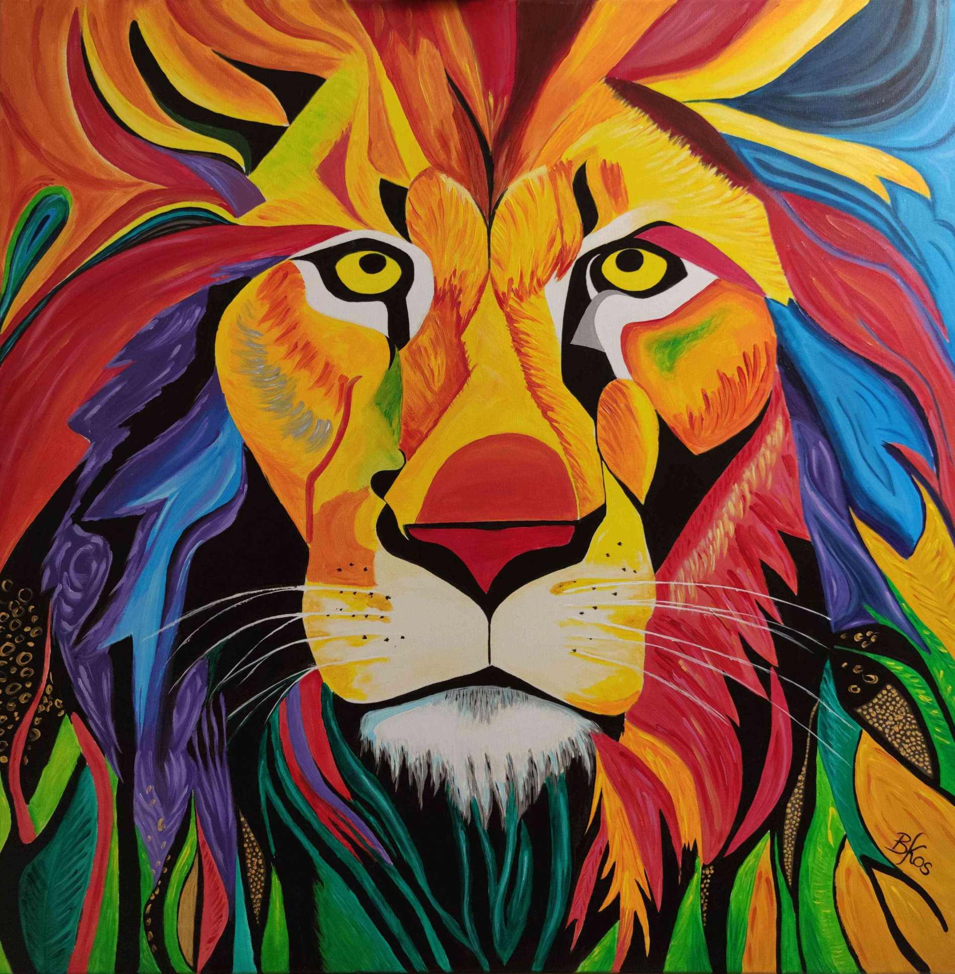 Obraz przedstawiający lwa, wykonany jest farbami akrylowymi na płótnie bawełnianym. Imponująca grzywa zwierzęcia jest pokryta rozmaitymi odcieniami żółci, pomarańcza, czerwieni i błękitu, co dodaje charakteru i kontrastu całej kompozycji. Jego sierść jest przedstawiona za pomocą wyraźnych, gęstych pociągnięć pędzla. Obraz idealnie sprawdzi się w pokojach dziecięcych, ale też we wnętrzach o łagodnej kolorystyce, nadając im wyjątkowego charakteru. Obraz pokryty jest matowym werniksem, który nadaje głębi kolorom. Możliwy jest także zakup reprodukcji obrazu w formie wydruku na płótnie w dowolnej wielkości. O szczegóły dotyczące ceny reprodukcji proszę pytać telefonicznie lub mailowo.