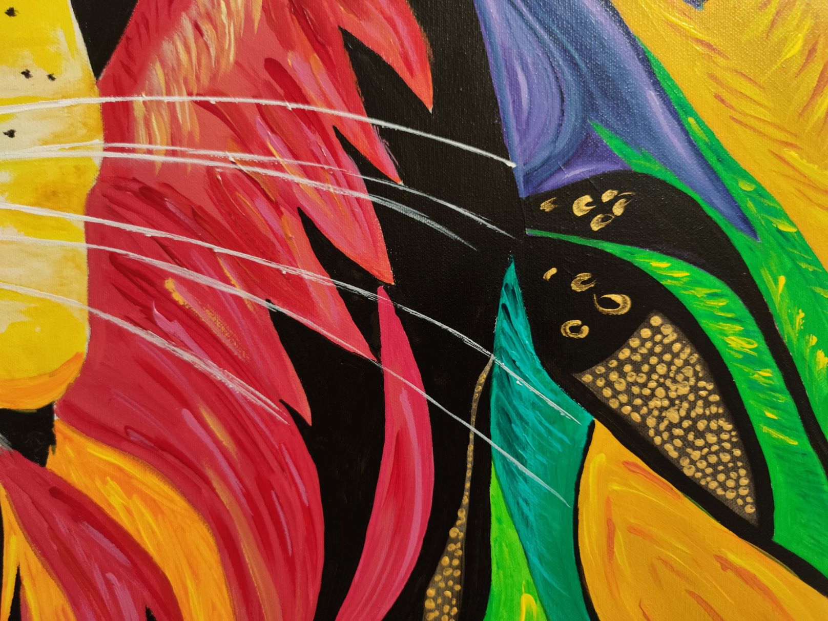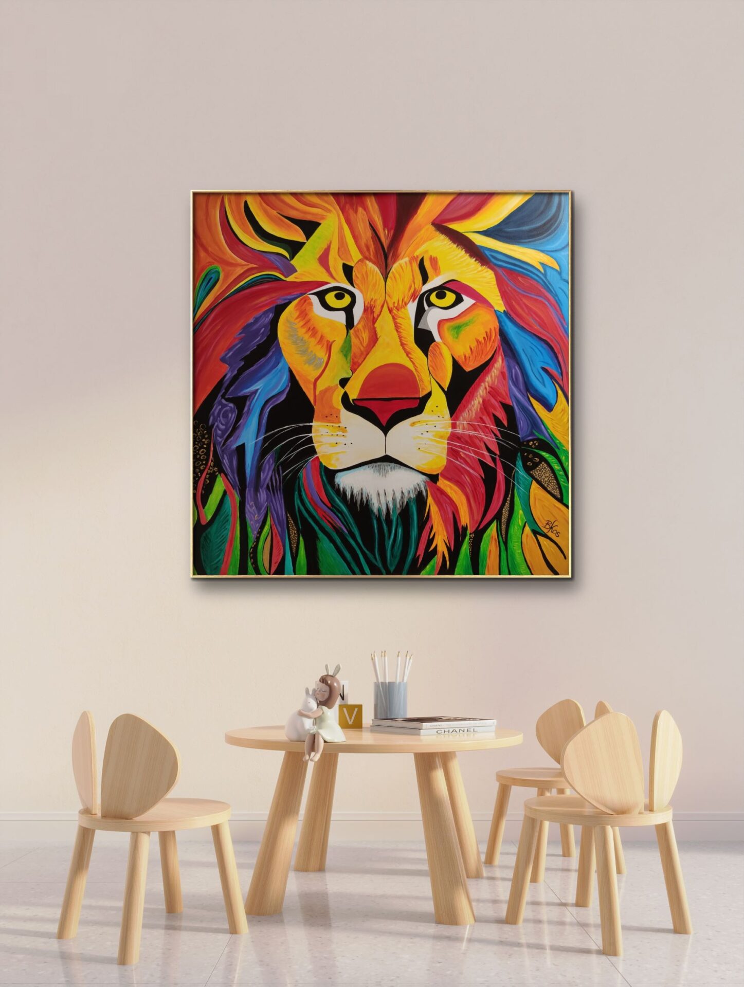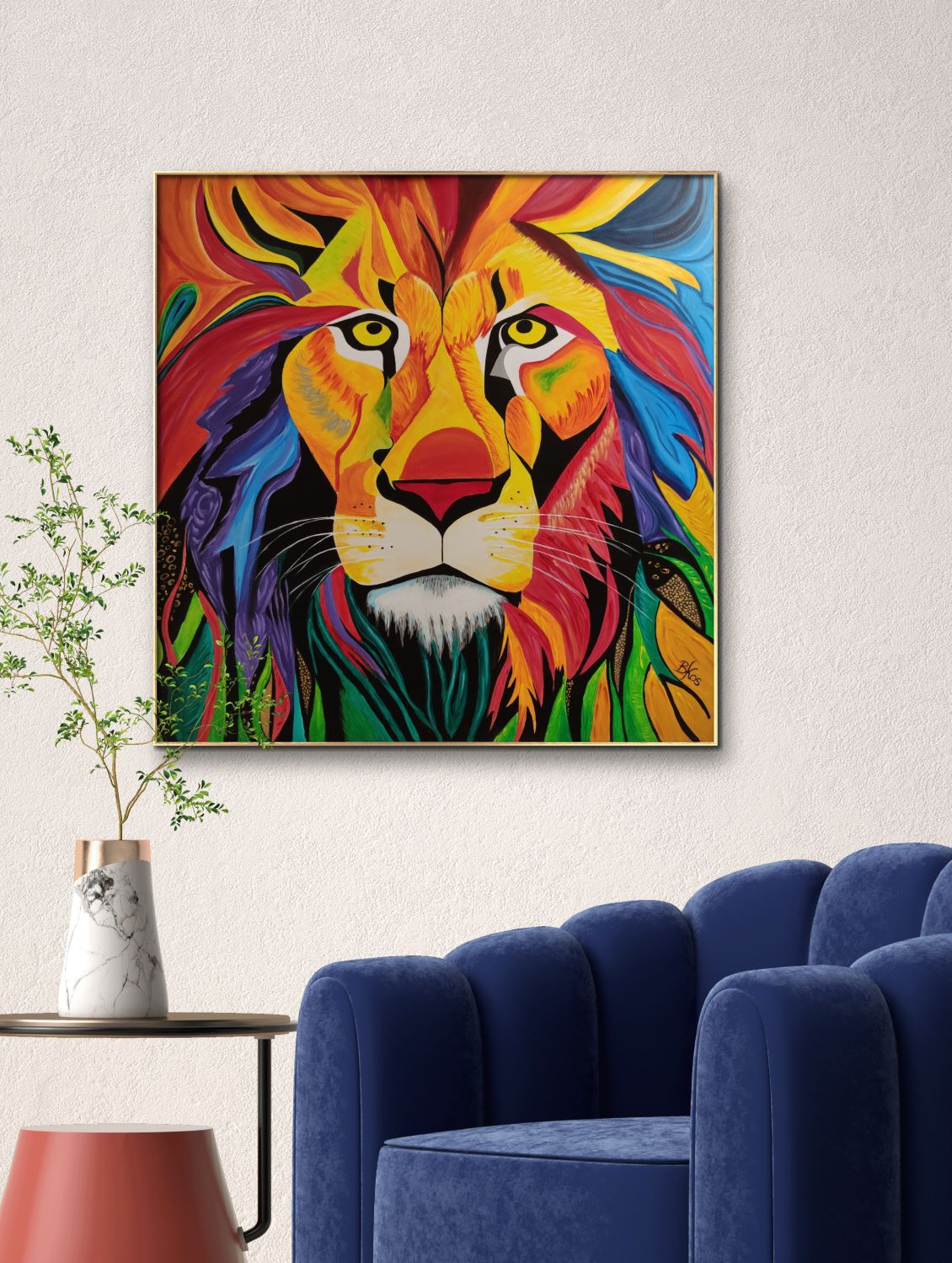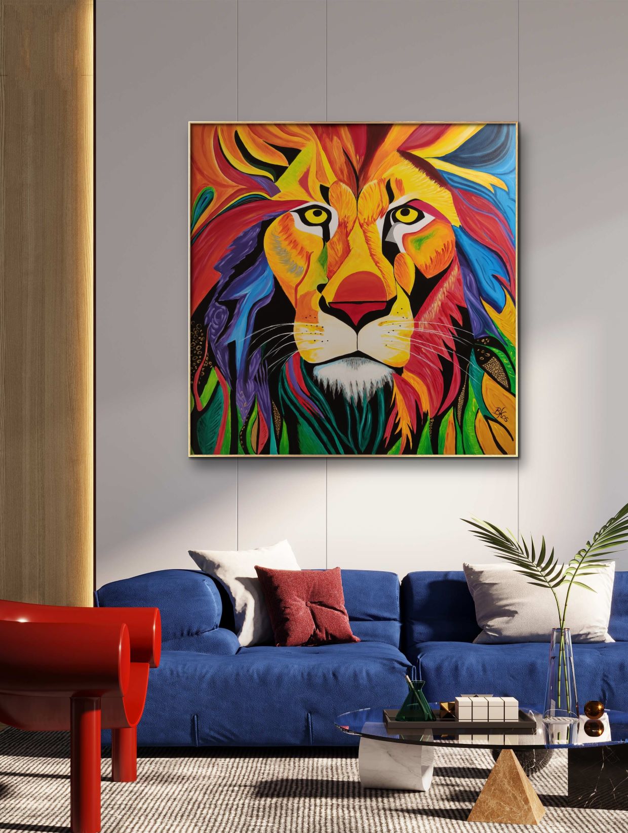 Obraz przedstawiający lwa, wykonany jest farbami akrylowymi na płótnie bawełnianym. Imponująca grzywa zwierzęcia jest pokryta rozmaitymi odcieniami żółci, pomarańcza, czerwieni i błękitu, co dodaje charakteru i kontrastu całej kompozycji. Jego sierść jest przedstawiona za pomocą wyraźnych, gęstych pociągnięć pędzla. Obraz idealnie sprawdzi się w pokojach dziecięcych, ale też we wnętrzach o łagodnej kolorystyce, nadając im wyjątkowego charakteru. Obraz pokryty jest matowym werniksem, który nadaje głębi kolorom. Możliwy jest także zakup reprodukcji obrazu w formie wydruku na płótnie w dowolnej wielkości. O szczegóły dotyczące ceny reprodukcji proszę pytać telefonicznie lub mailowo.