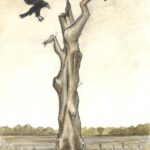 Rysunek przedstawia parę kruków przy starym wyschniętym drzewie na mokradłach. Praca wykonana w akwareli i ołówku, inspirowana jest sztuką ilustratorską przełomu XIX i XX wieku.