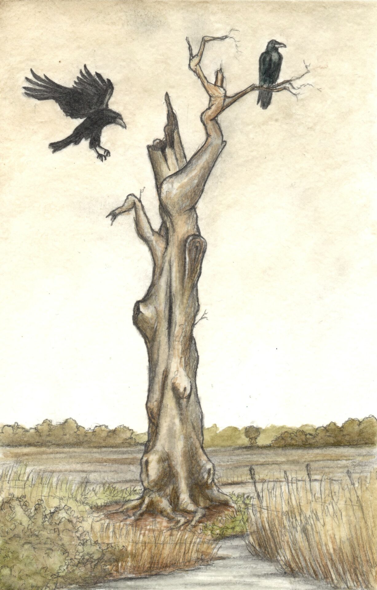 Rysunek przedstawia parę kruków przy starym wyschniętym drzewie na mokradłach. Praca wykonana w akwareli i ołówku, inspirowana jest sztuką ilustratorską przełomu XIX i XX wieku.
