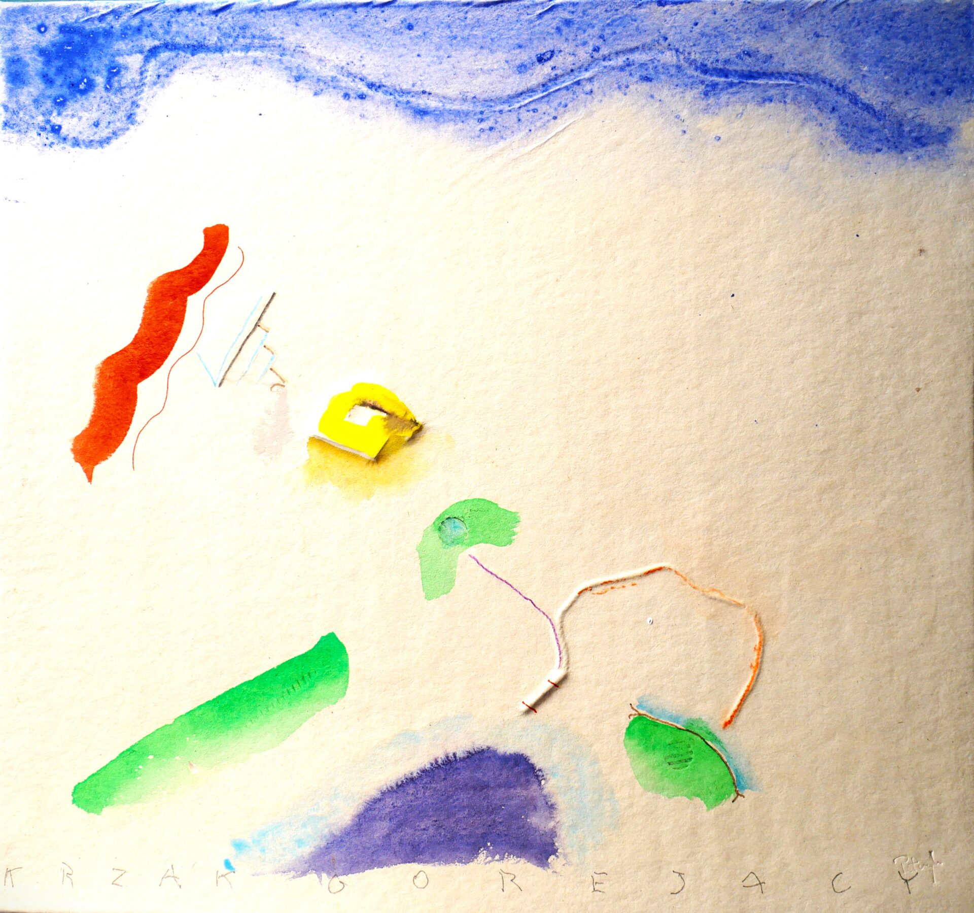 Najpierw naklejam na tekturę różne gotowe formy /papiery, nitki itp/ następnie naklejam papier na którym maluję akwarelą ,ołówkiem itp