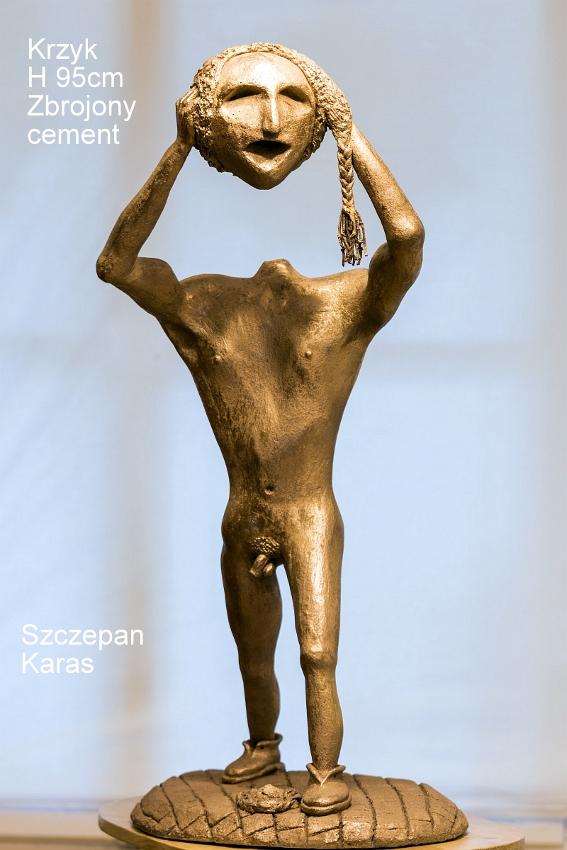 Postać nagiego mężczyzny z uniesioną w dłoniach krzyczącą głową wykonana ze zbrojonego cementu pokryta metalicznym lakierem.