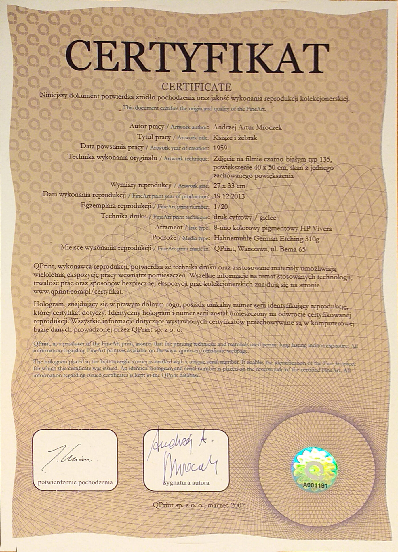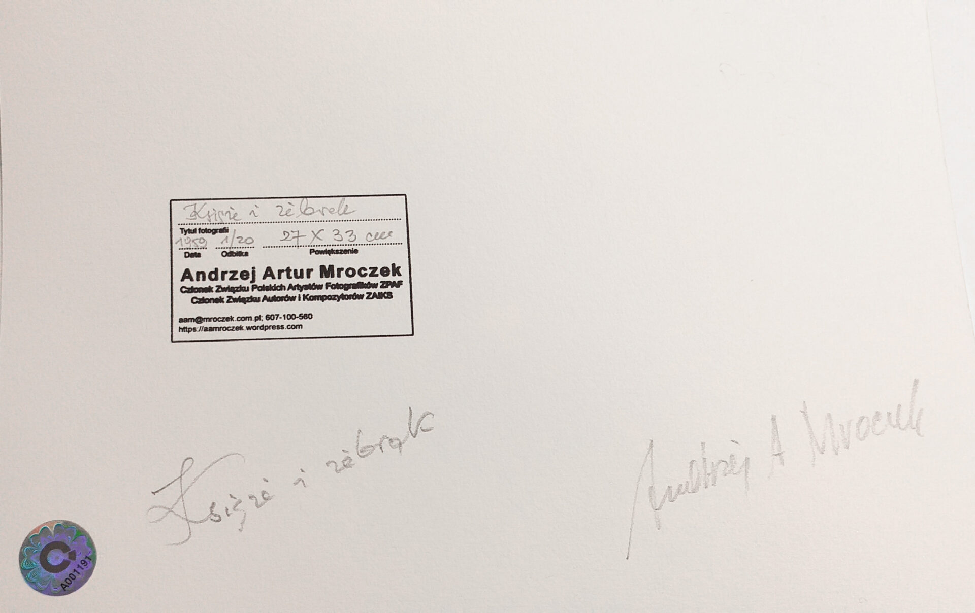 Przedstawiona tu fotografia jest skanem z oryginału i została wydrukowana przez firmę Qprint ´w technologii druku cyfrowego giglee, 8-kolorowym atramentem pigmentowym HP Vivera na podłożu Hahnemuhle German Etching 310 g. Do fotografii diłączony jest certyfikat jakości wydany przez Qprint. Fotografia jest oprawiona w passe-partout o rozmiarach 40 × 50 cm. Limit wydruków: 1/10