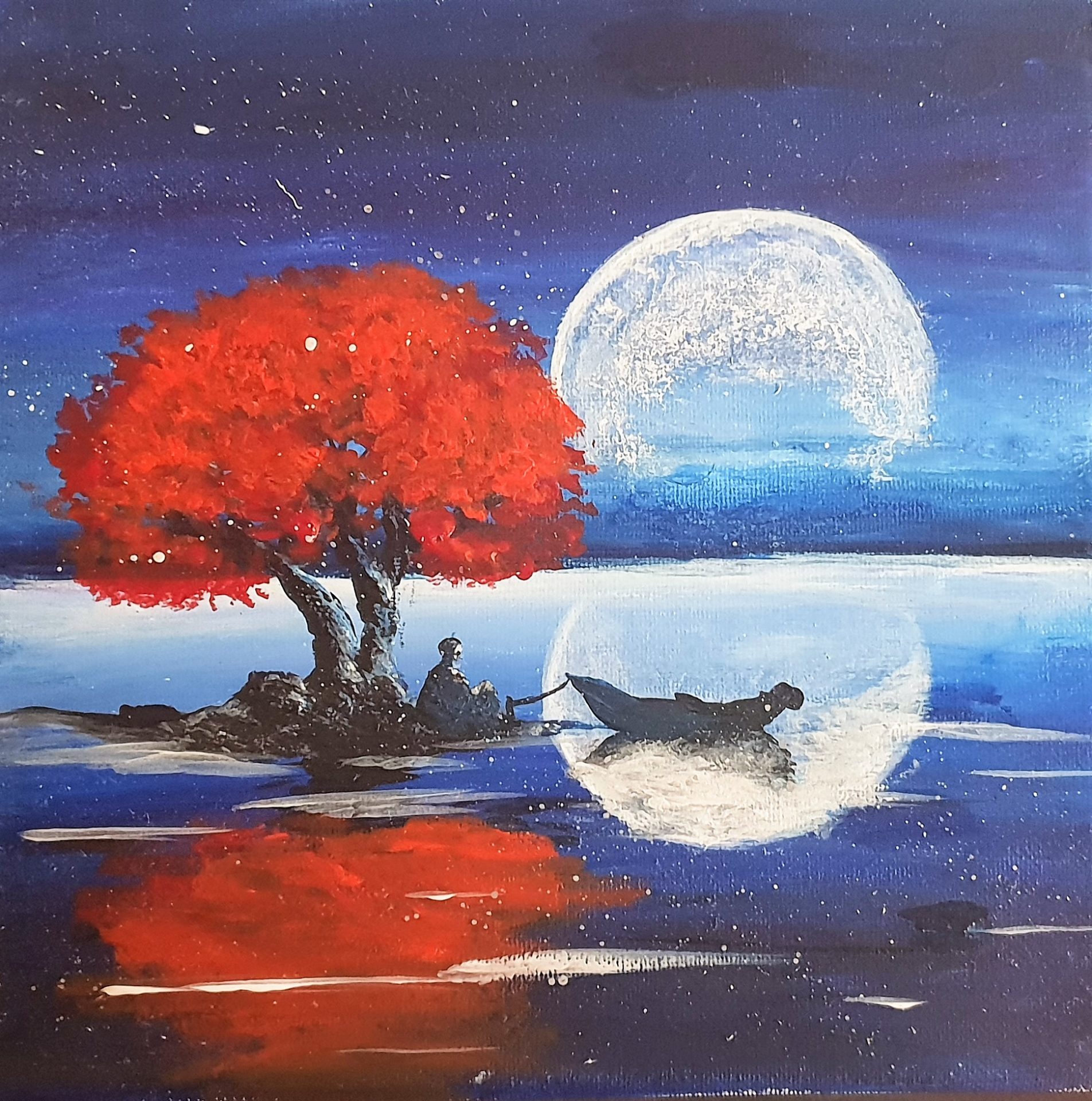 Ten utwór 'Księżycowa noc’ zaprasza do światu wyobrażni: glęboka i spokojna księżycowa noc daruje poczucie bezpieczeństwa i przyjemności. Akcenty w bieli stwarzają wrażenie światła księżyca, które sprawiają, że fale wodne świecą. Prawie czuć ciepło i spokój tego delikatnie wyglądającego czerwonego drzewa! Zawieś obraz w sypialni i pozwól mu odprowadzać Ciebie na codzienną podróż we świat snów.