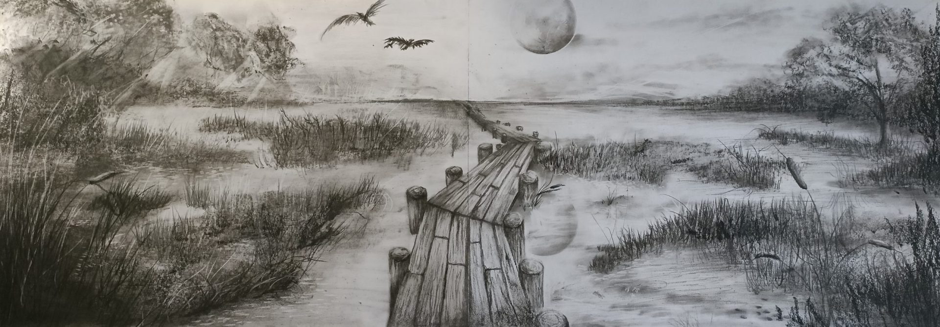 Obraz wykonany węglem na formacie dwóch karteka A3 jest on bardzo długim i wąskim obrazem
