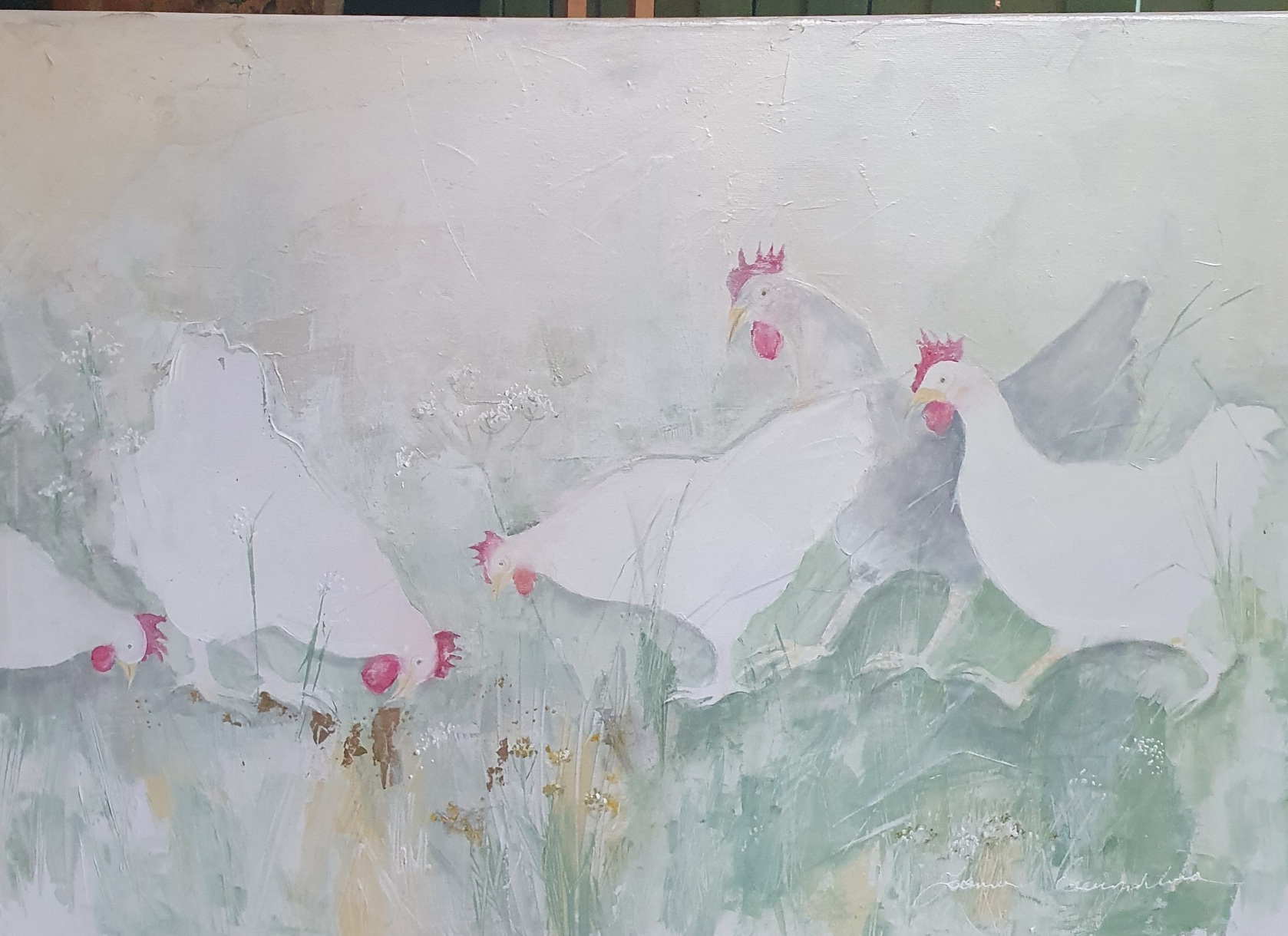 Orazek/ilustracja kurek cioci na większym formacie. Sielskie kury na łące, spokojna, pastelowa kolorystyka, ładny detal do kuchni lub do dziecięcego pokoju, bez ramy.