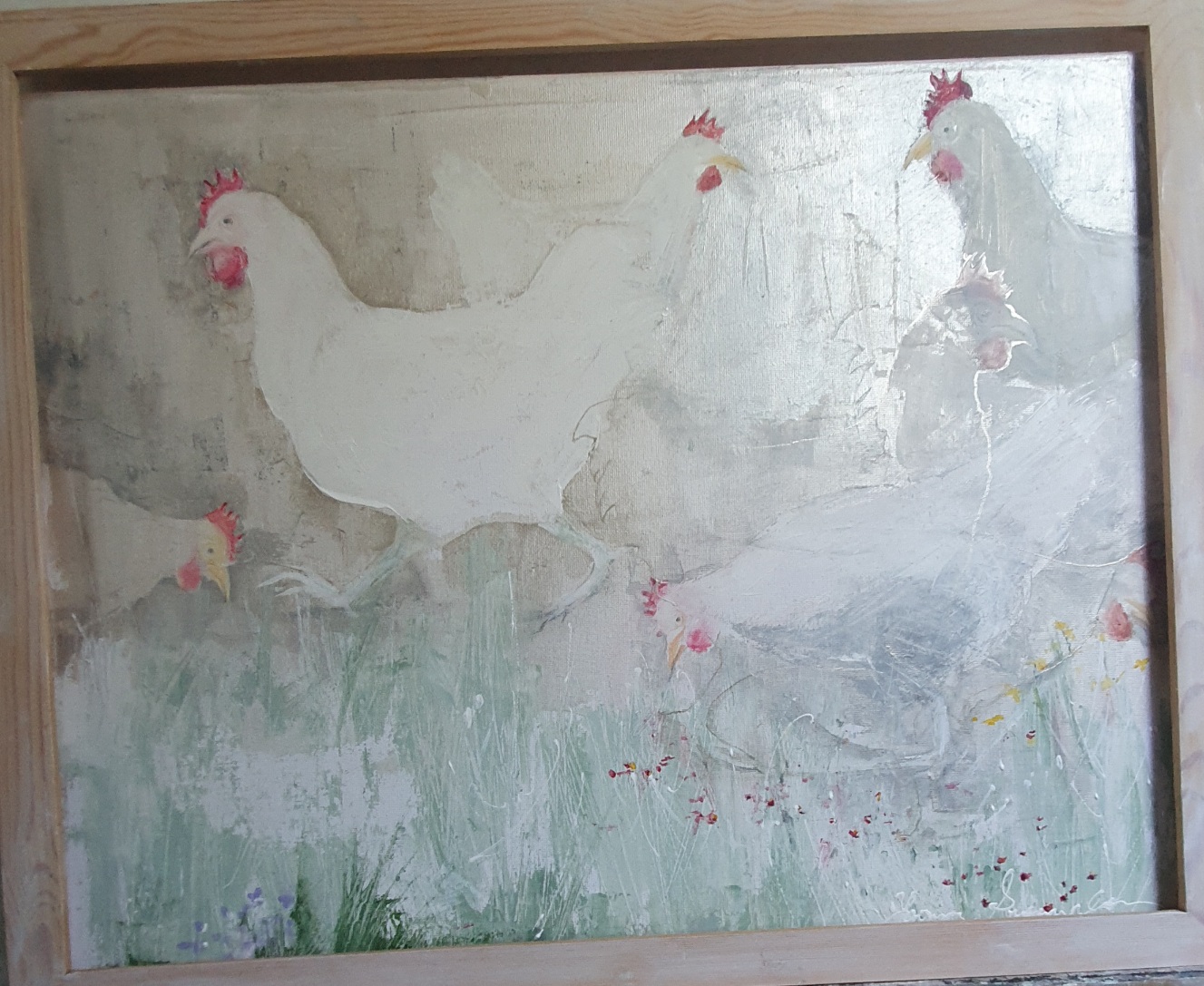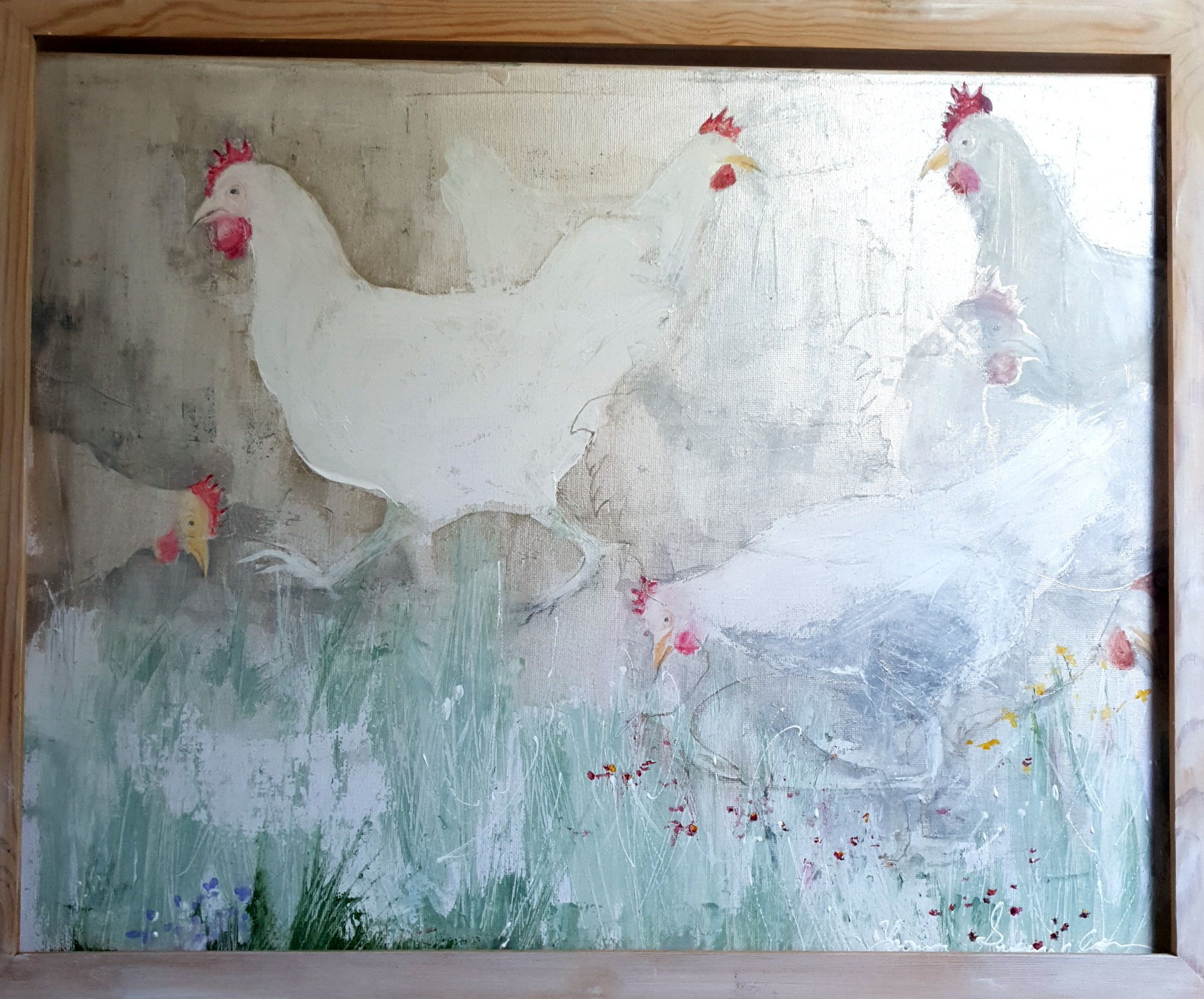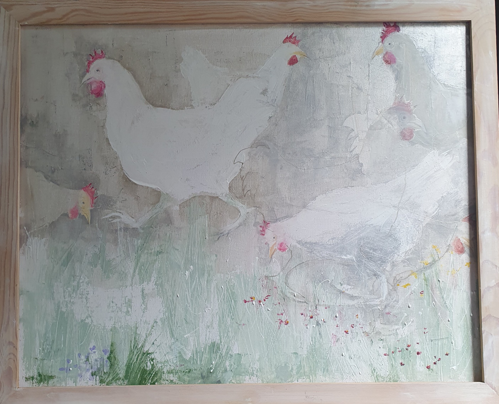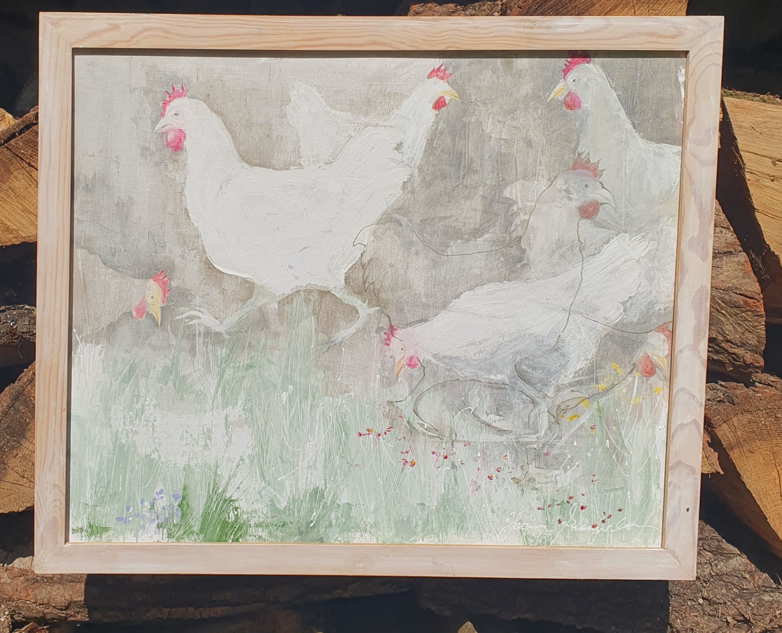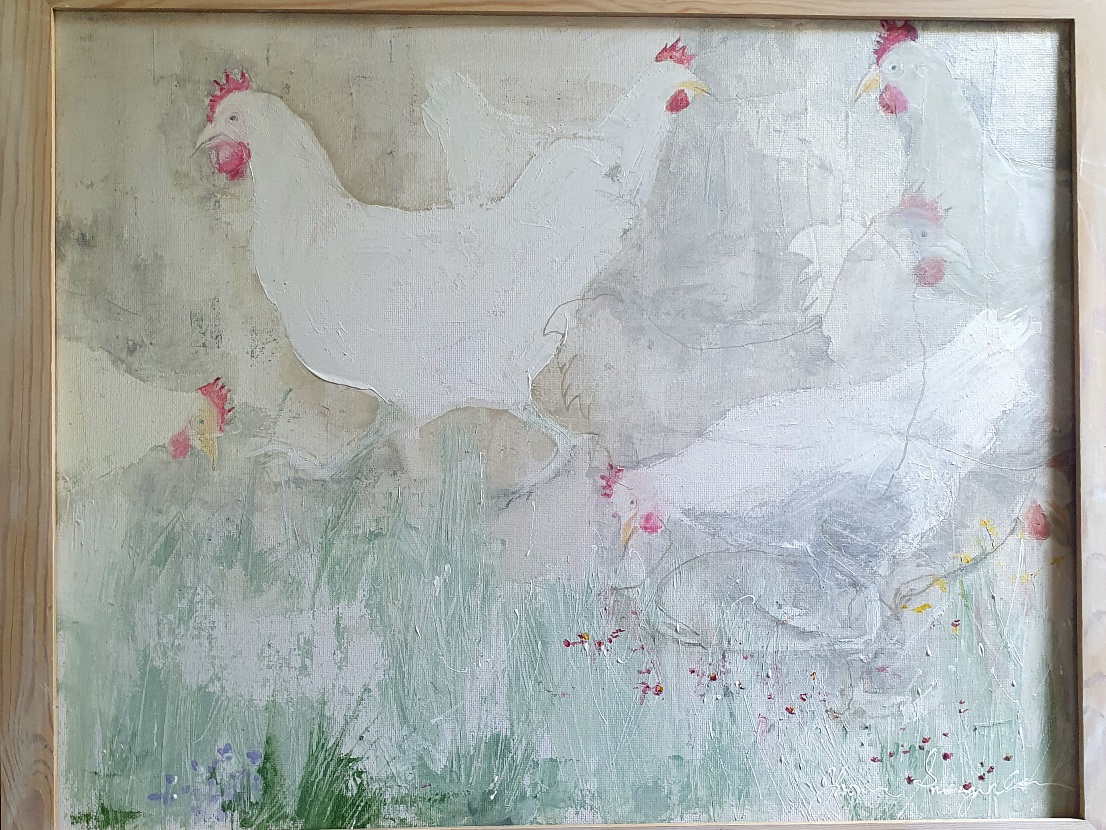 Obrazek/ilustracja w pastelowej tonacji, sielskie kury na łące, w drewnianej ramce rozbielonej woskiem. Subtelna dekoracja do kuchni lub dziecięcego pokoju 🙂