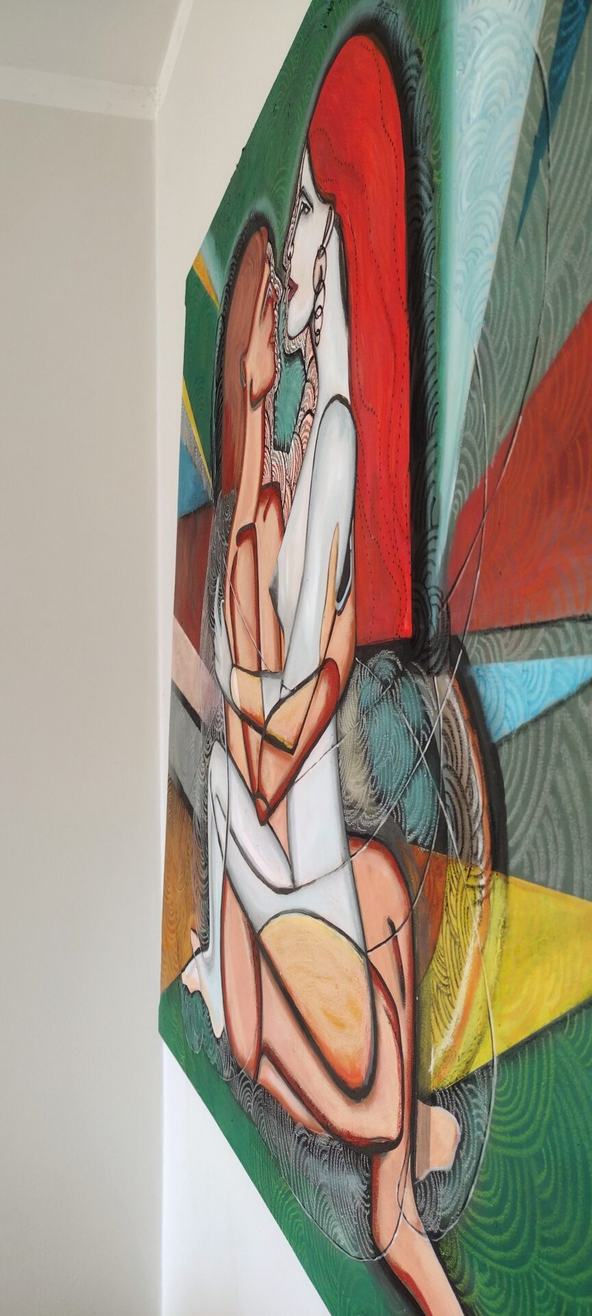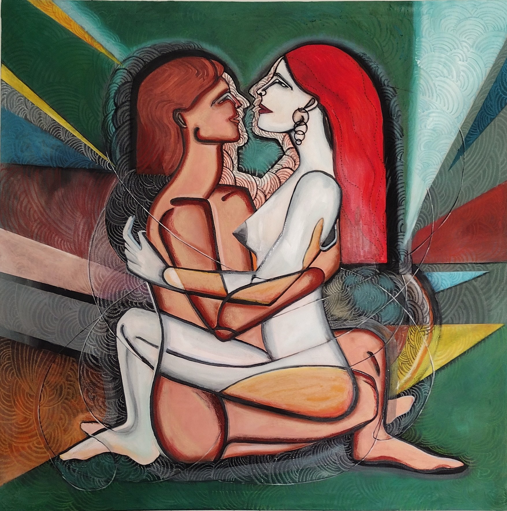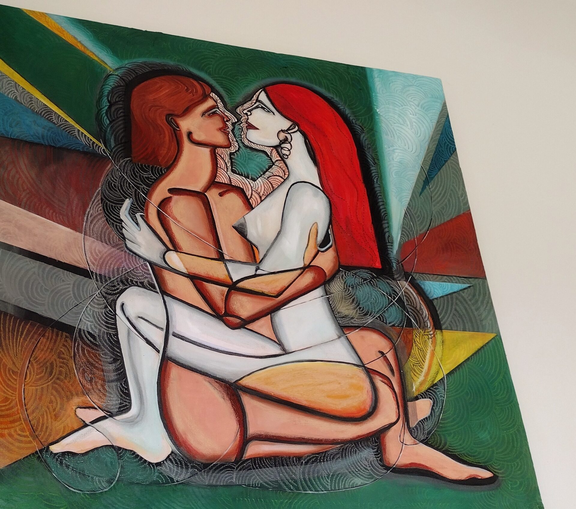 Obraz-akt przedstawiający parę kochanków ,zmysłowość uzupełniona kolorami.