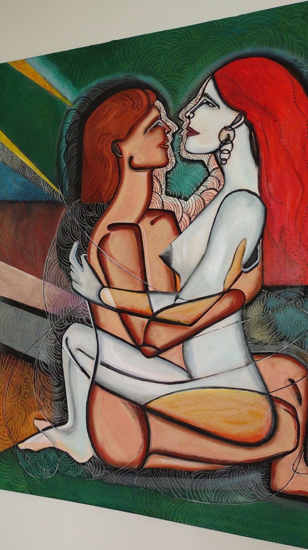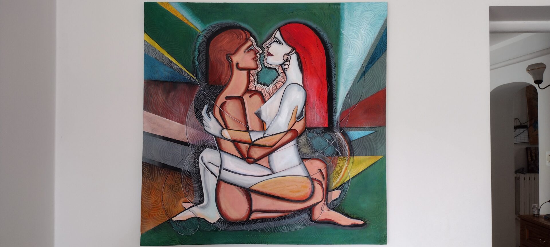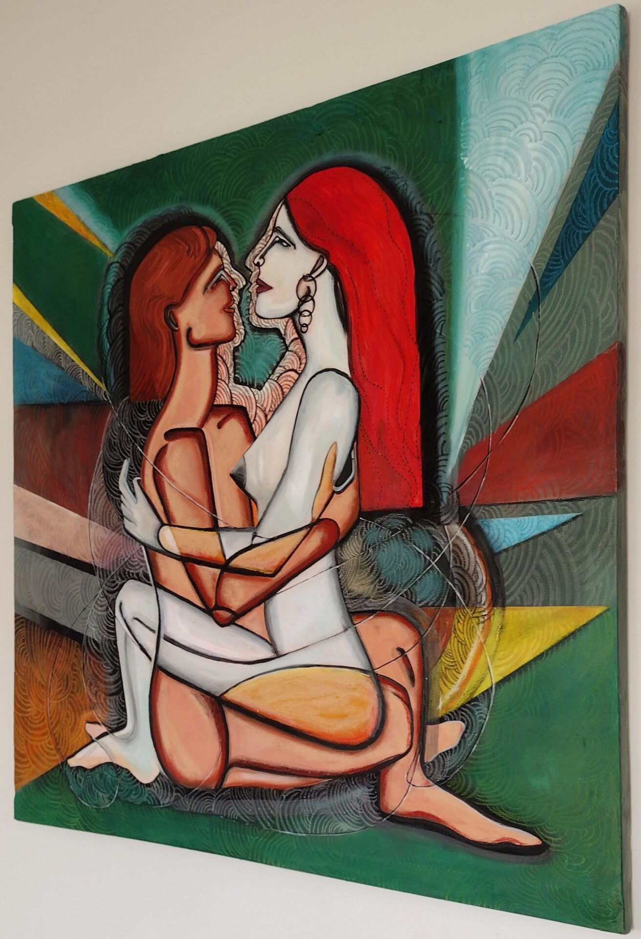 Obraz-akt przedstawiający parę kochanków ,zmysłowość uzupełniona kolorami.