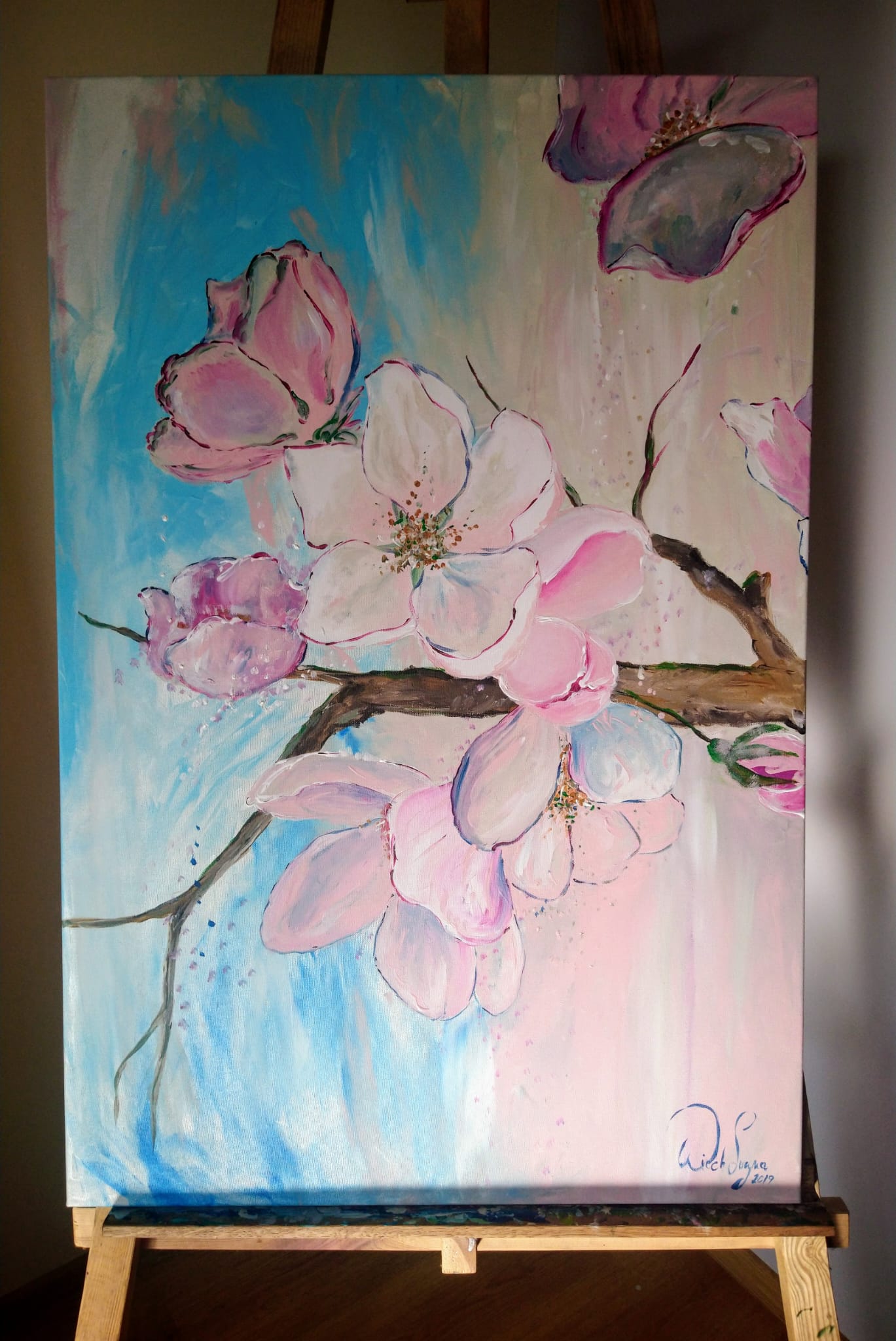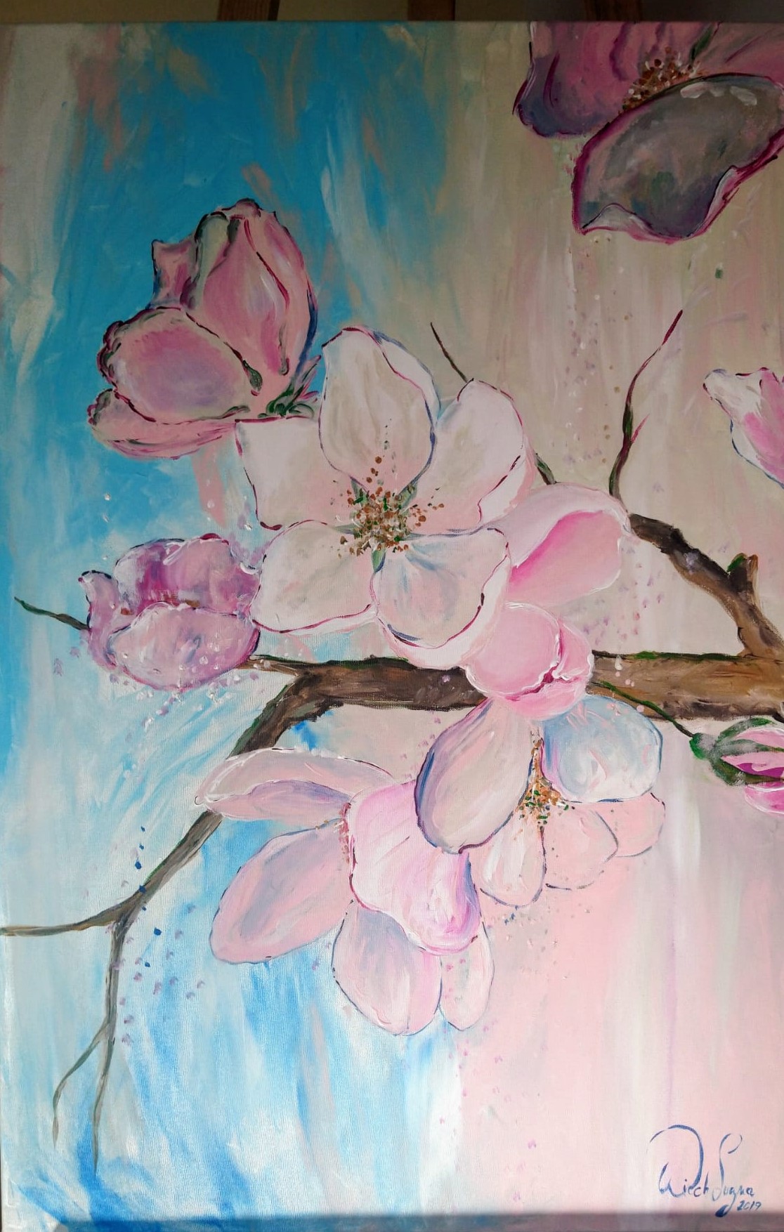Akryl na płótnie. Obraz namalowany w roku 2019, wczesną wiosną, powstał z tęsknoty za światłem, kwiatami i budzącą się do życia naturą.