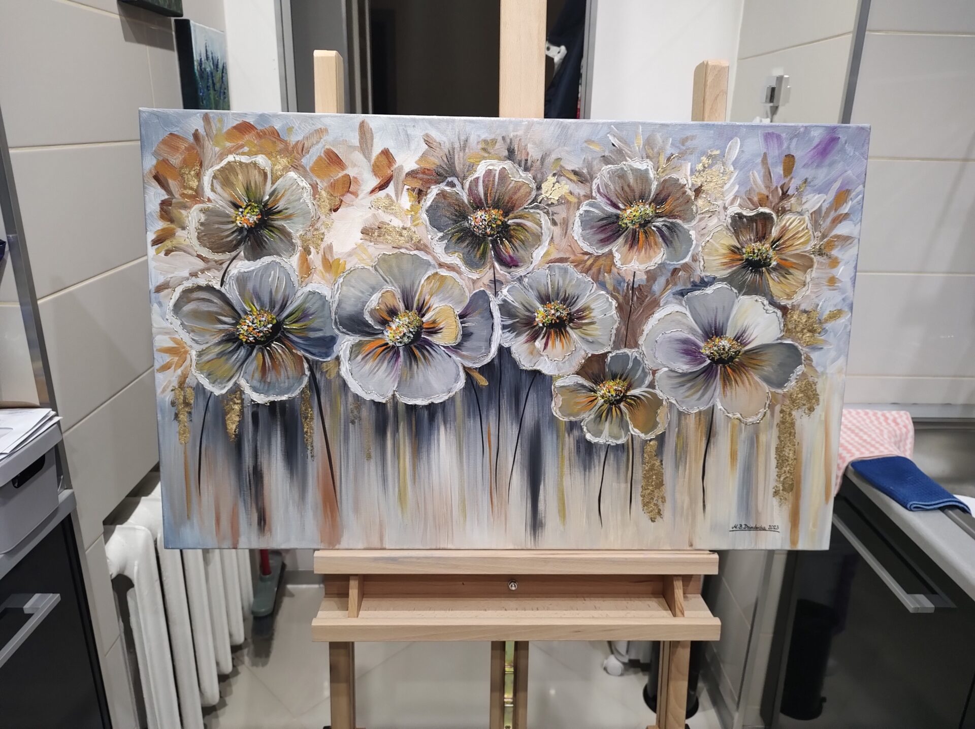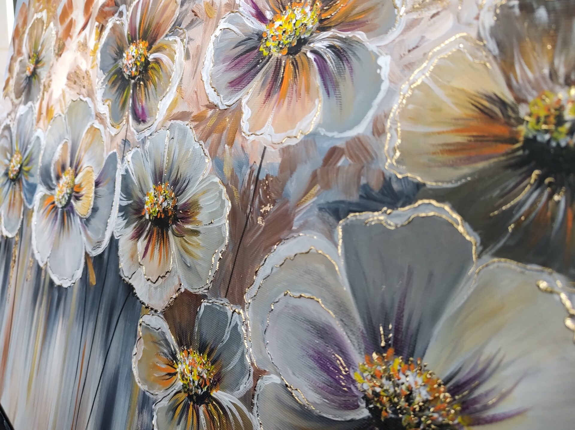 Przedstawiam nowoczesny obraz mojego autorstwa, namalowany profesjonalnymi farbami akrylowymi firm: Winsor & Newton, Amsterdam oraz Liquitex, na podobraziu bawełnianym o wymiarach 80 x 50 cm, pokryte płótnem włoskim o doskonałej jakości. Obraz zawiera złote elementy, m.in. złoto płatkowe, które świecą w zależności od kąta padania światła. Obraz prezentuje się bardzo oryginalnie i przykuwa swoją uwagę. Dzięki odpowiednio dobranym barwom będzie pasował do większości pomieszczeń. Kolorystyka użyta do stworzenia obrazu (odcienie): złota, bieli, brązu, szarości, grafitu, czerni, pomarańczu, fioletu. Obraz został zabezpieczony i wykończony werniksem. Podpis autora znajduje się na awersie. Obraz wysyłam tylko za pośrednictwem Poczty Polskiej, jako przesyłkę priorytetową wraz z ubezpieczeniem. Istnieje również możliwość osobistego odbioru.