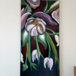 Kompozycja kwiatowa malowana dobrej jakości akrylami na dużym (120×60) płótnie bawełnianym profesjonał. Obraz posiada zamalowane boki co pozwala na ekspozycje bez ramy, i jest werniksowany. Obraz ze względu na rozmiar bardzo ładnie prezentuje się np. w dużym salonie czy holu, na jasnej lub ciemnej ścianie, dodając wnętrzu elegancji. Na odwrocie moja sygnatura.