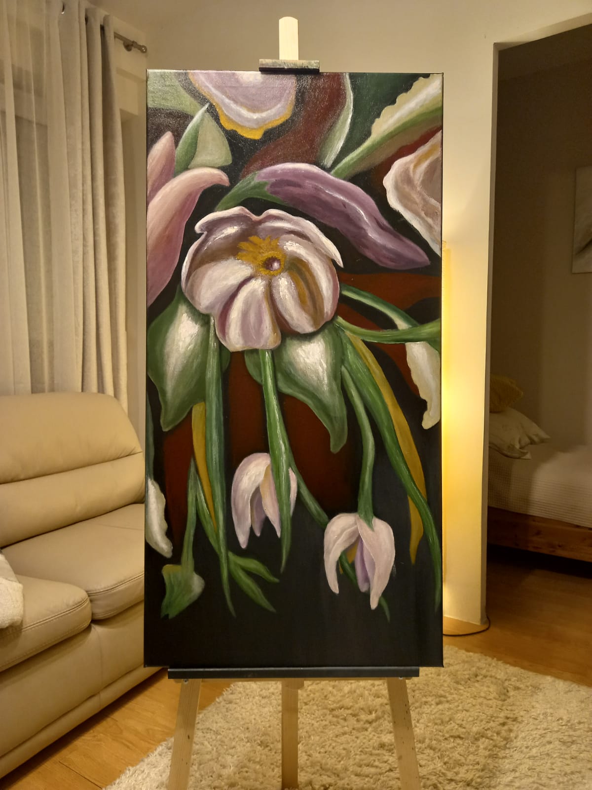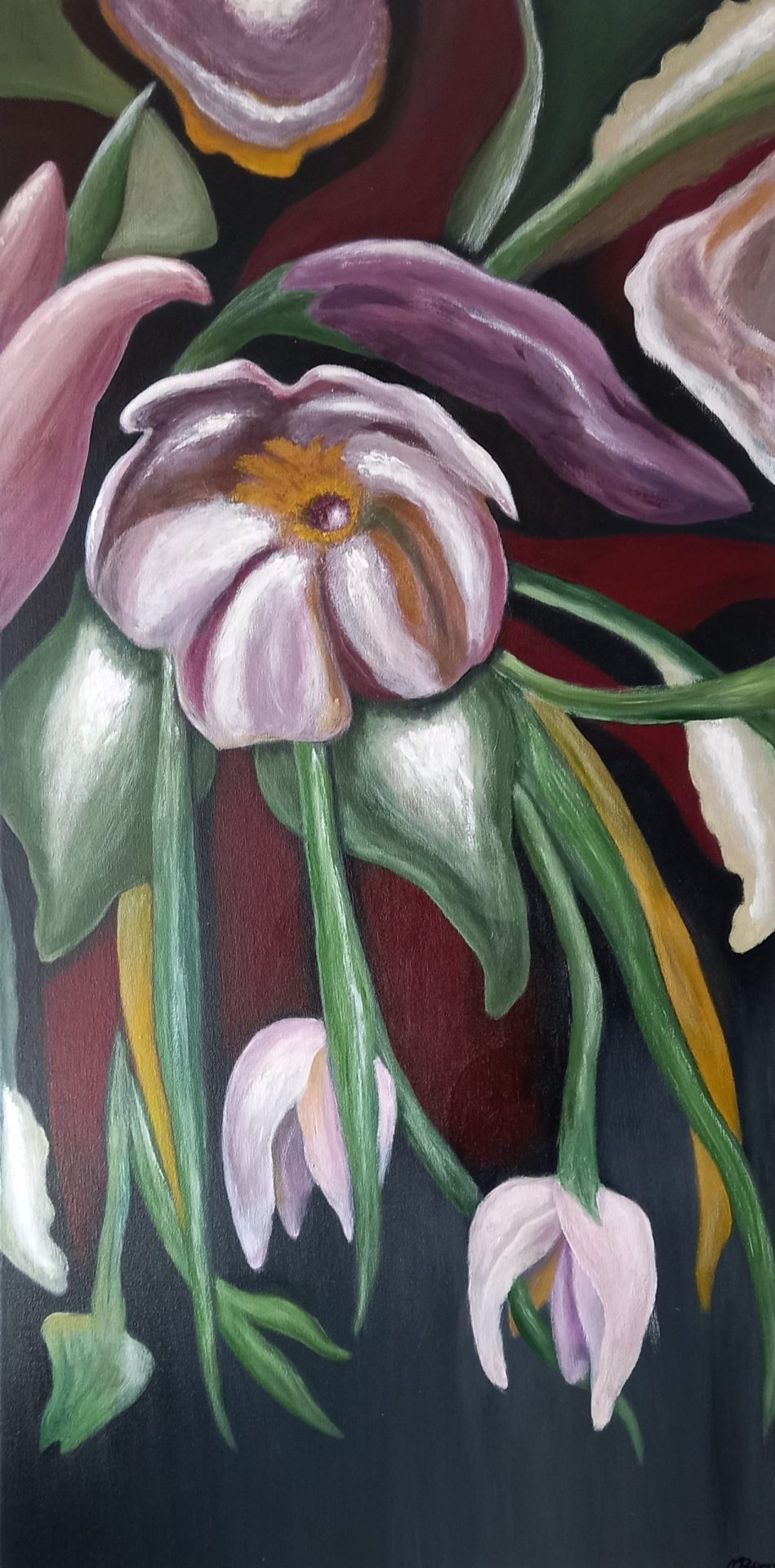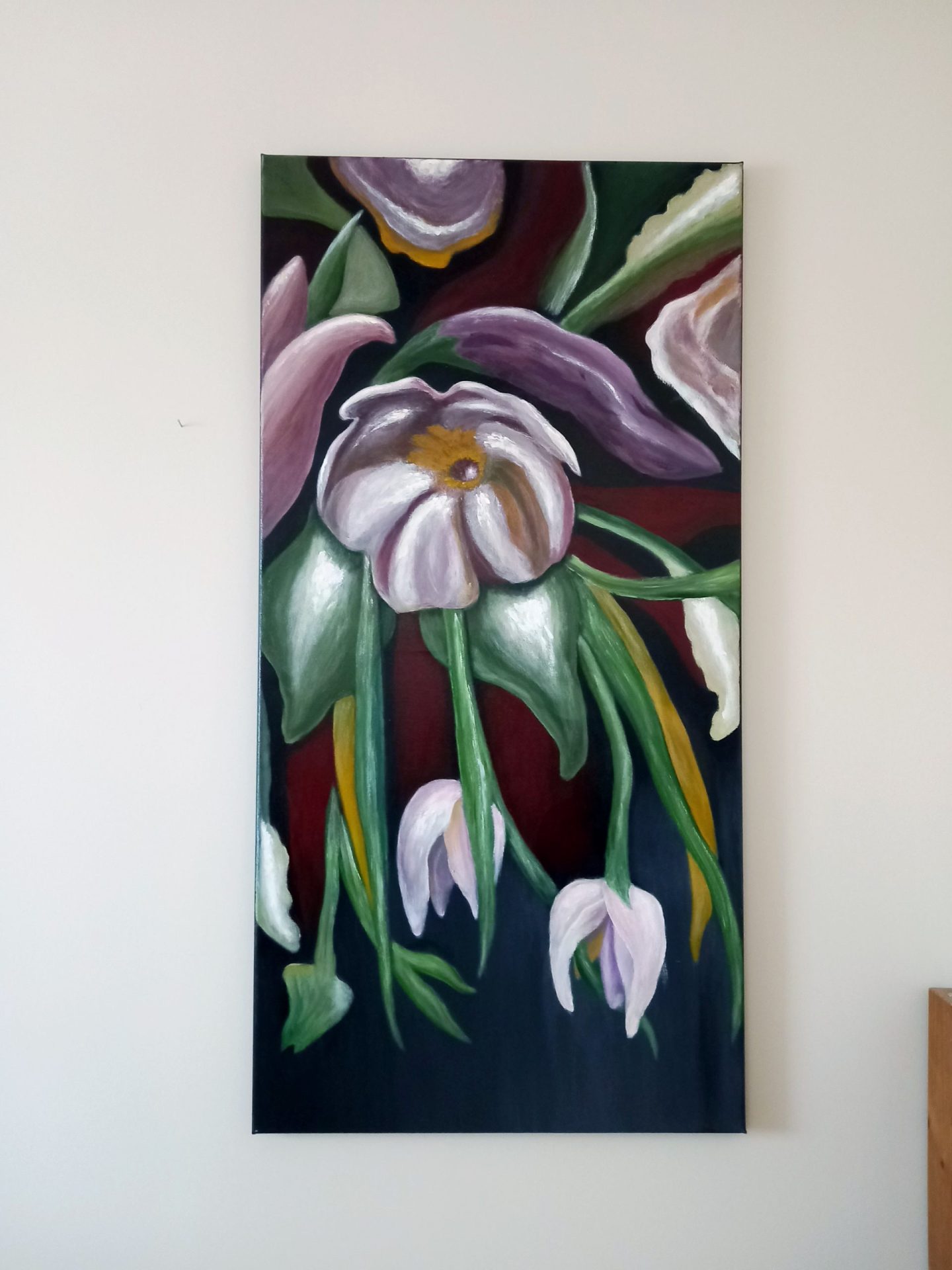 Kompozycja kwiatowa malowana dobrej jakości akrylami na dużym (120×60) płótnie bawełnianym profesjonał. Obraz posiada zamalowane boki co pozwala na ekspozycje bez ramy, i jest werniksowany. Obraz ze względu na rozmiar bardzo ładnie prezentuje się np. w dużym salonie czy holu, na jasnej lub ciemnej ścianie, dodając wnętrzu elegancji. Na odwrocie moja sygnatura.
