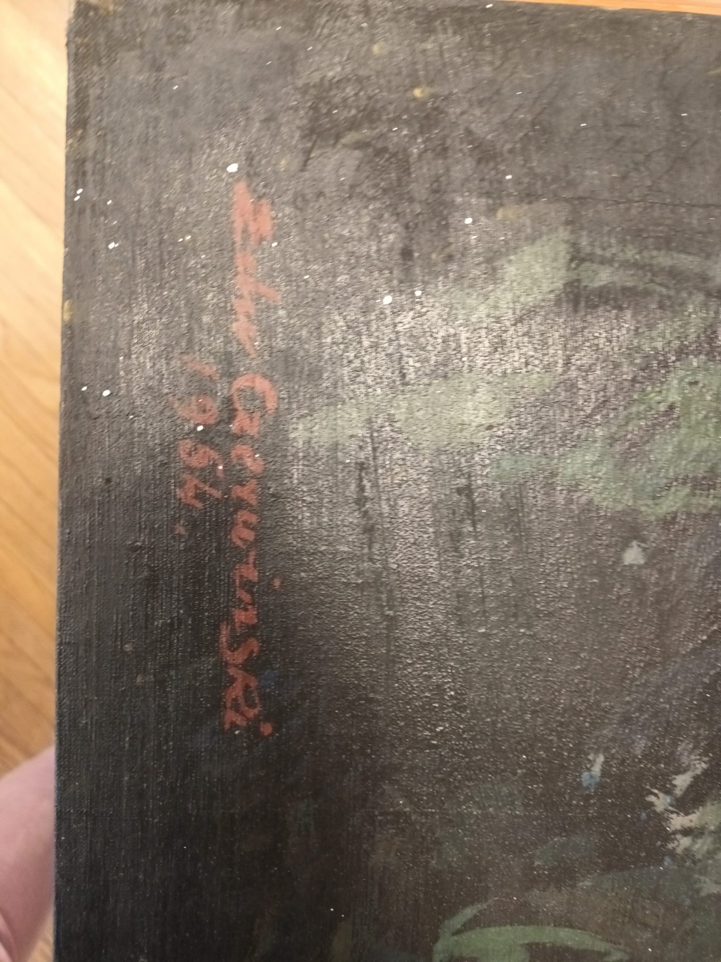 Dzieło przedstawiające kwiaty Edwarda Czerwińskiego z 1954. Płótno. Kolory ciemne, przekaz tajemniczości i melancholii. Obraz do lekkiej konserwacji.