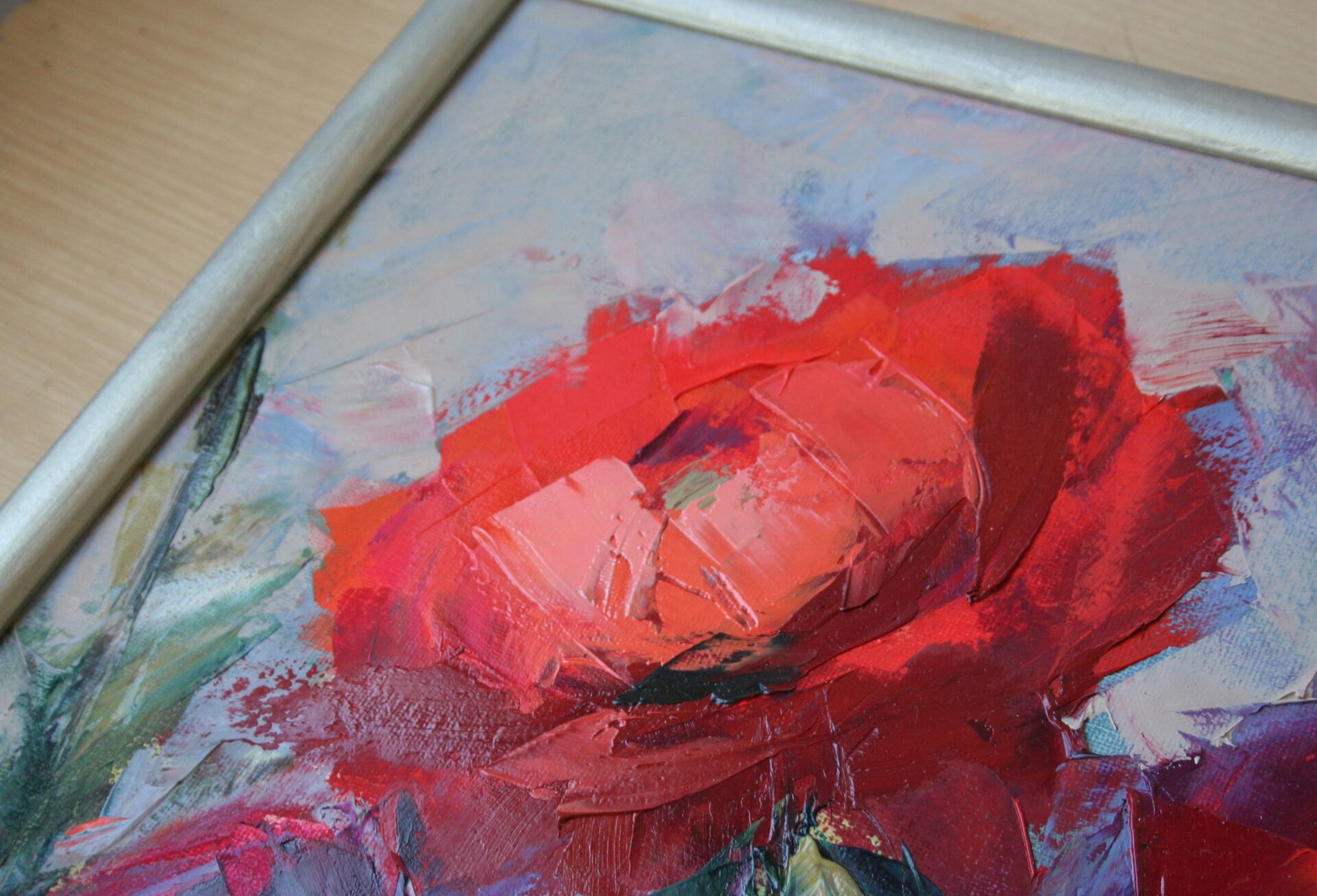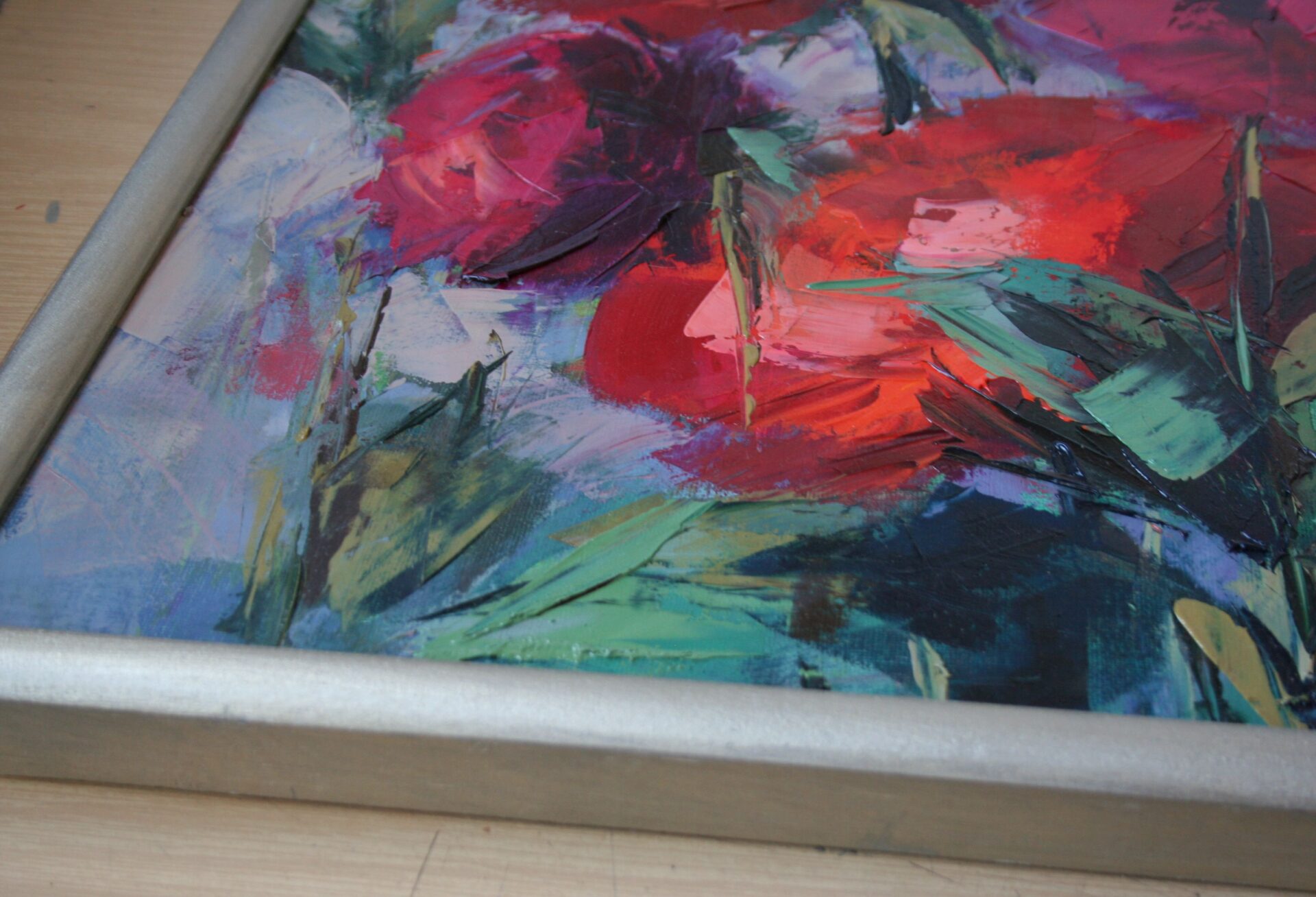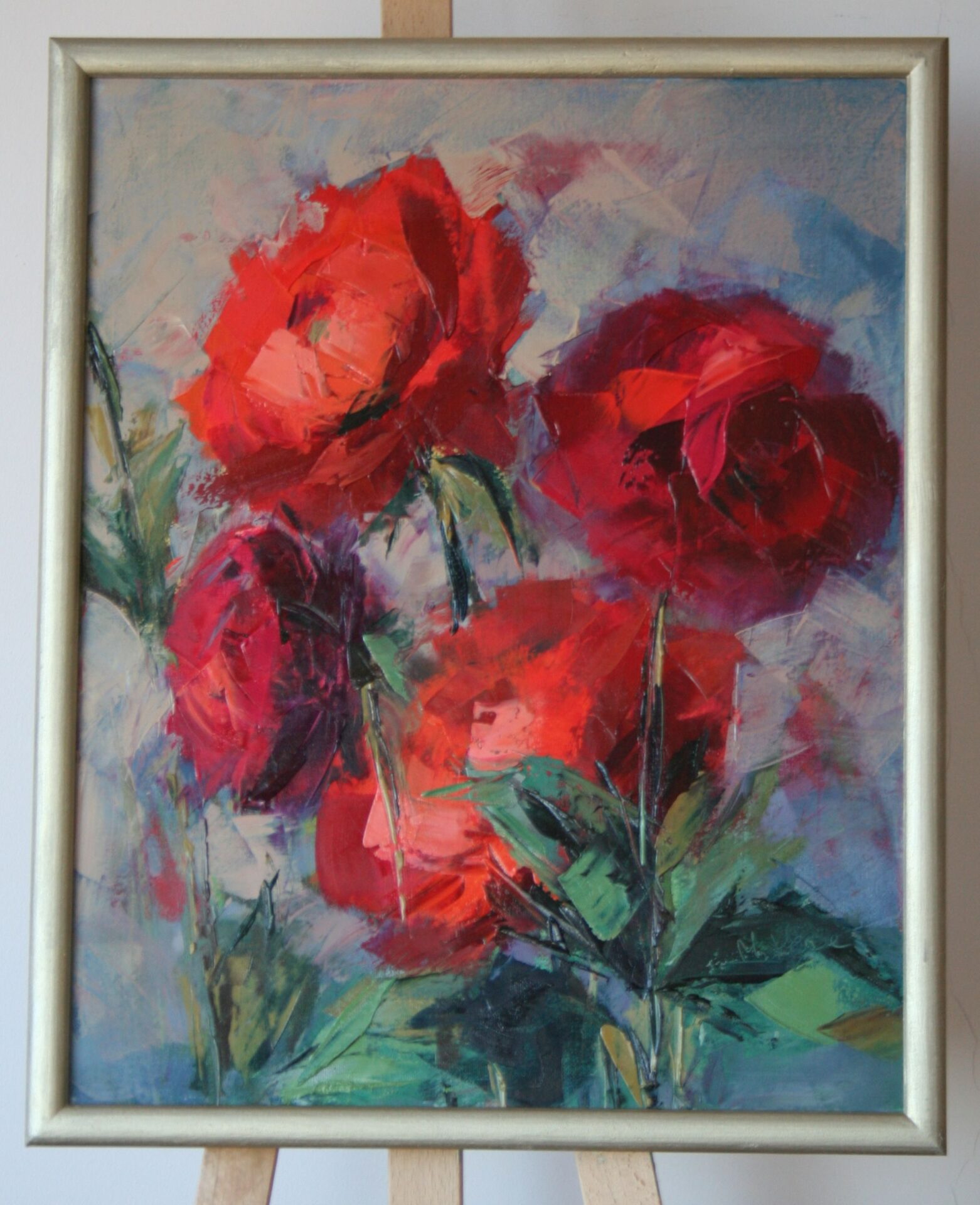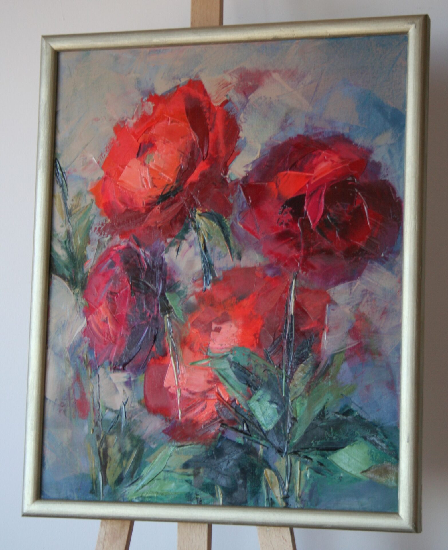 Przedstawiam obraz olejny na płótnie, malowany za pomocą szpachli, posiada fakturę. Obraz jest oprawiony w drewnianą ramę w kolorze starego złota ( srebrno – złoty). Rozmiar płótna 40cm x 50 cm, z ramą 43cm x 53cm.