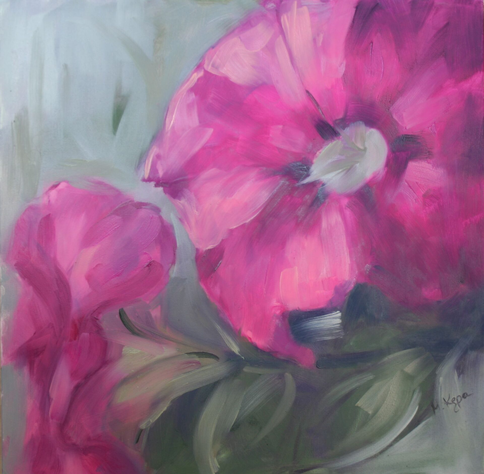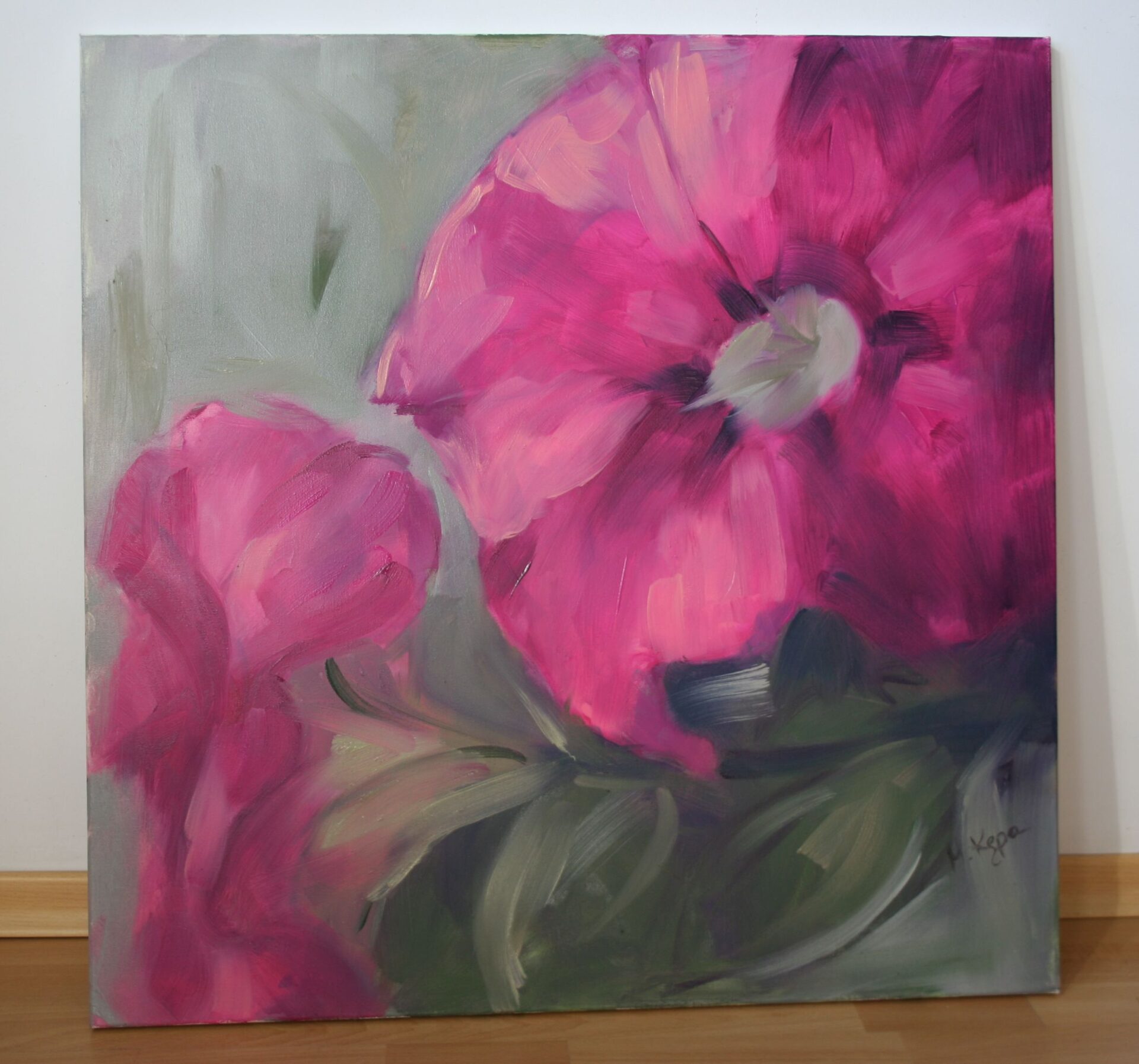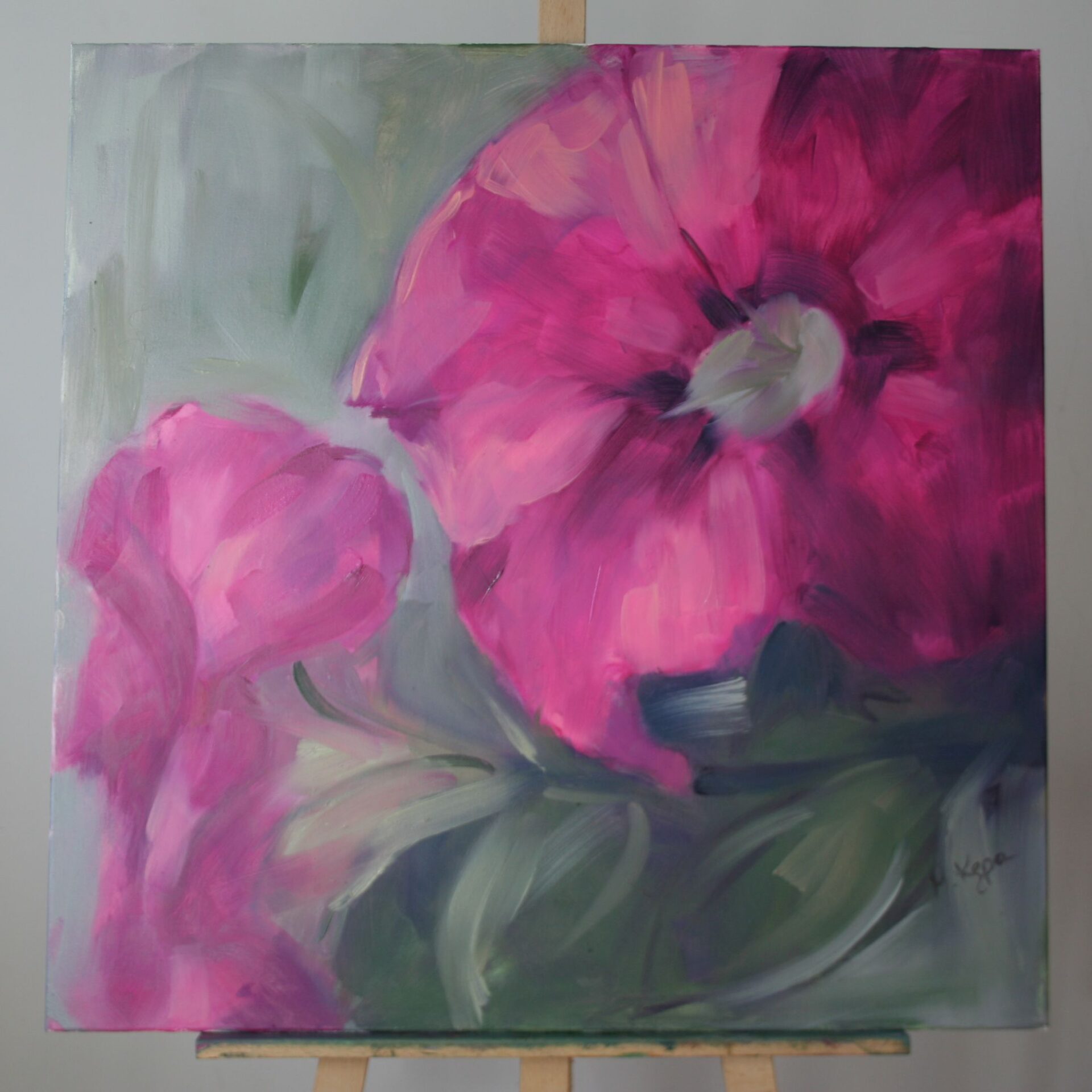 Duży obraz olejny przedstawiający kwiaty w skali makro. Obraz został namalowany farbami olejnymi na płótnie. Rozmiar 70cm x 70cm.