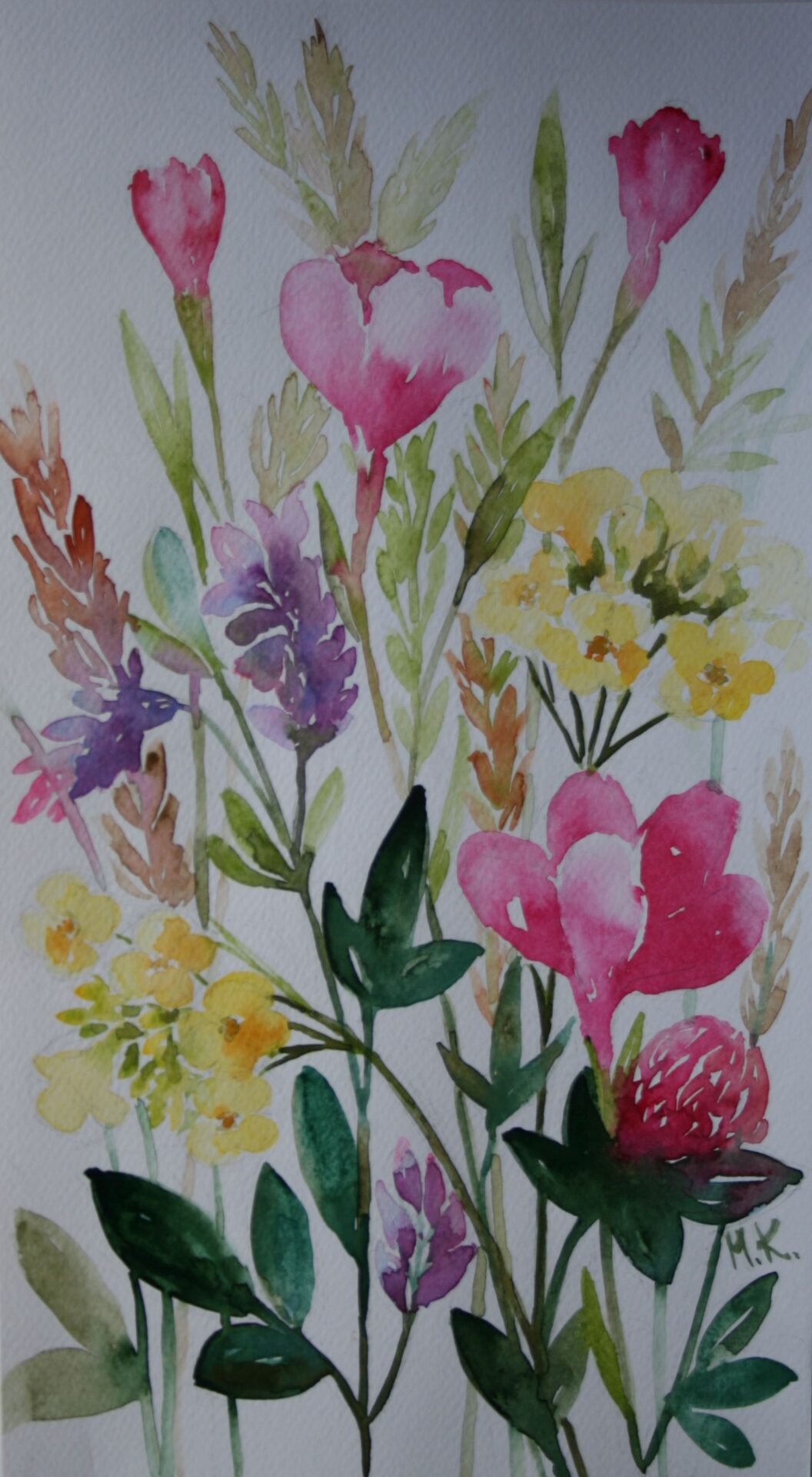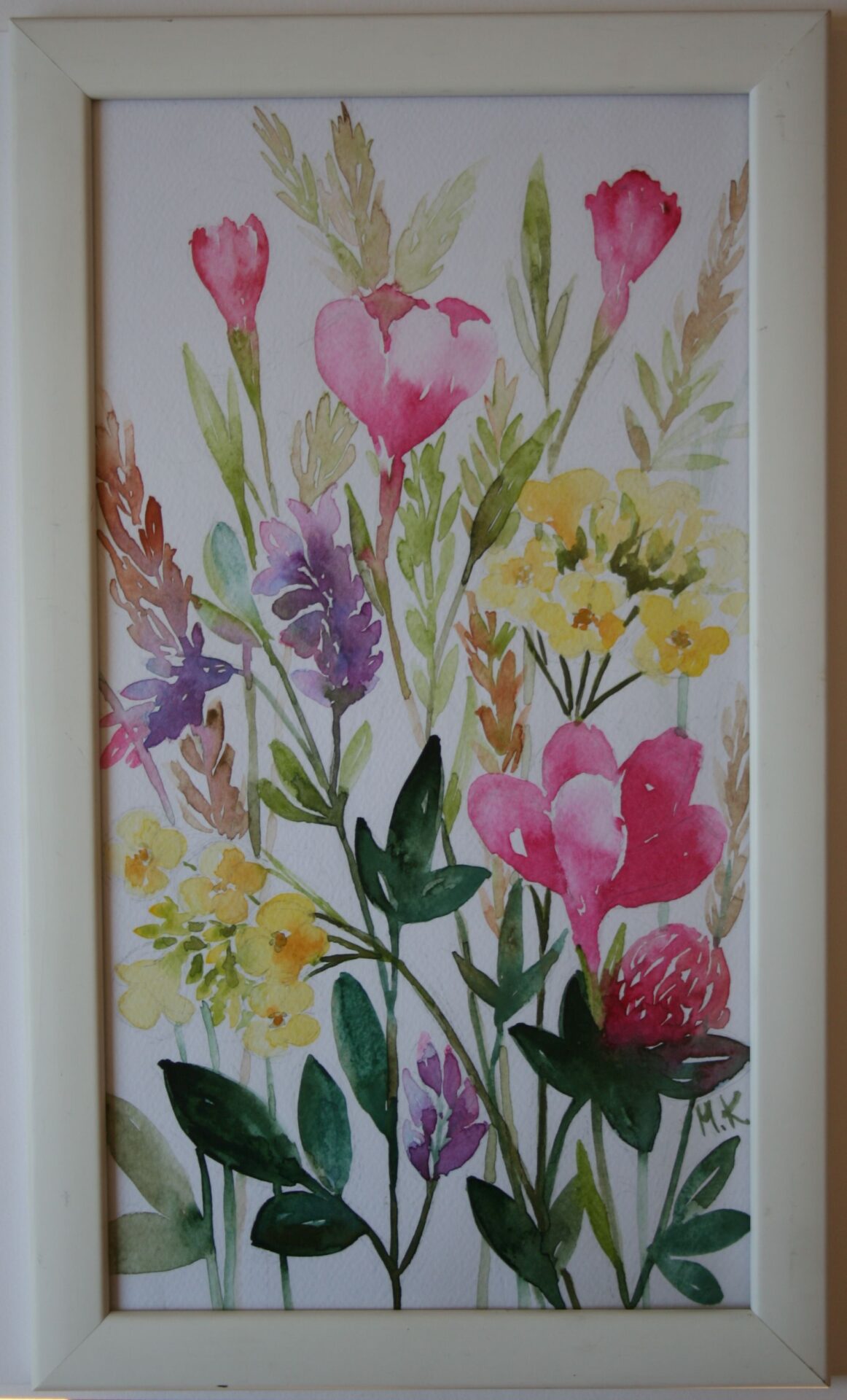 Akwarela przedstawiająca letnie kwiaty polne, namalowana na papierze typu Fabriano 270g, Rozmiar obrazu 23cm x 39cm. Praca oprawiona (za szkłem) w delikatną ramkę.