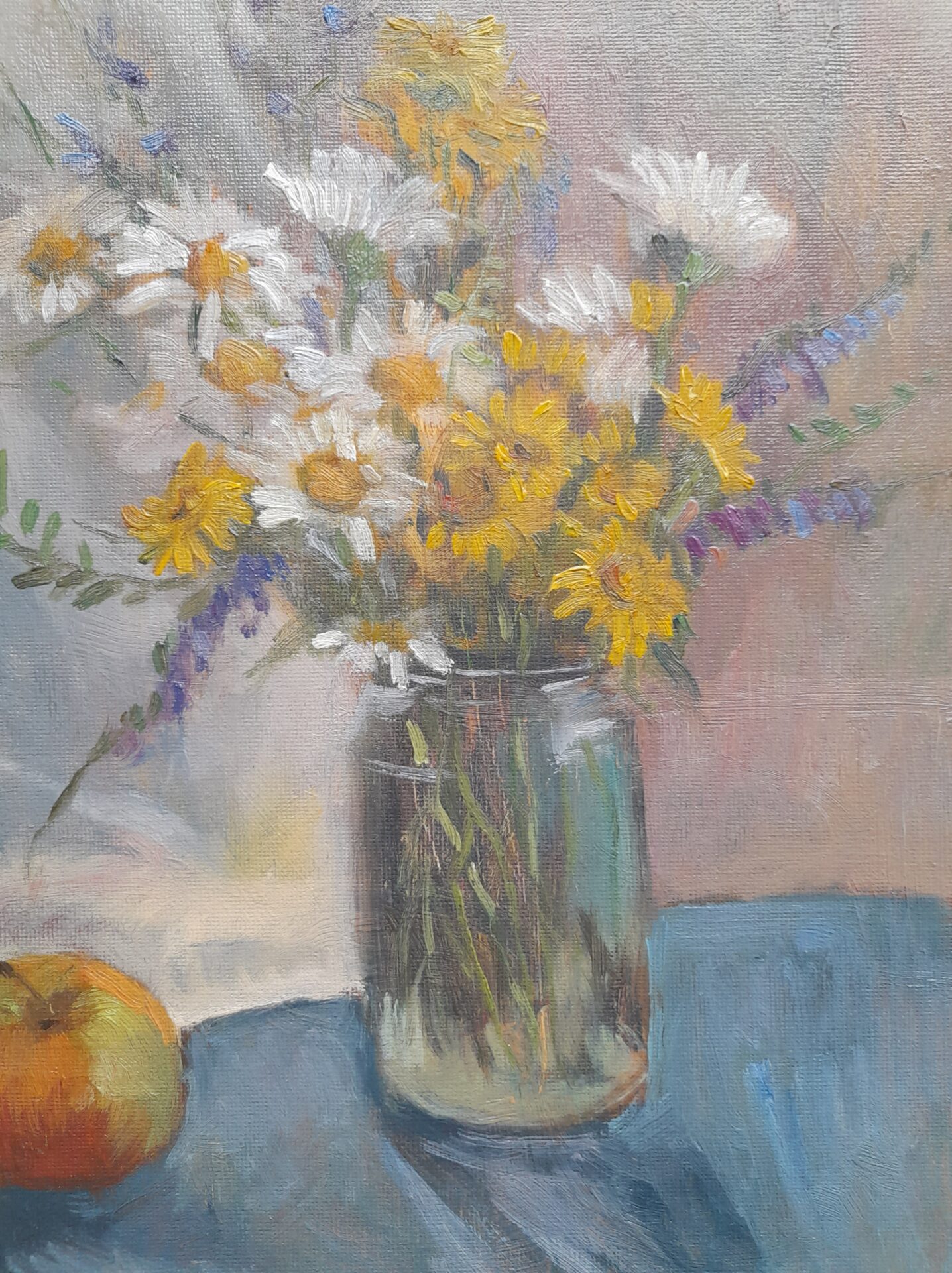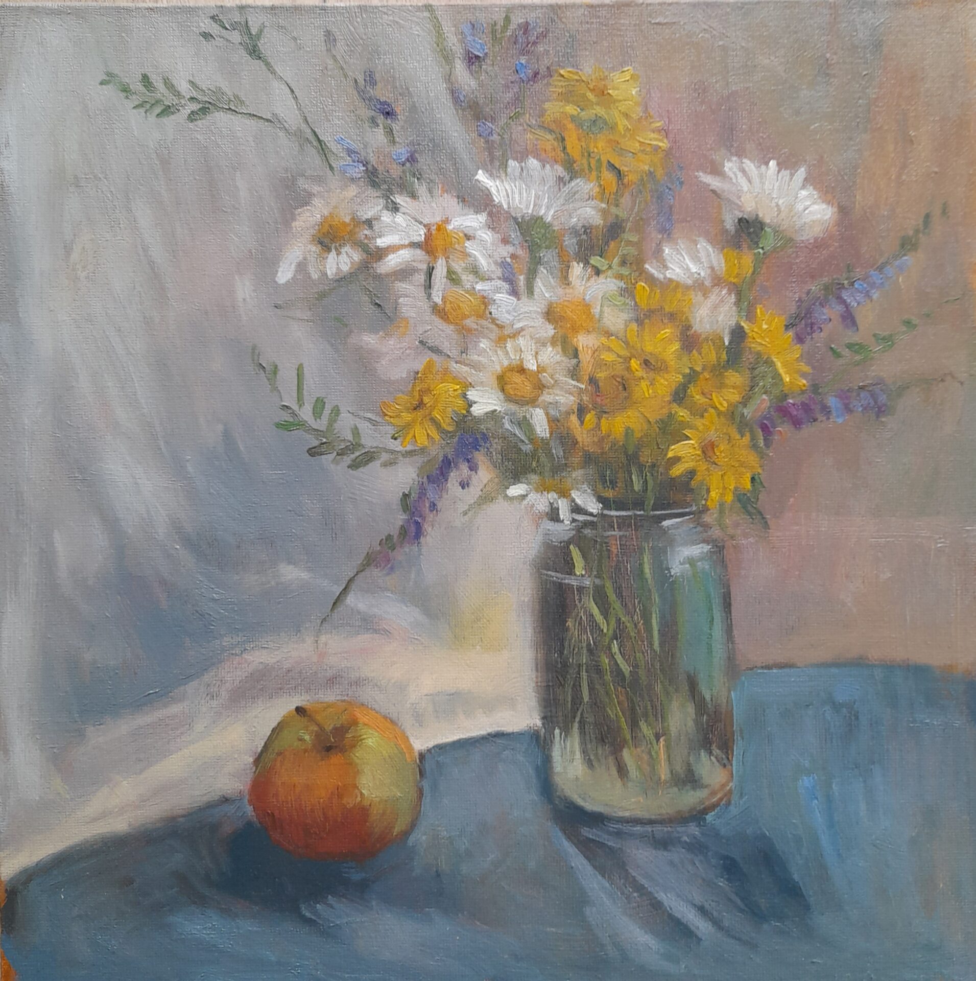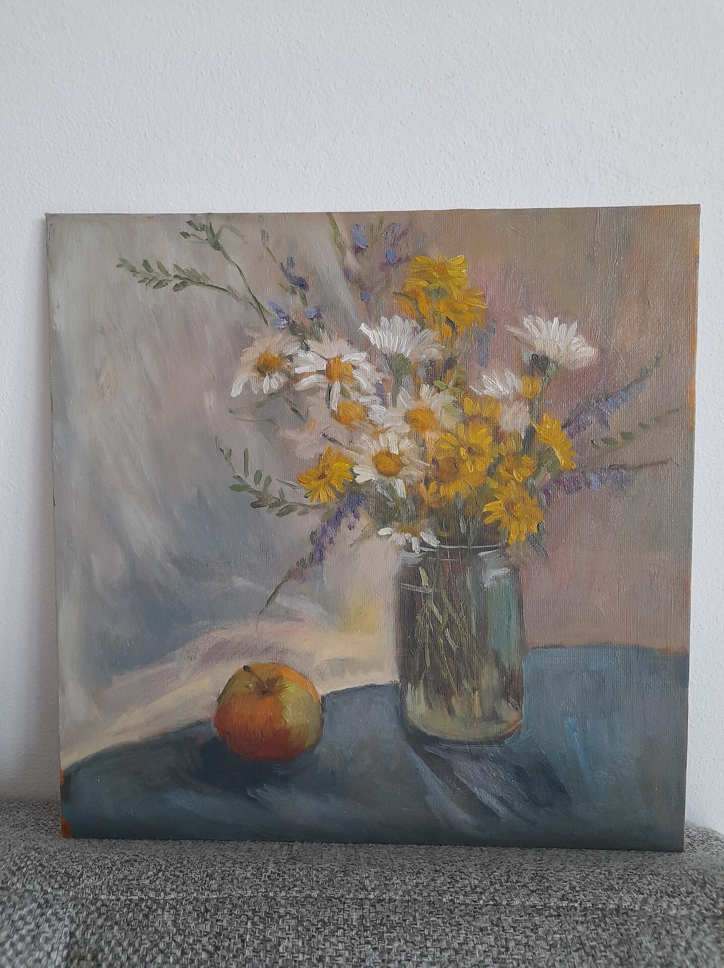 kwiaty polne. Ta martwa natura, namalowana z natury, przedstawia skromny bukiet pospolitych kwiatów polnych z pola niedaleko mojego domu. Odzwierciedla chwilę piękna i wygody codziennego życia.