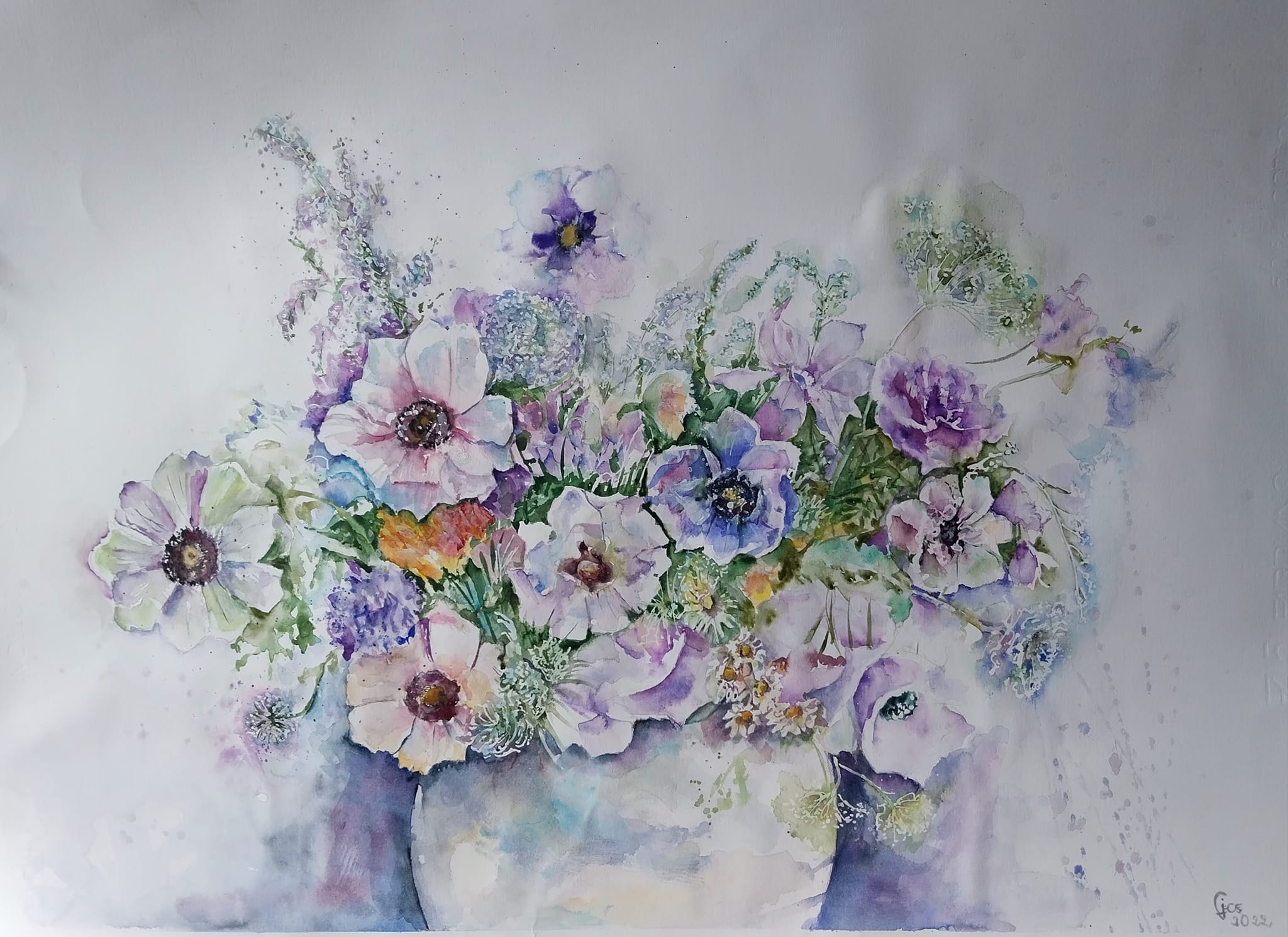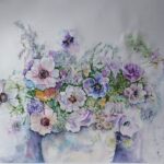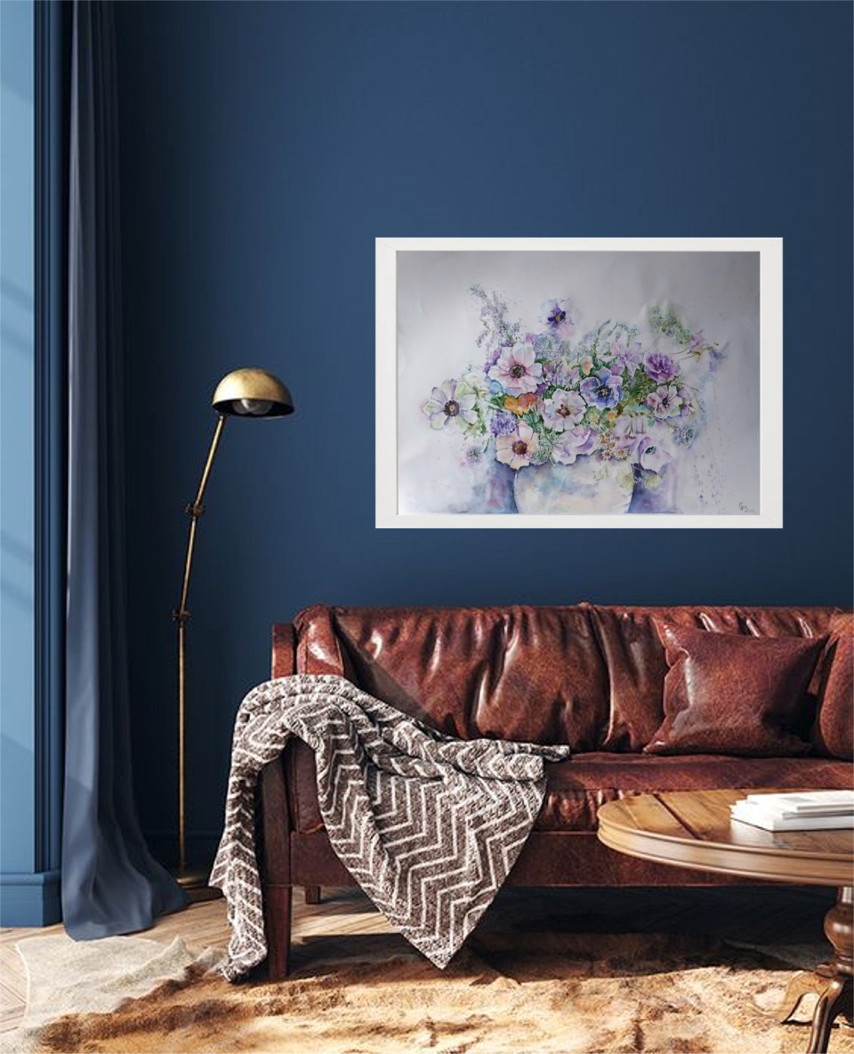 Bukiet kwiatów w wazonie o wymiarach 50 x 70 cm wykonany został techniką akwarelową. W odpowiednio dobranej ramie będzie stanowił przyjemną dla oka dekorację ściany. Zapraszam.