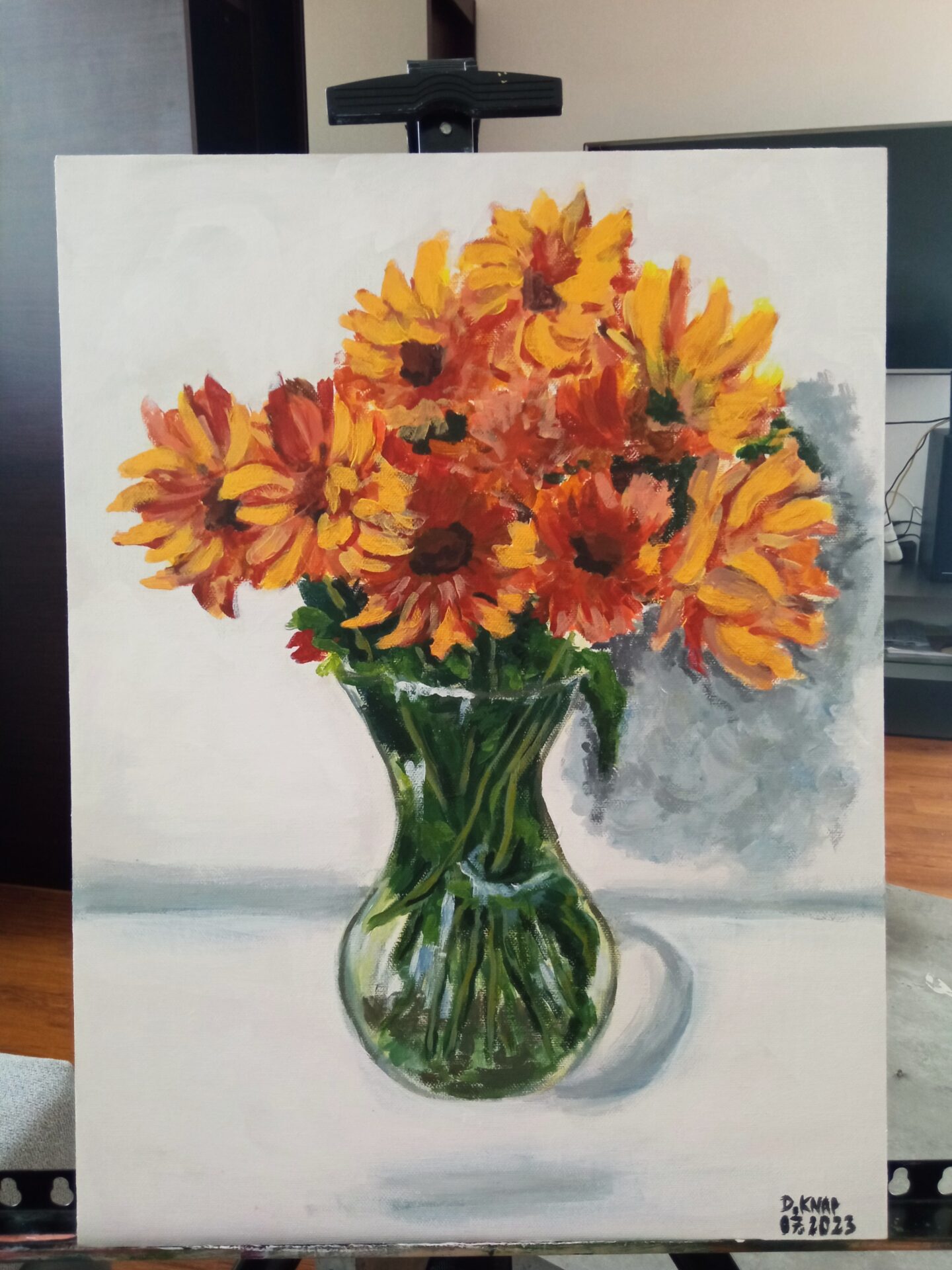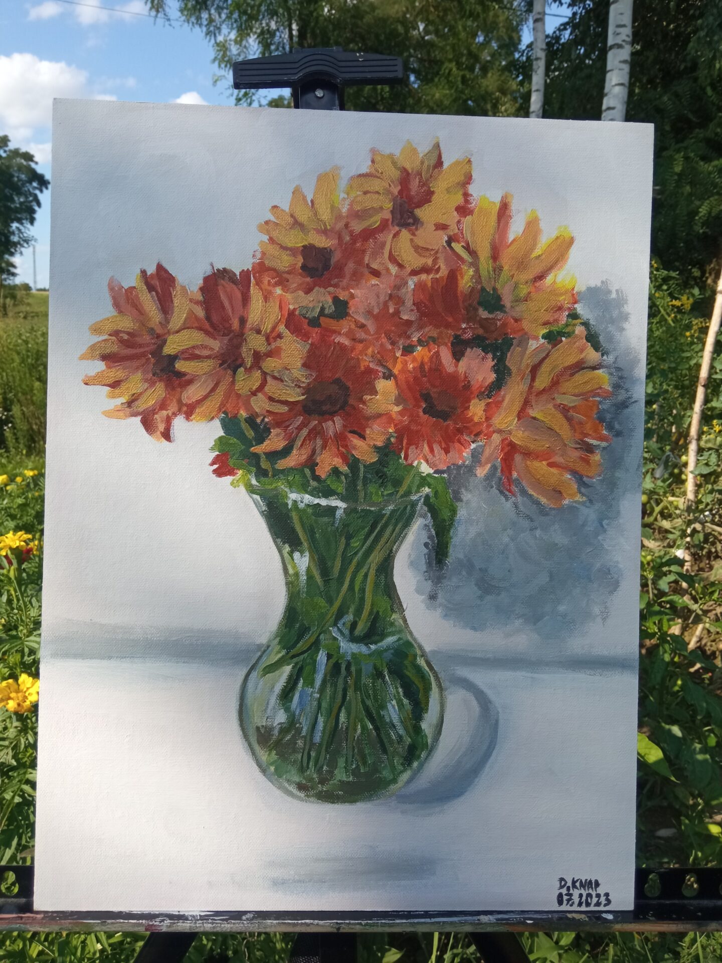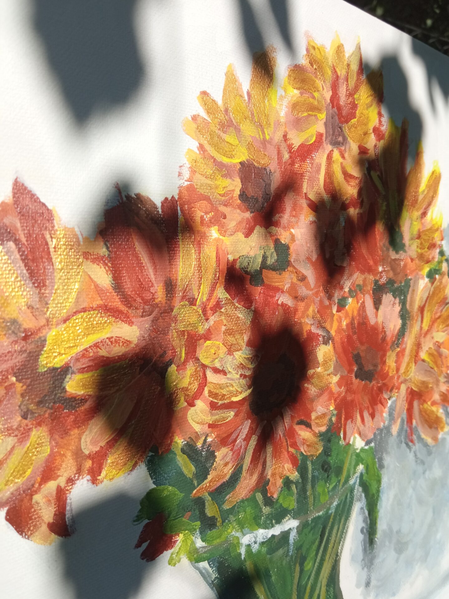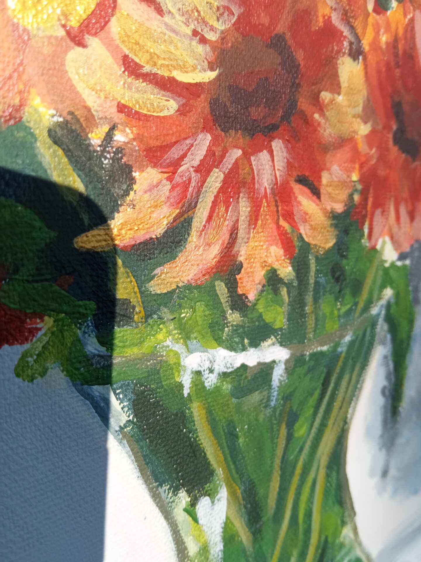 Farby akrylowe na panelu malarskim ze złotą farba,którą widać na zbliżeniach ,nie mogłam się powstrzymać by nie uwiecznić na obrazie mojego pięknego bukietu
