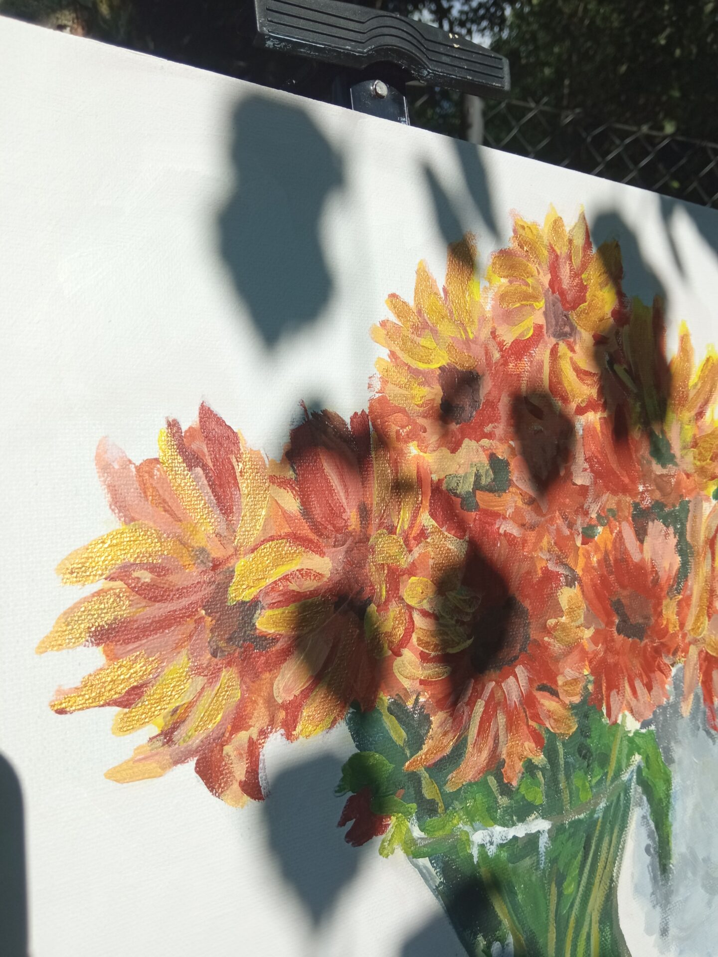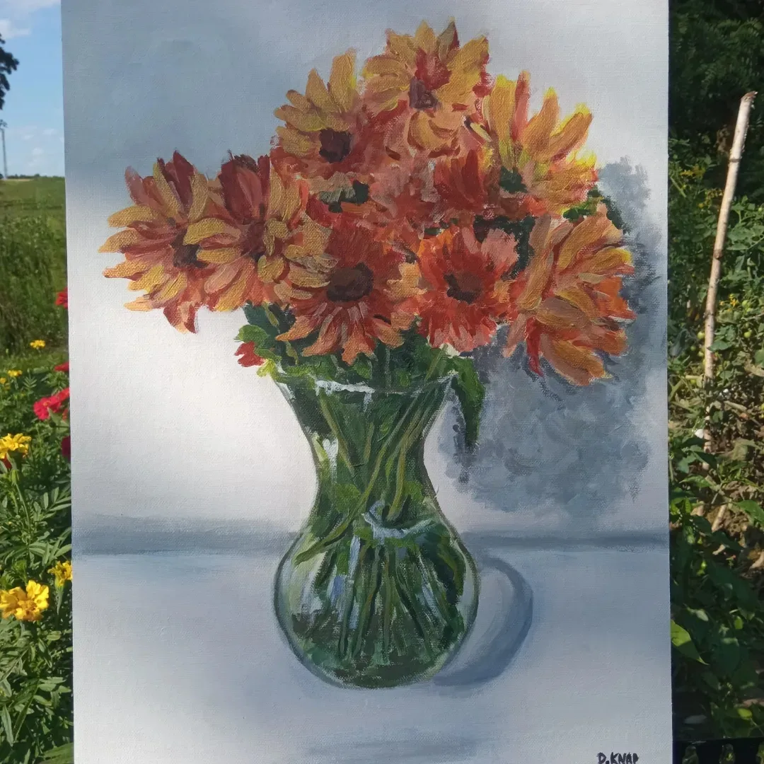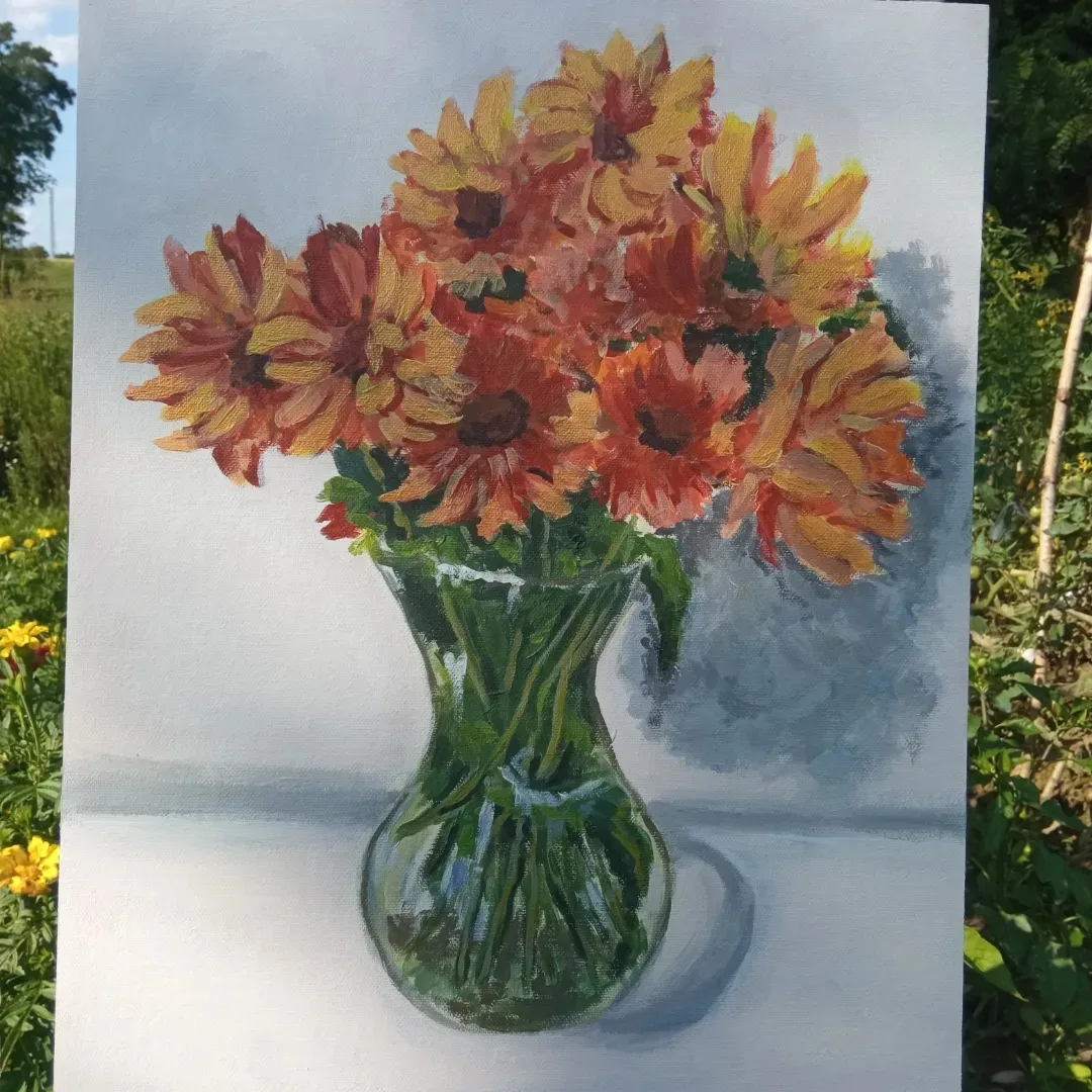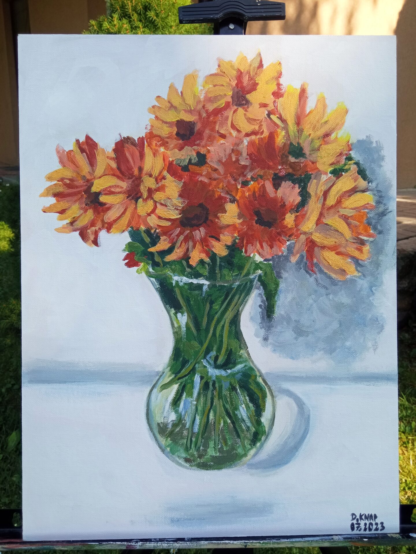 Farby akrylowe na panelu malarskim ze złotą farba,którą widać na zbliżeniach ,nie mogłam się powstrzymać by nie uwiecznić na obrazie mojego pięknego bukietu