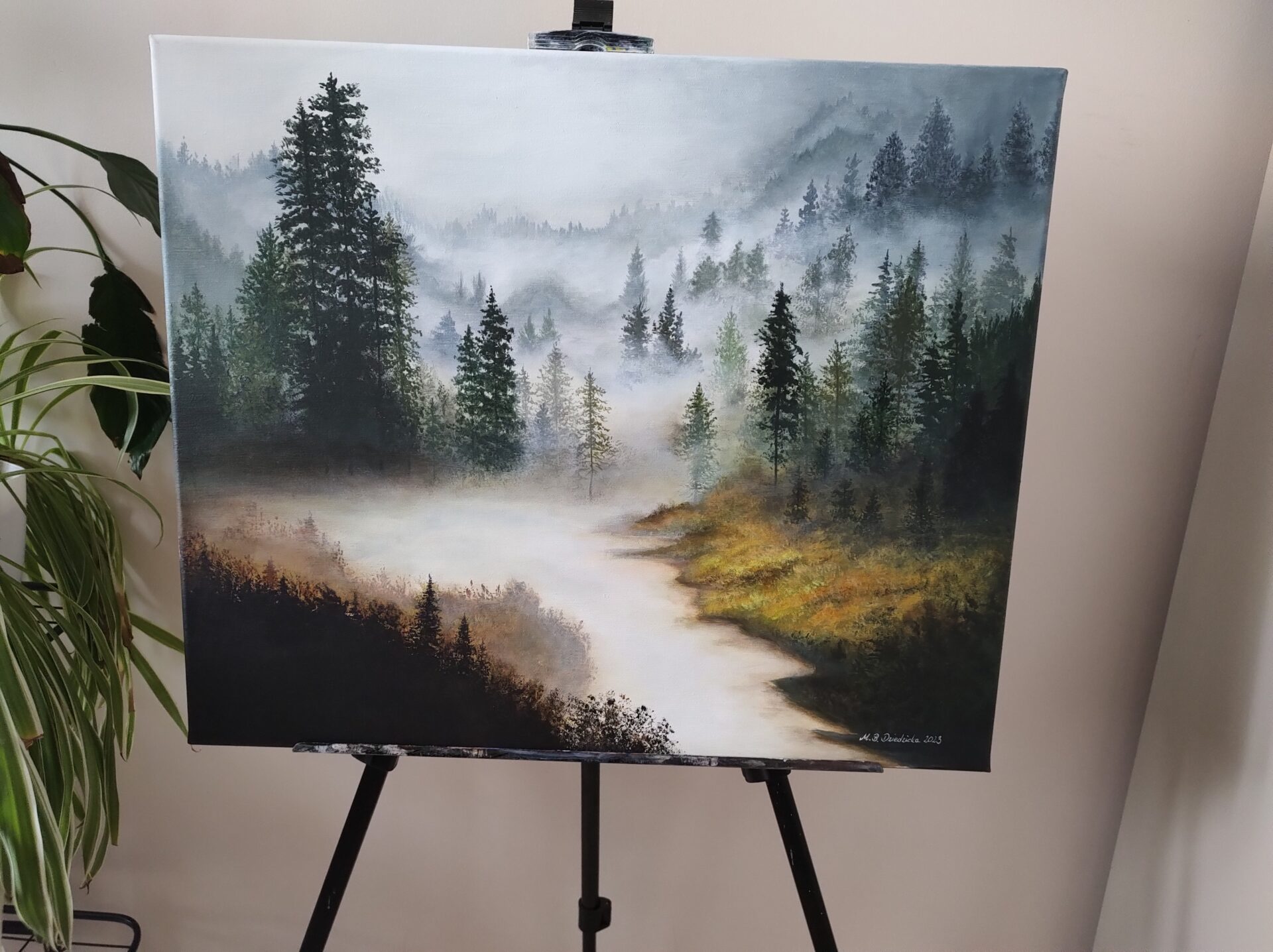 Przedstawiam obraz mojego autorstwa, namalowany profesjonalnymi farbami akrylowymi na bawełnianym, włoskim płótnie o doskonałej jakości, naciągniętym na blejtram (krosno). Boki pracy zostały zamalowane zgodnie z kolorystyką całości. Wykończony werniksem z połyskiem. Obraz nie wymaga oprawy, można powiesić go na ścianie. Wymiary: 50 x 60 cm. Szerokość blejtramy: ok. 2 cm. Podpis autora znajduje się na awersie i rewersie.