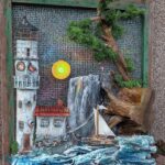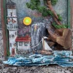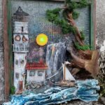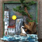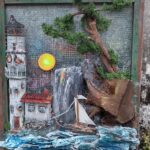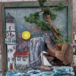 Przedstawiam rękodzielniczy obraz wykonany z naturalnych surowców przedstawiający Latarnie morską o zachodzie słońca.