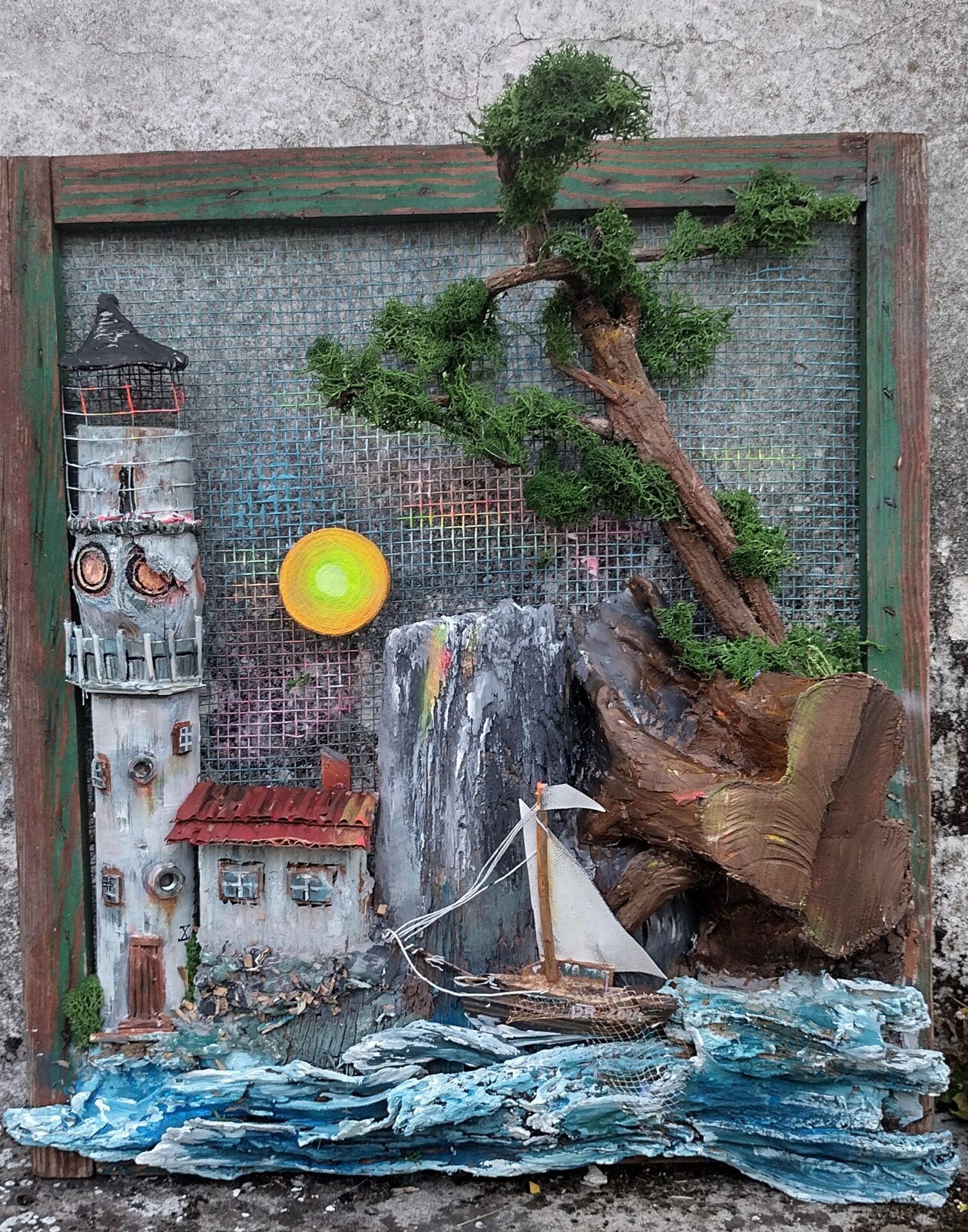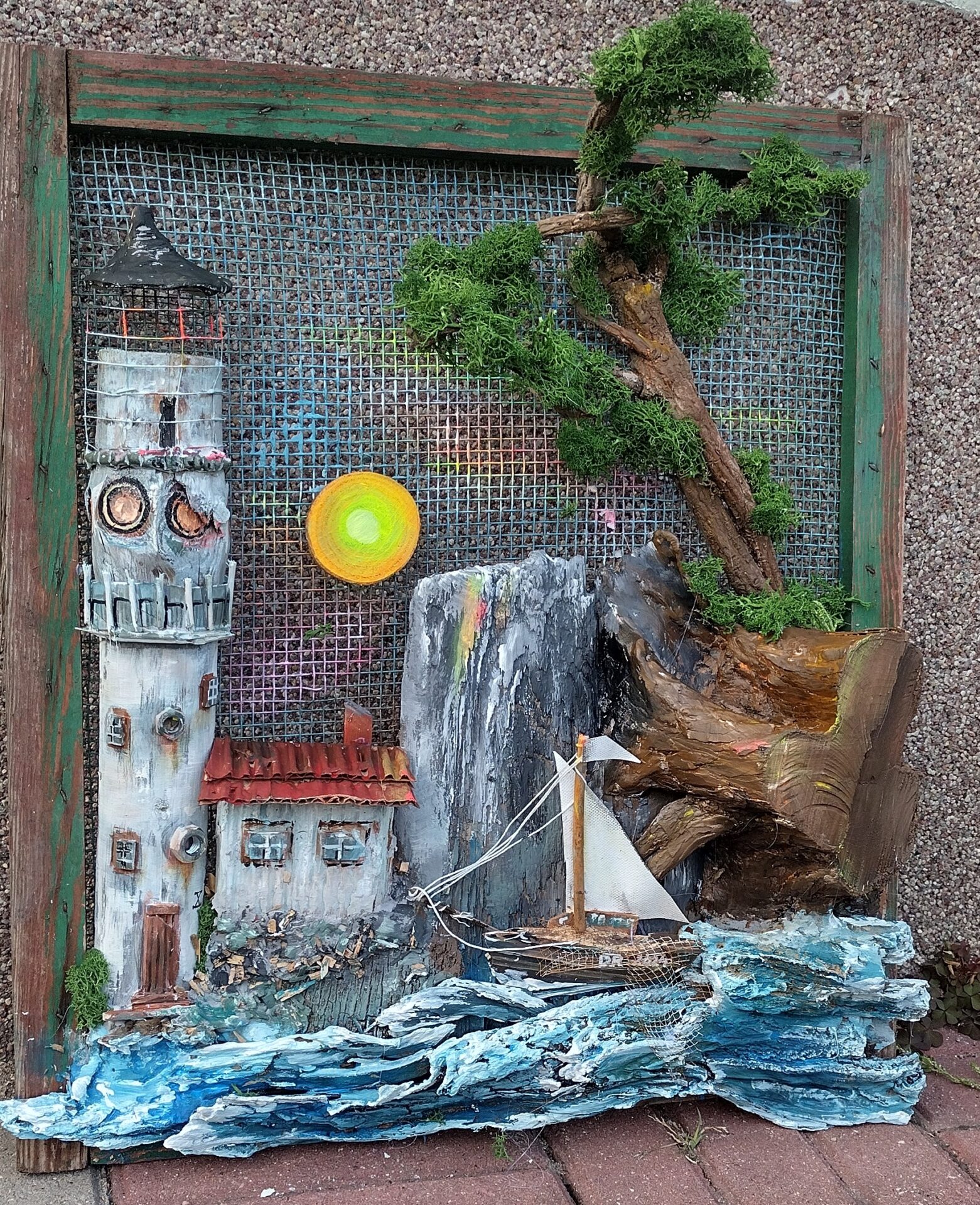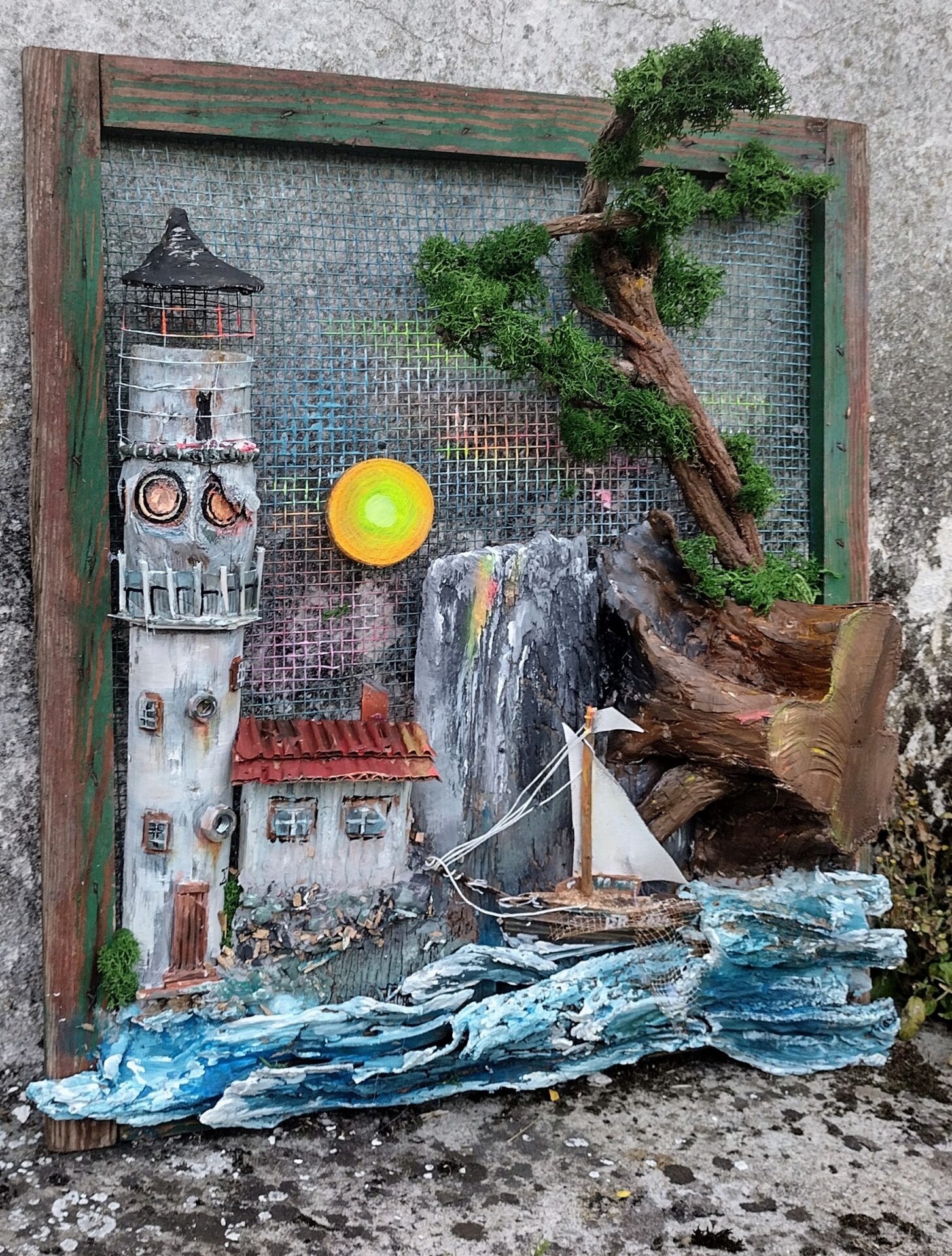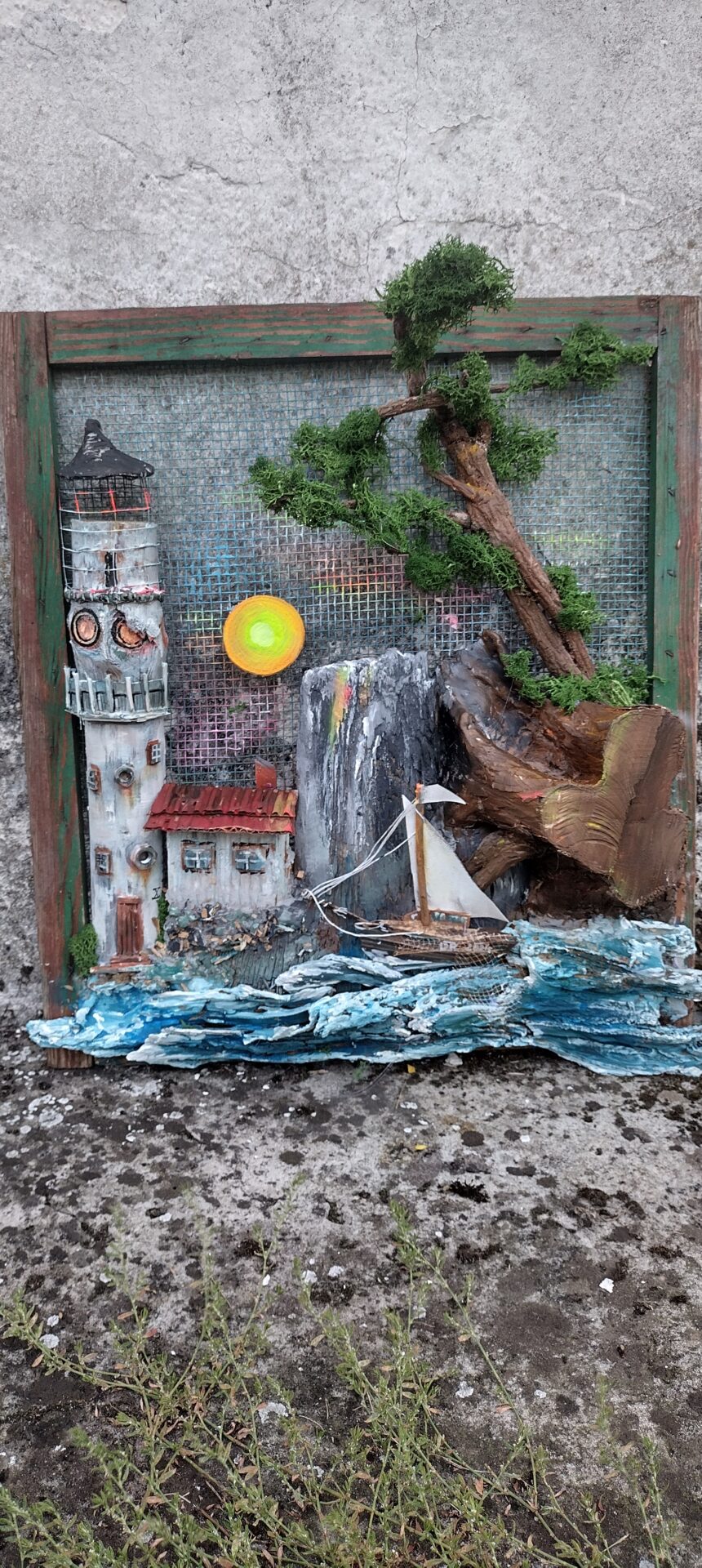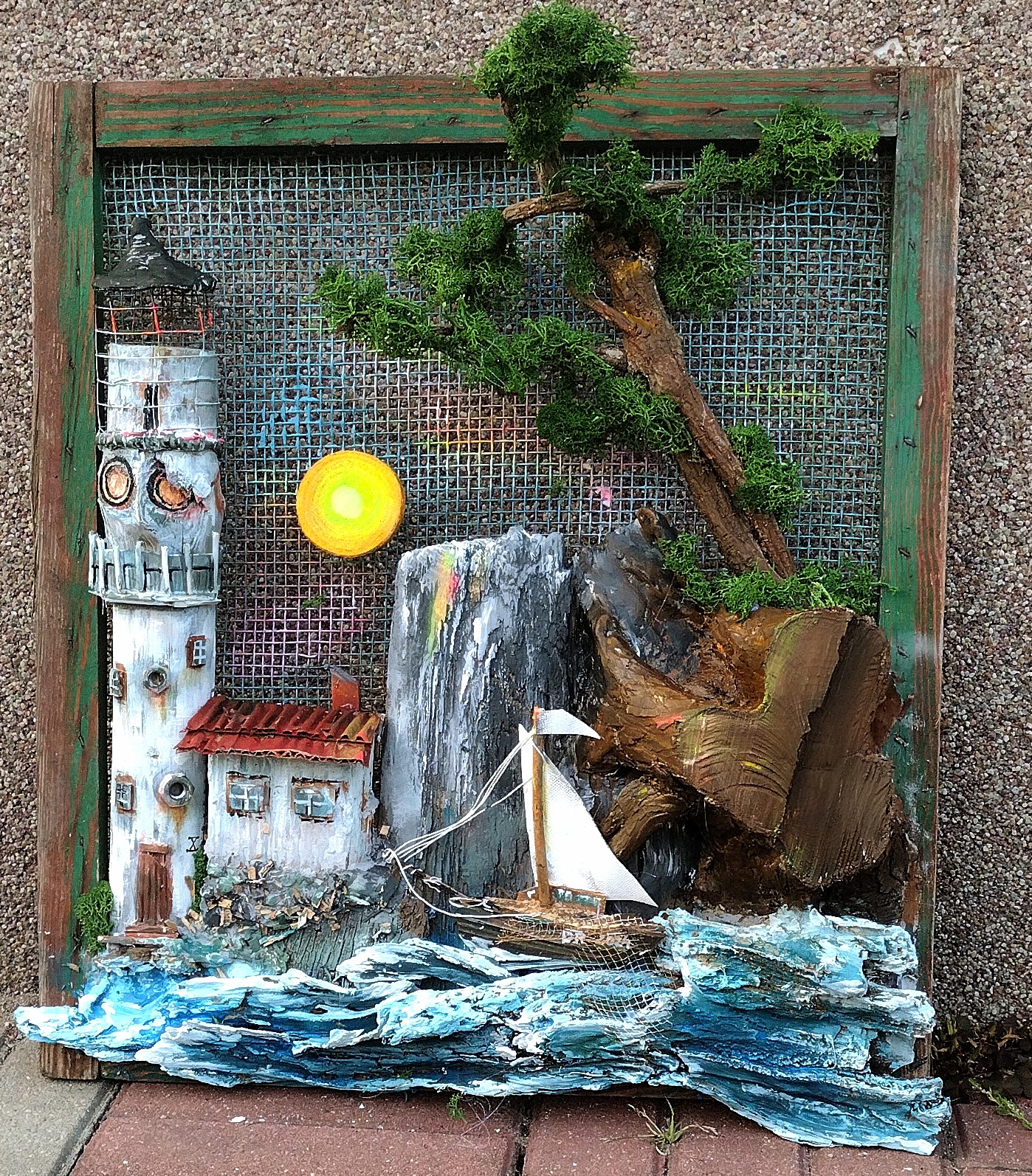 Przedstawiam rękodzielniczy obraz wykonany z naturalnych surowców przedstawiający Latarnie morską o zachodzie słońca.