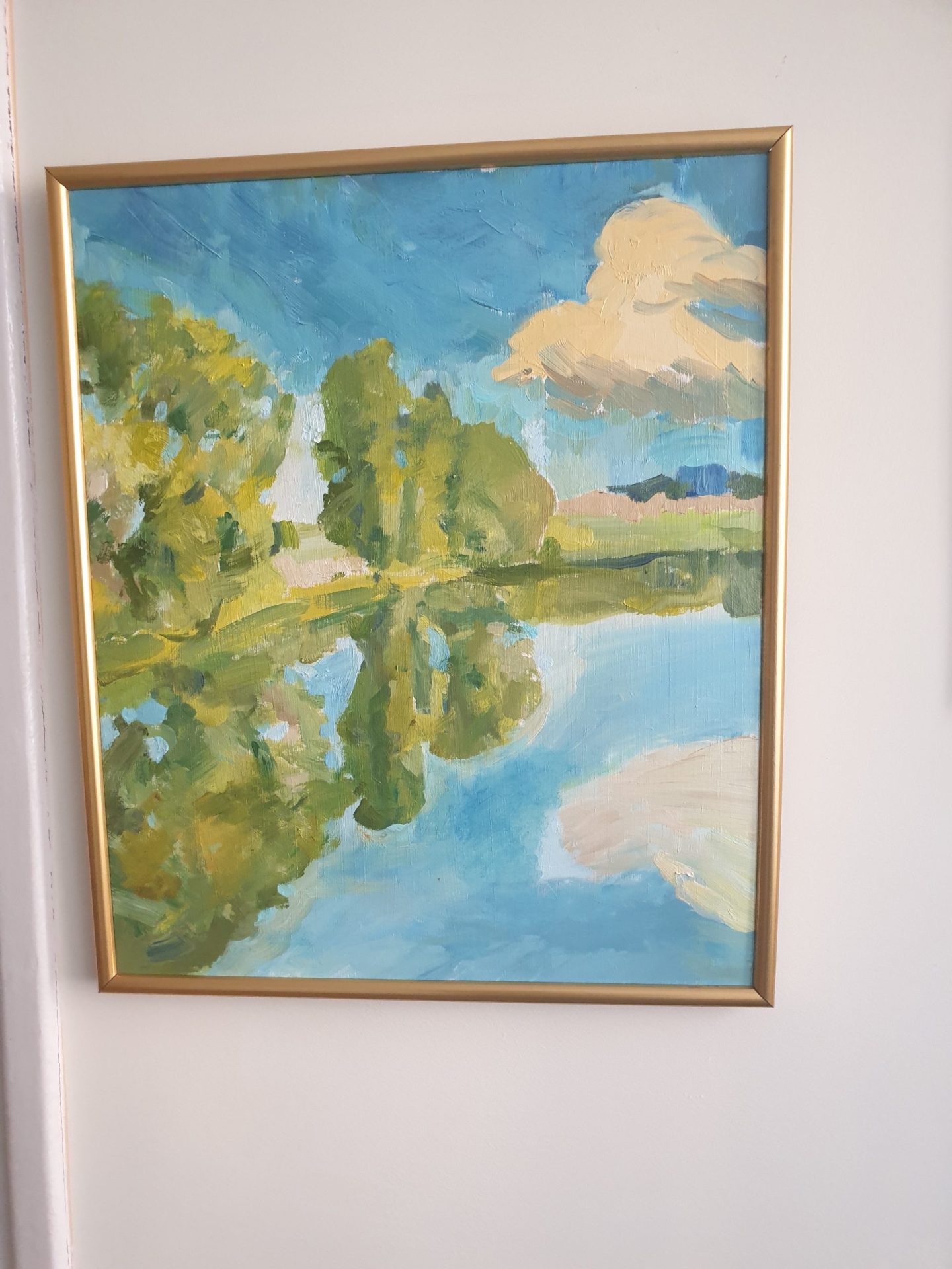 Pogodnyi piekny oprawiony obraz z serii przedstawiającej cztery pory roku, namalowany w jasnych tonacjach błękitu nieba i zielonych drzew odbijających się w tafli pięknego stawu w pobliżu miejscowości Gorki Wielkie na Śląsku Cieszyńskim.
