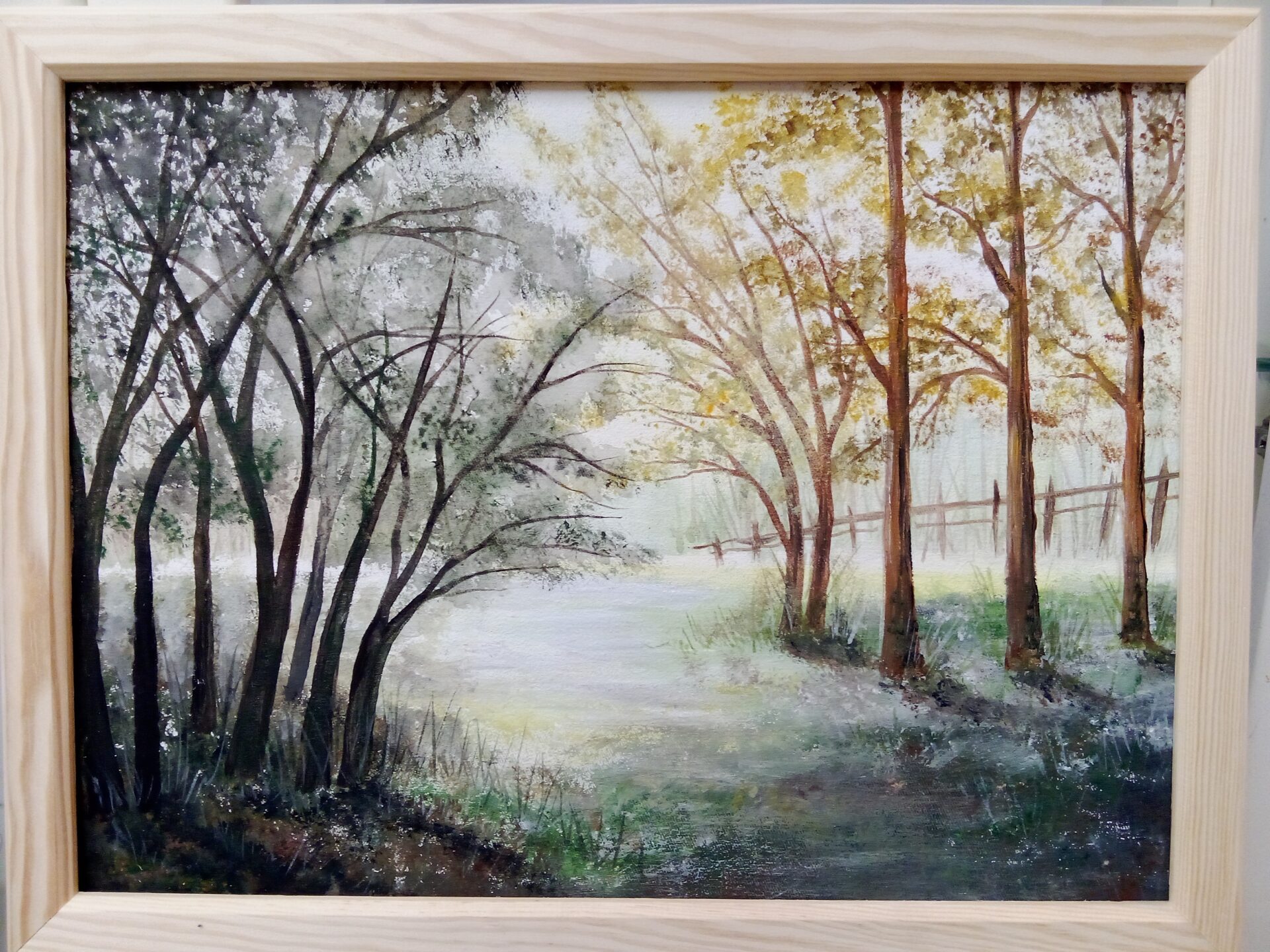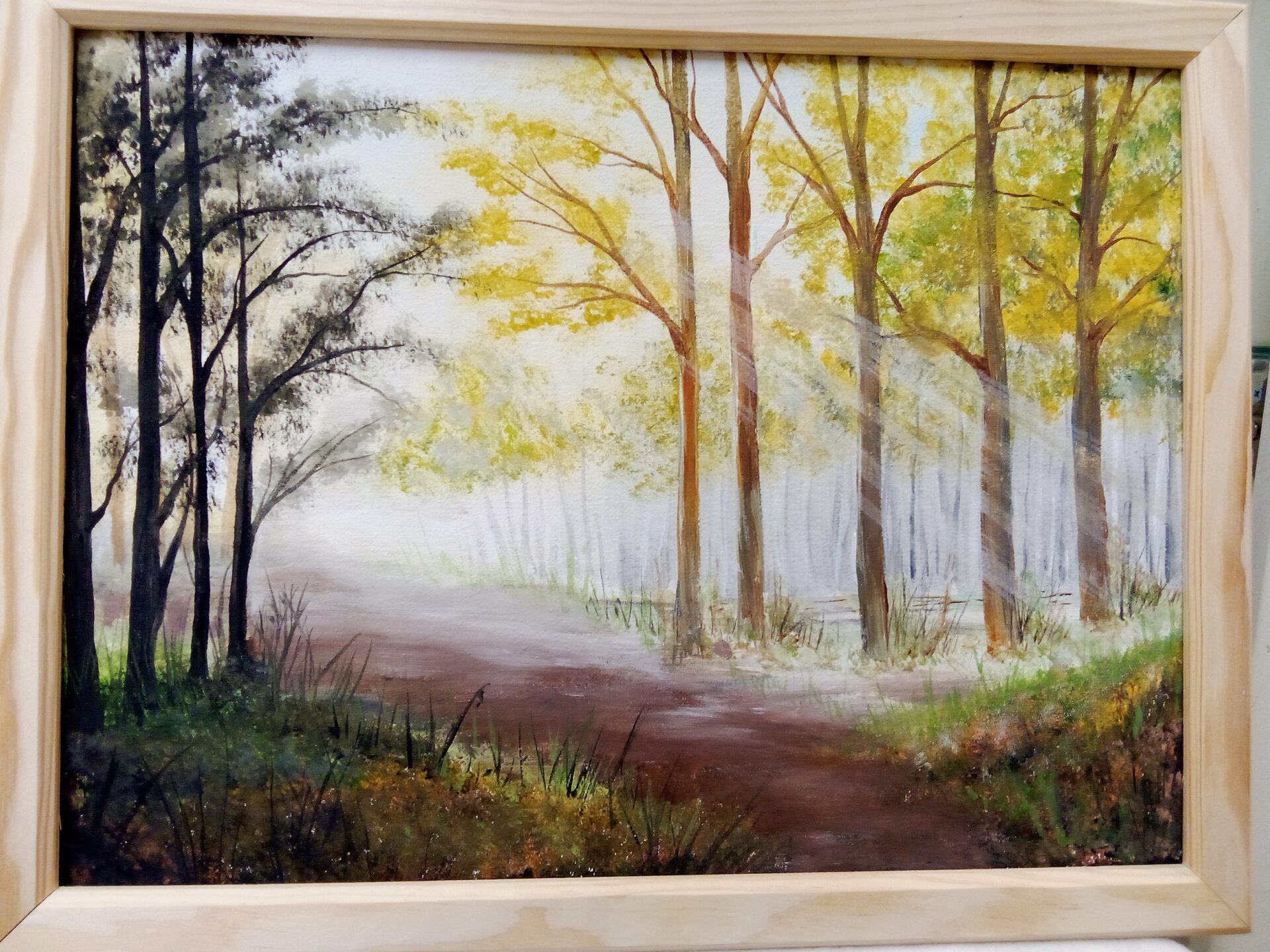 Leśne ścieżki- dyptyk akrylowy na płycie malarskiej. Łączne wymiary zestawu : 40 x 60 cm. Obraz oprawione w naturalną, drewnianą, wąską ramę.