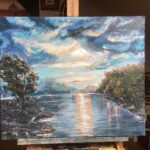 Pejzaż z motywem wody. Dominujące barwy to ciepłe ,stonowane odcienie ultramaryny ,błękitu, urozmaicone kontrastujacymi barwami pomarańczu, żółcieni i beżu na chmurach podświetlanych przez promienie chylącego się ku zachodowi słońca.Każdy zachód słońca jest magicznym przeżyciem, tworzy bowiem na niebie niepowtarzalne obrazy. Ktoś kiedyś powiedział:” ten ,kto nie dostrzega wokół nas, tak naprawdę nie żyje. ”